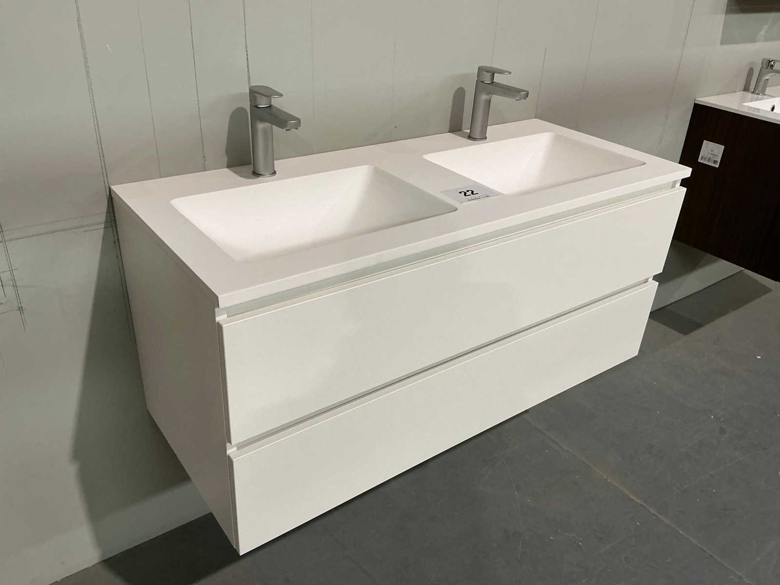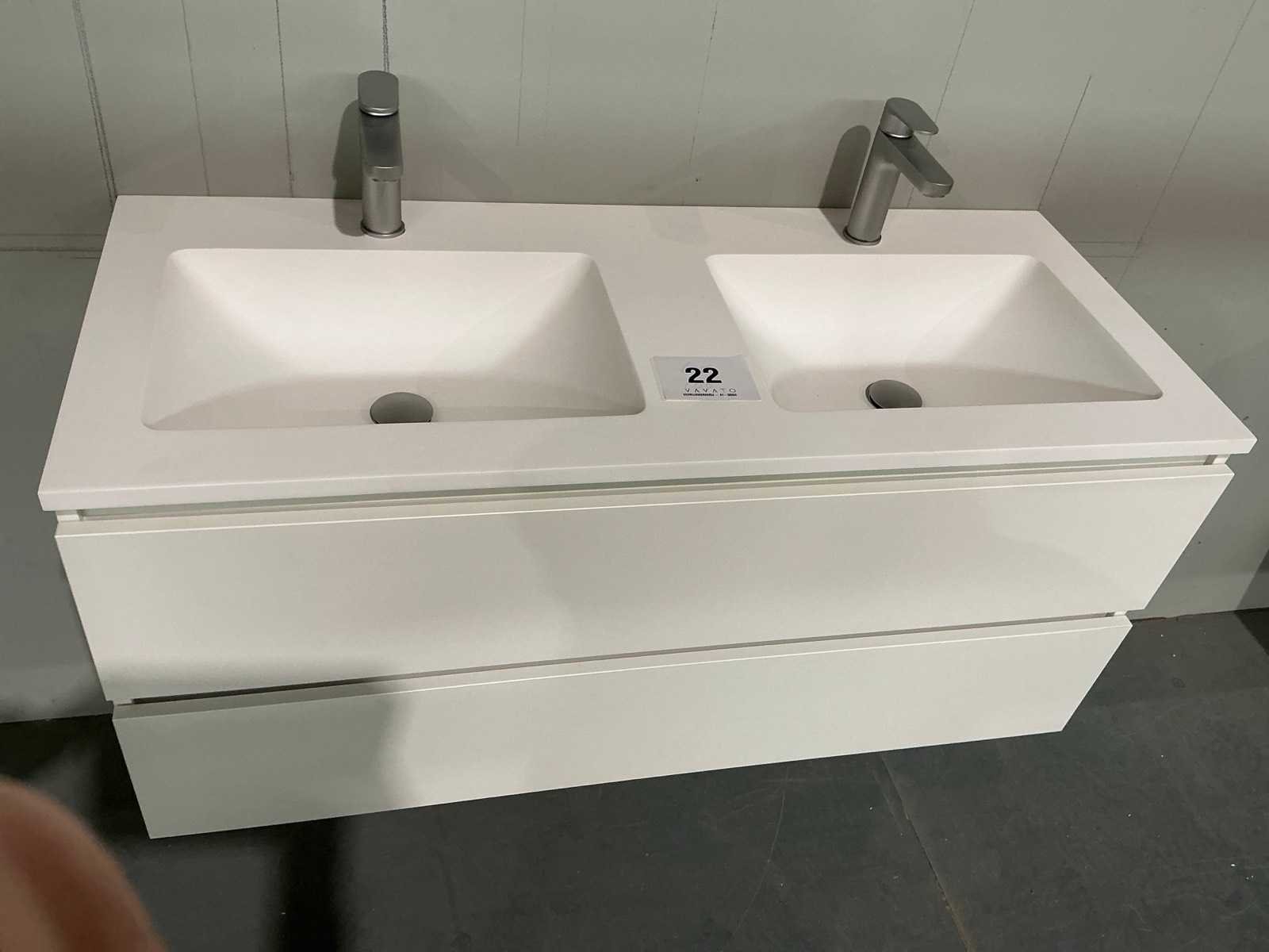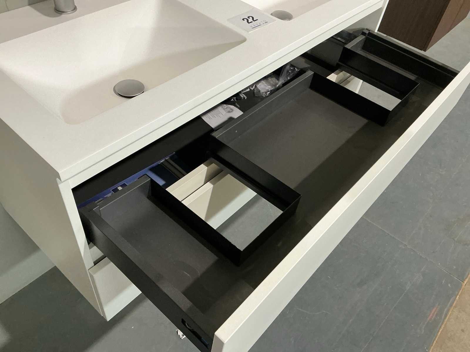 Voorzien van 2x schuiflade en dubbele wastafel. Compleet met kraanwerk Ideal Standard en spiegel met afmetingen ca. 120 x 60cm. Door koper te demonteren van omgeving. Nee Lengte: 120cm Breedte: 50cm Hoogte: 54cm