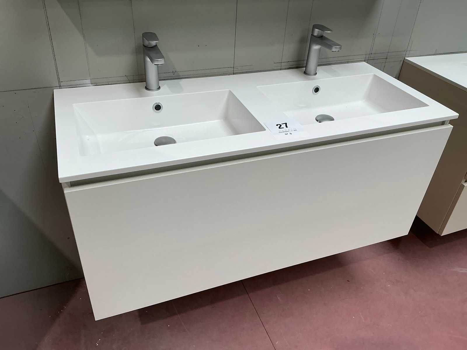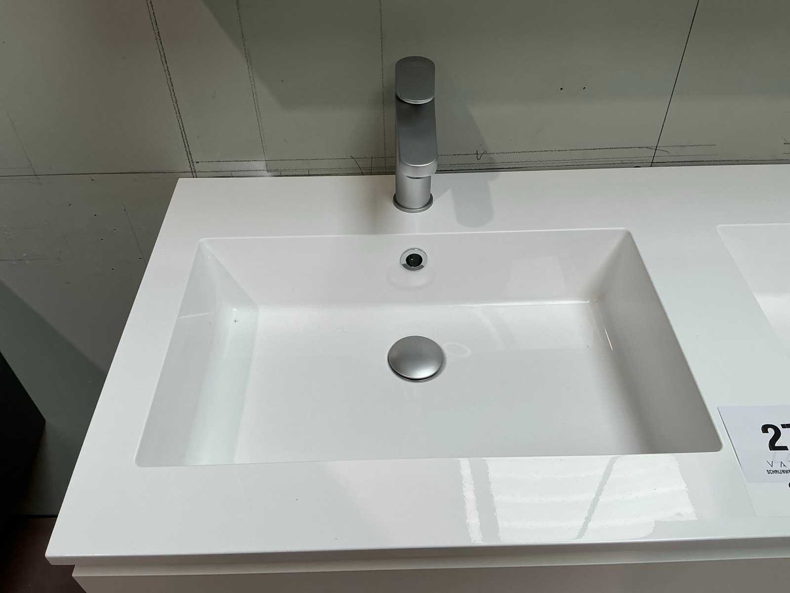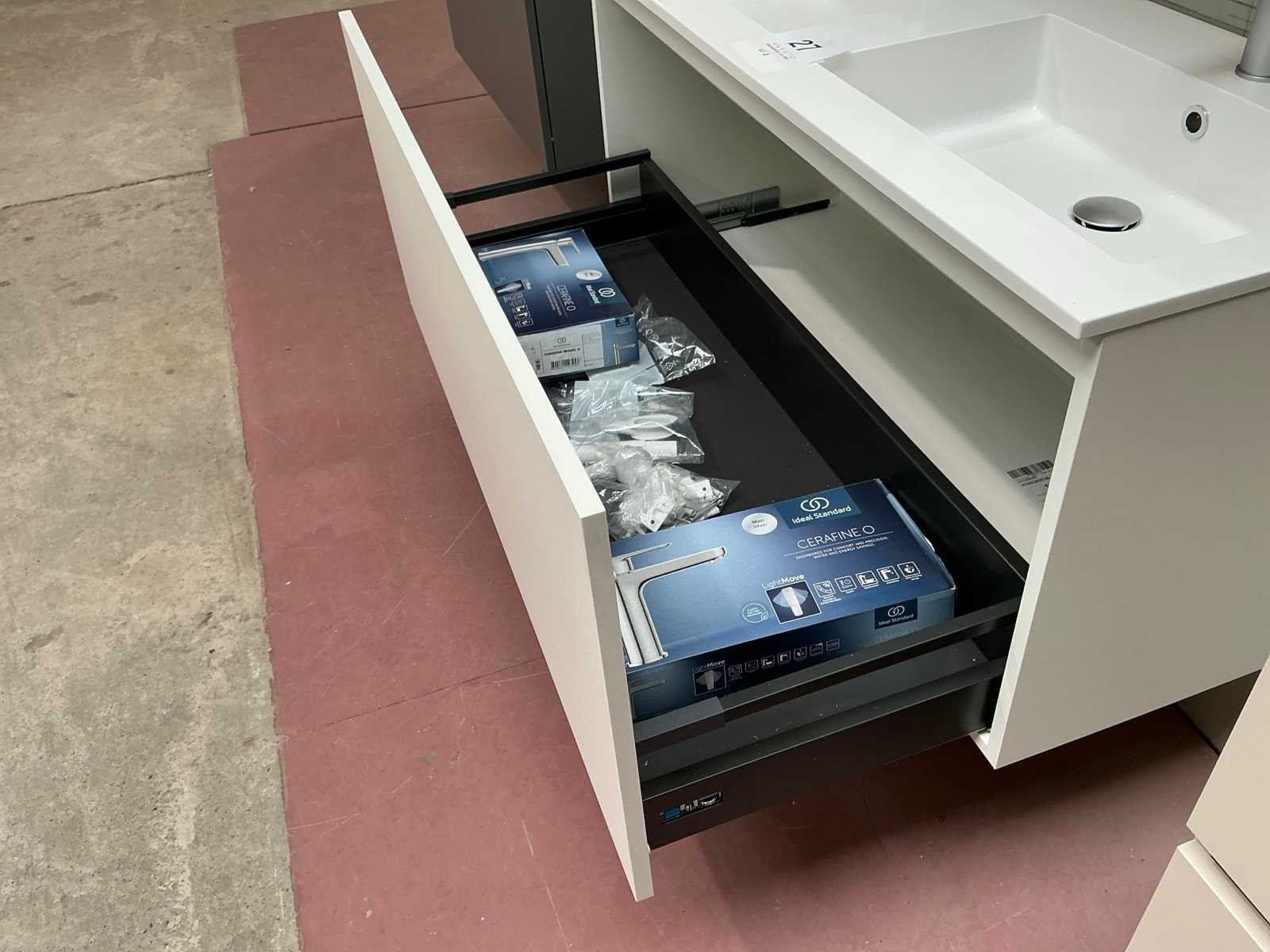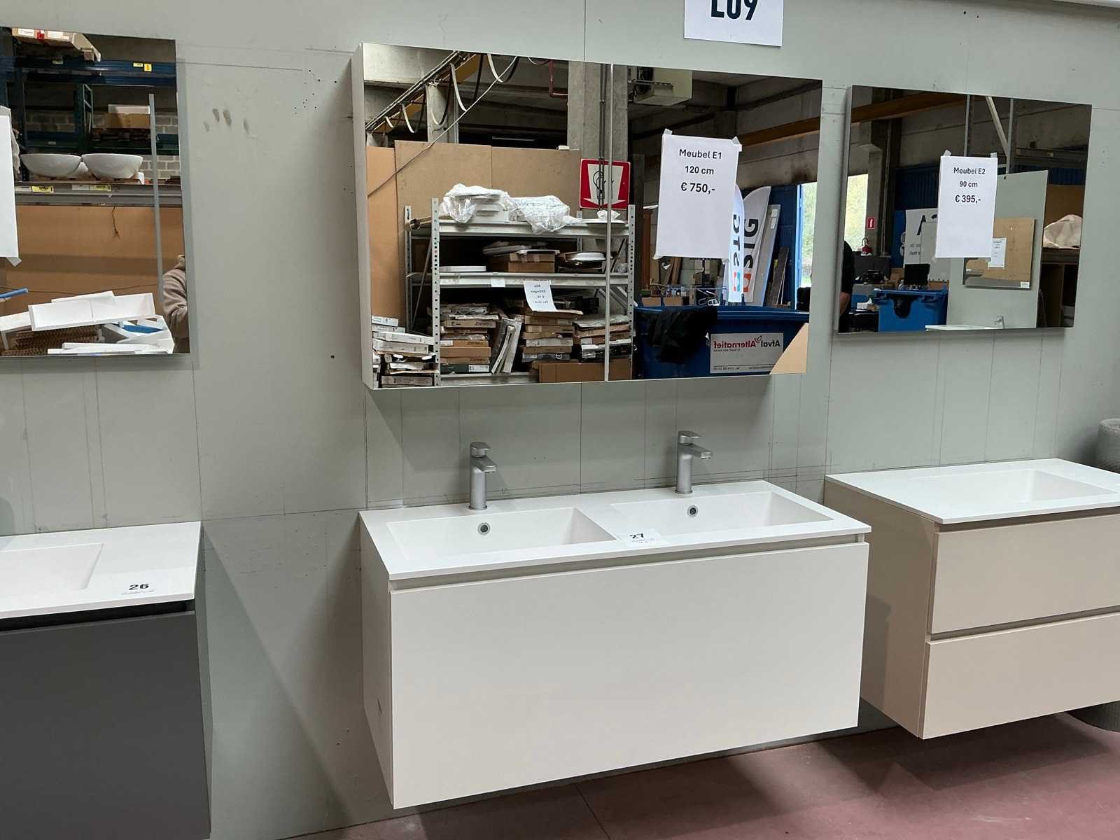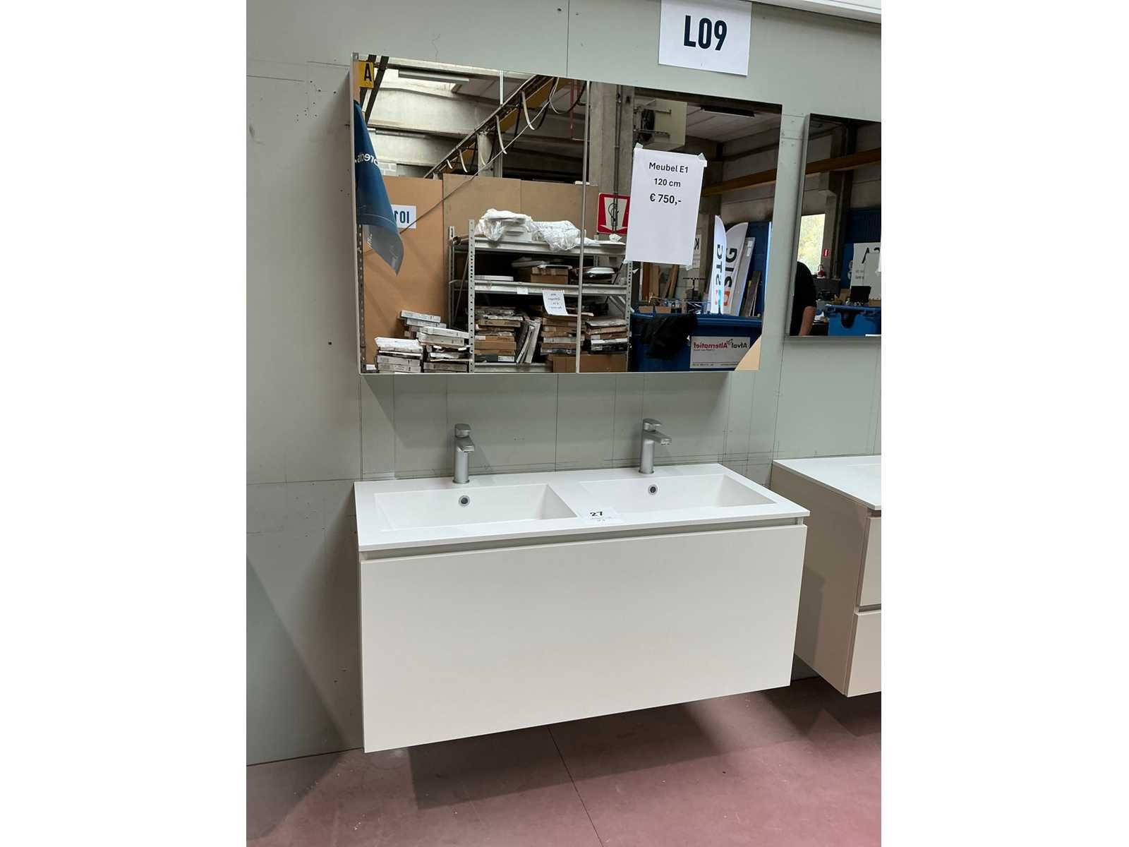 Voorzien van 1x schuiflade en dubbele wastafel. Compleet met kraanwerk Ideal Standard en spiegelkast voorzien van 2x kastdeur met afmetingen ca. 120 x 77x 17cm. Door koper te demonteren van omgeving. Nee Lengte: 120cm Breedte: 50cm Hoogte: 53cm