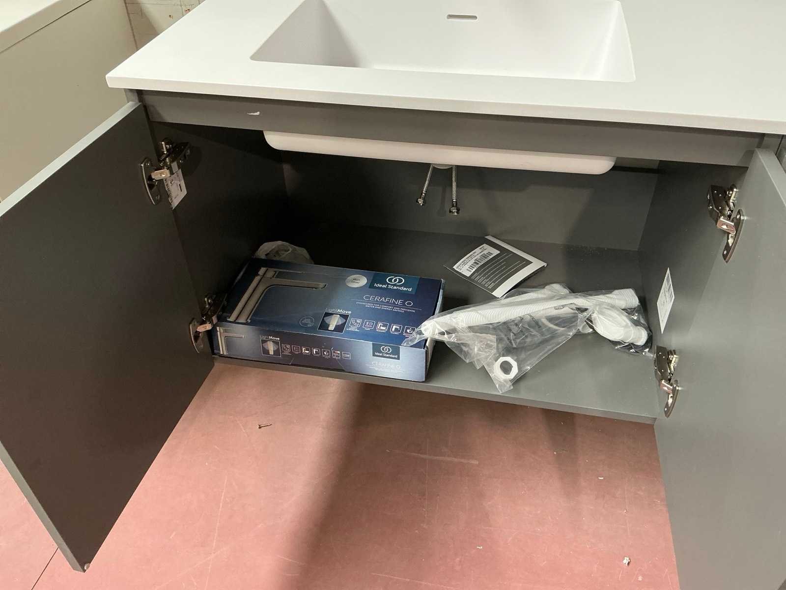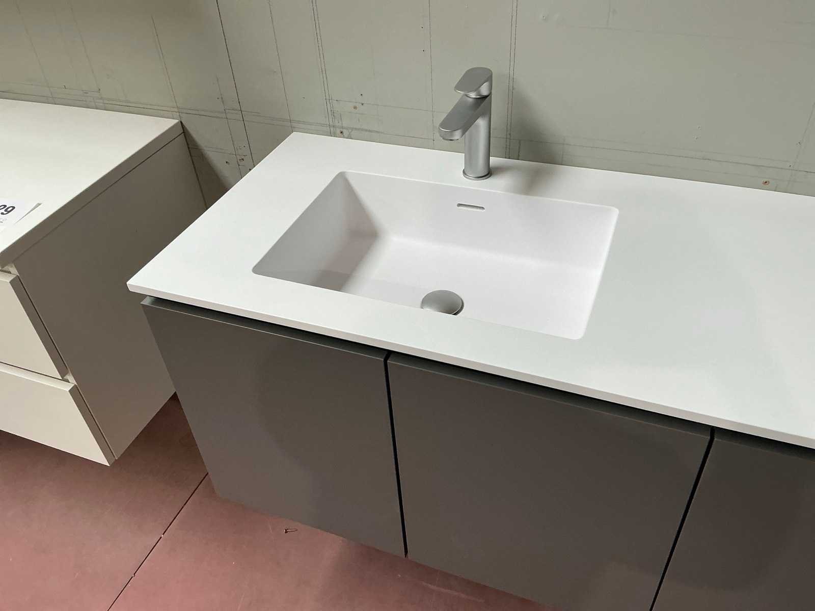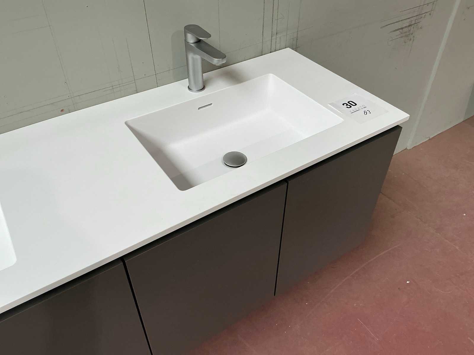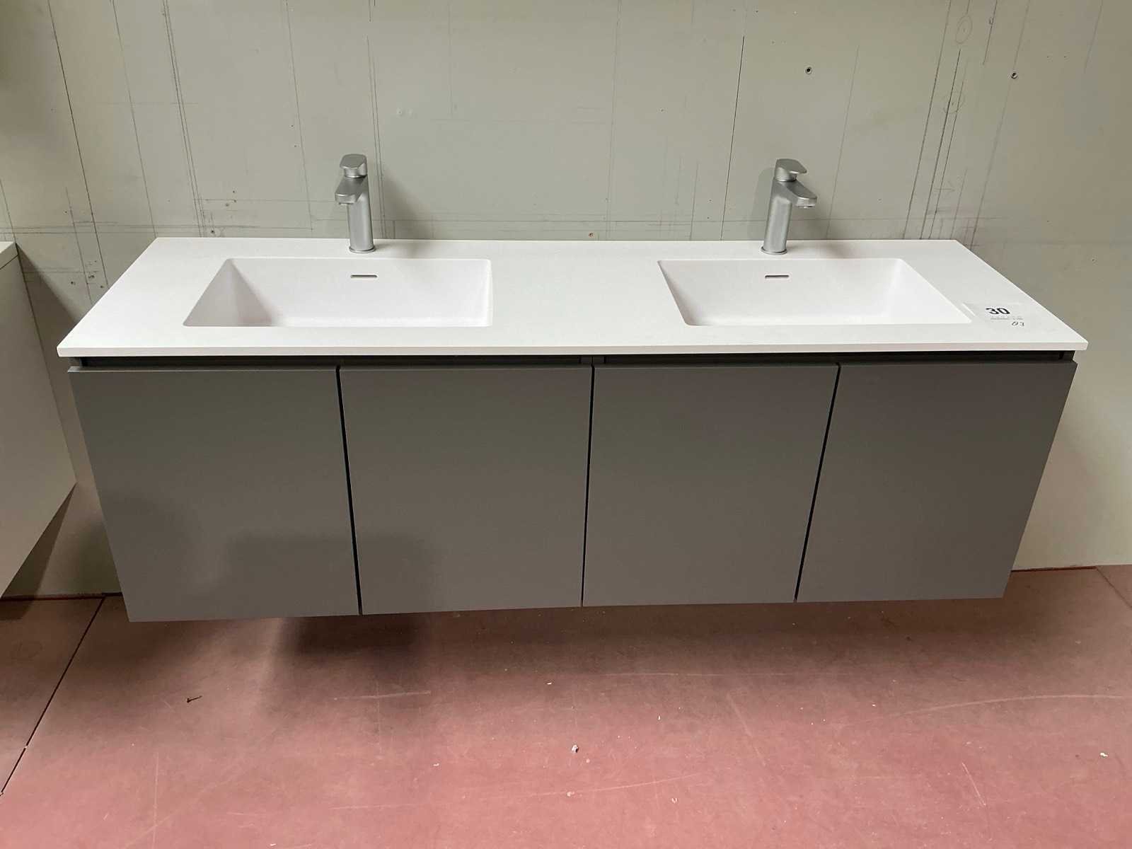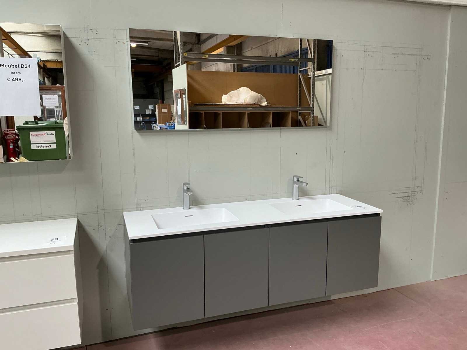 Voorzien van 4x kastdeur en dubbele wastafel. Compleet met kraanwerk Ideal Standard en spiegel met afmetingen 140 x 60cm. Door koper te demonteren van omgeving. Nee Lengte: 160cm Breedte: 51cm Hoogte: 54cm