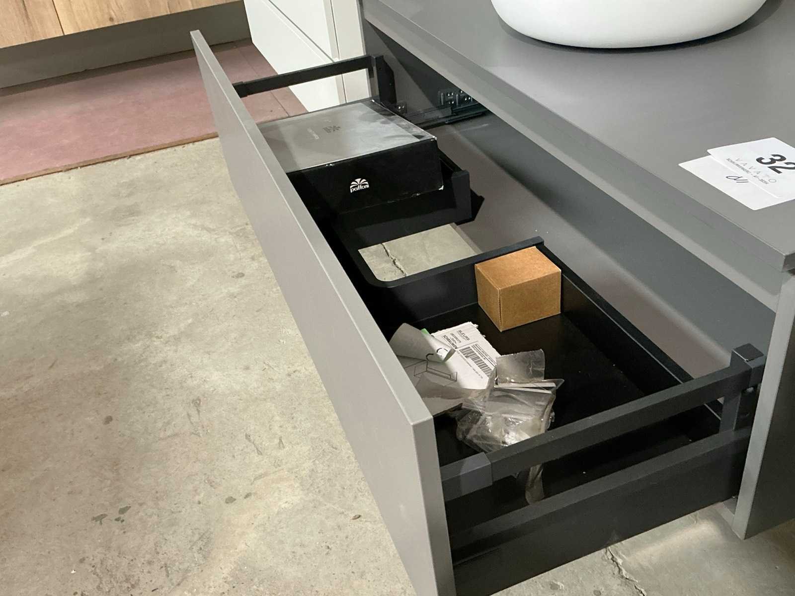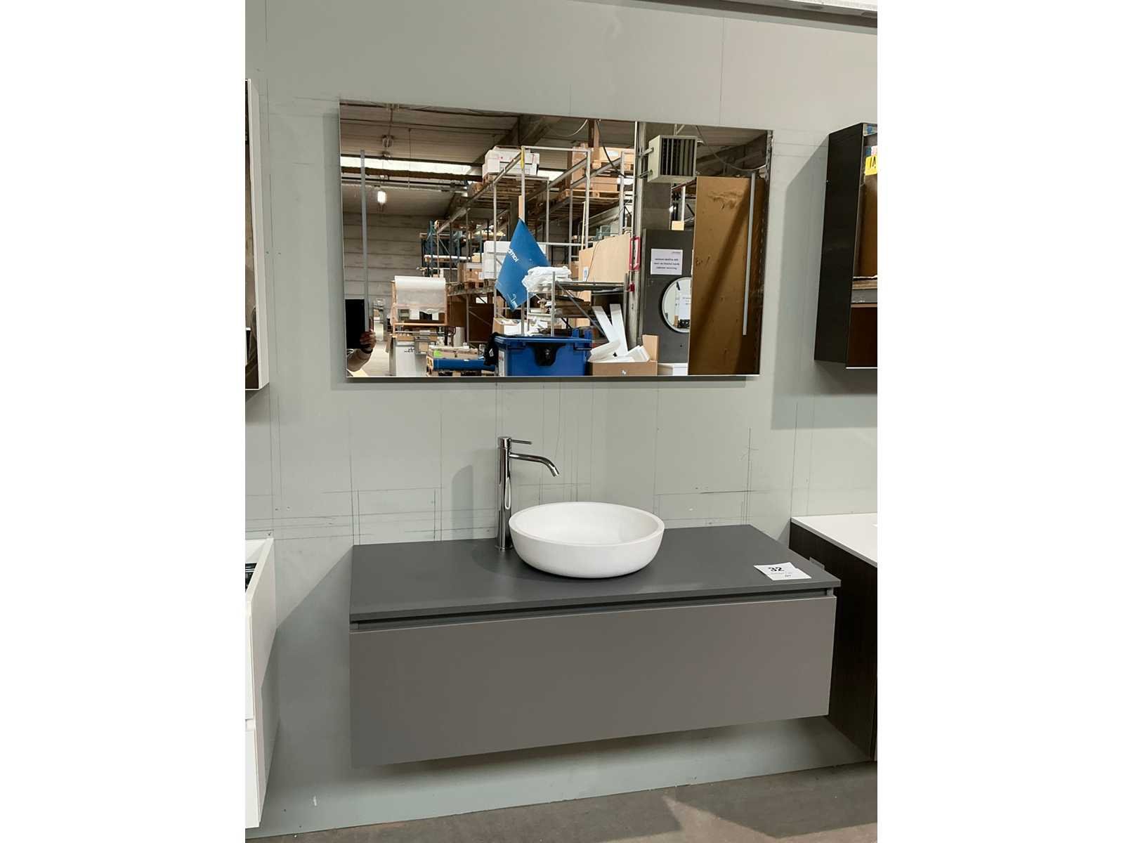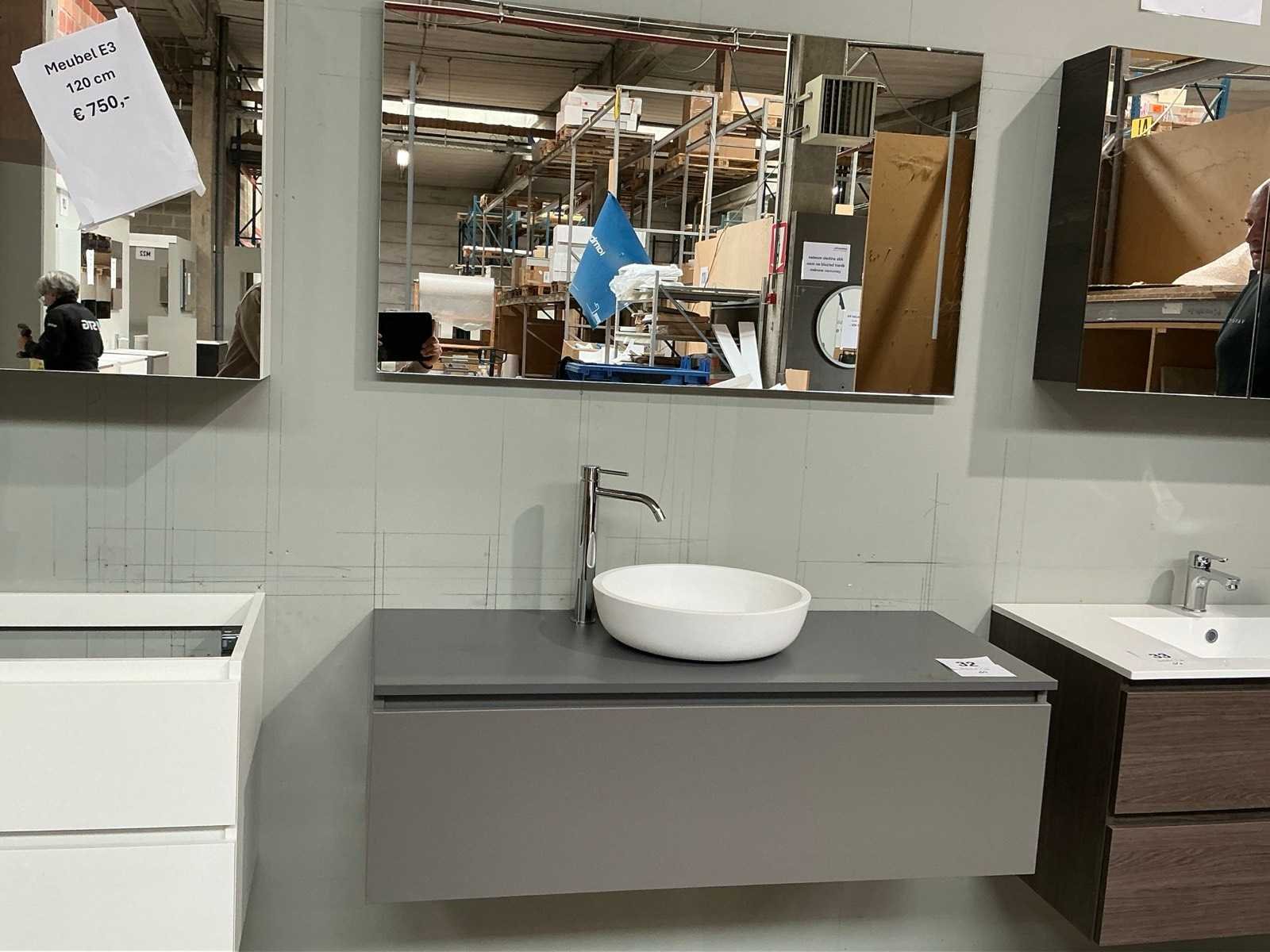 Voorzien van 1x schuiflade. Compleet met opbouw waskom, kraanwerk Paffoni en spiegel met afmetingen ca. 120 x 70cm. Door koper te demonteren van omgeving. Nee Merk: Sleurs Lengte: 120cm Breedte: 50cm Hoogte: 37cm