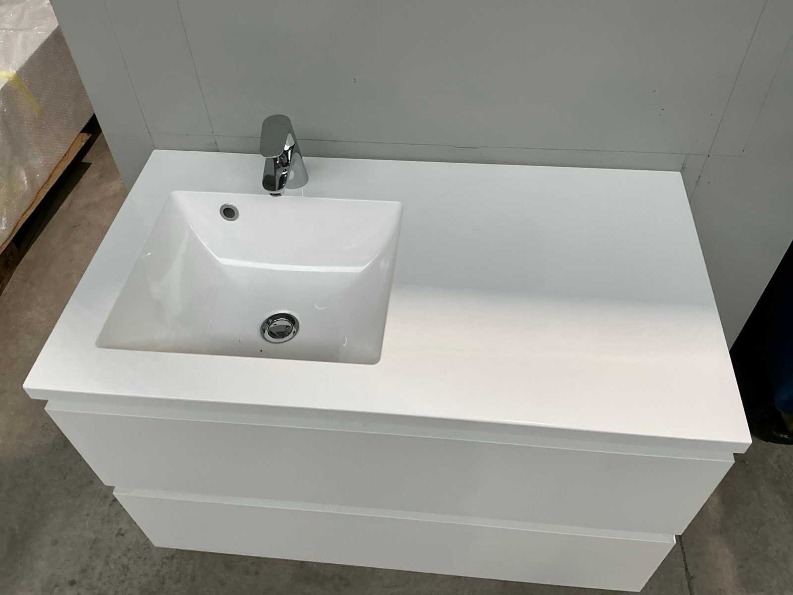 Voorzien van 2x schuiflade en enkele wastafel. Compleet met kraanwerk Hans grohe en spiegel met afmetingen ca. 90 x 70cm. Door koper te demonteren van omgeving. No Merk: Vika Lengte: 90cm Breedte: 50cm Hoogte: 54cm