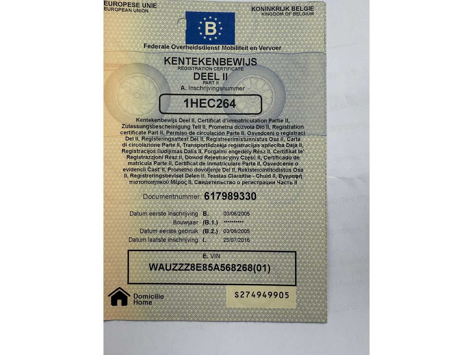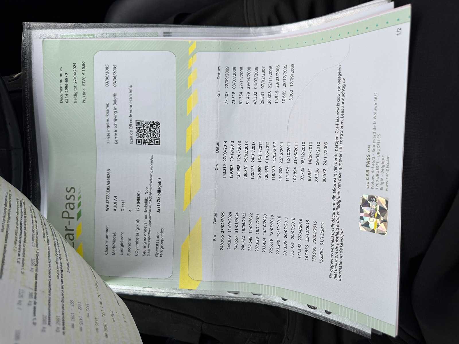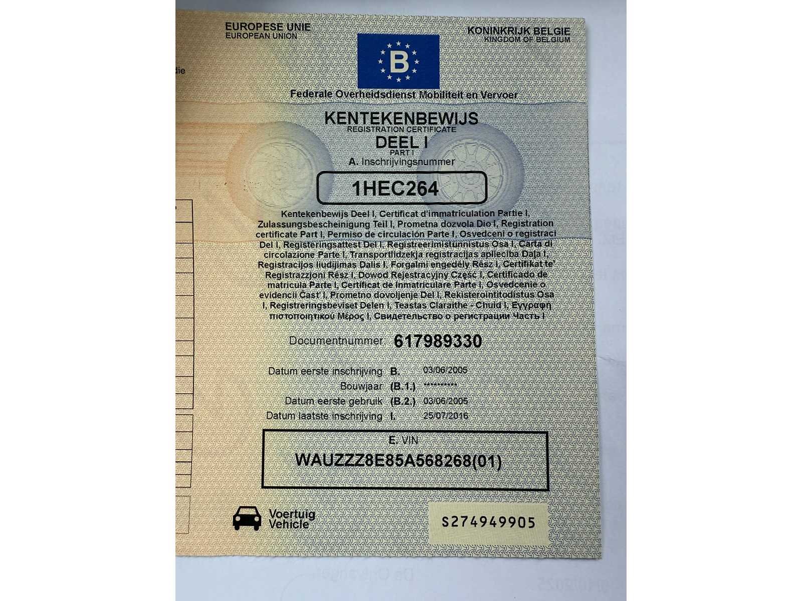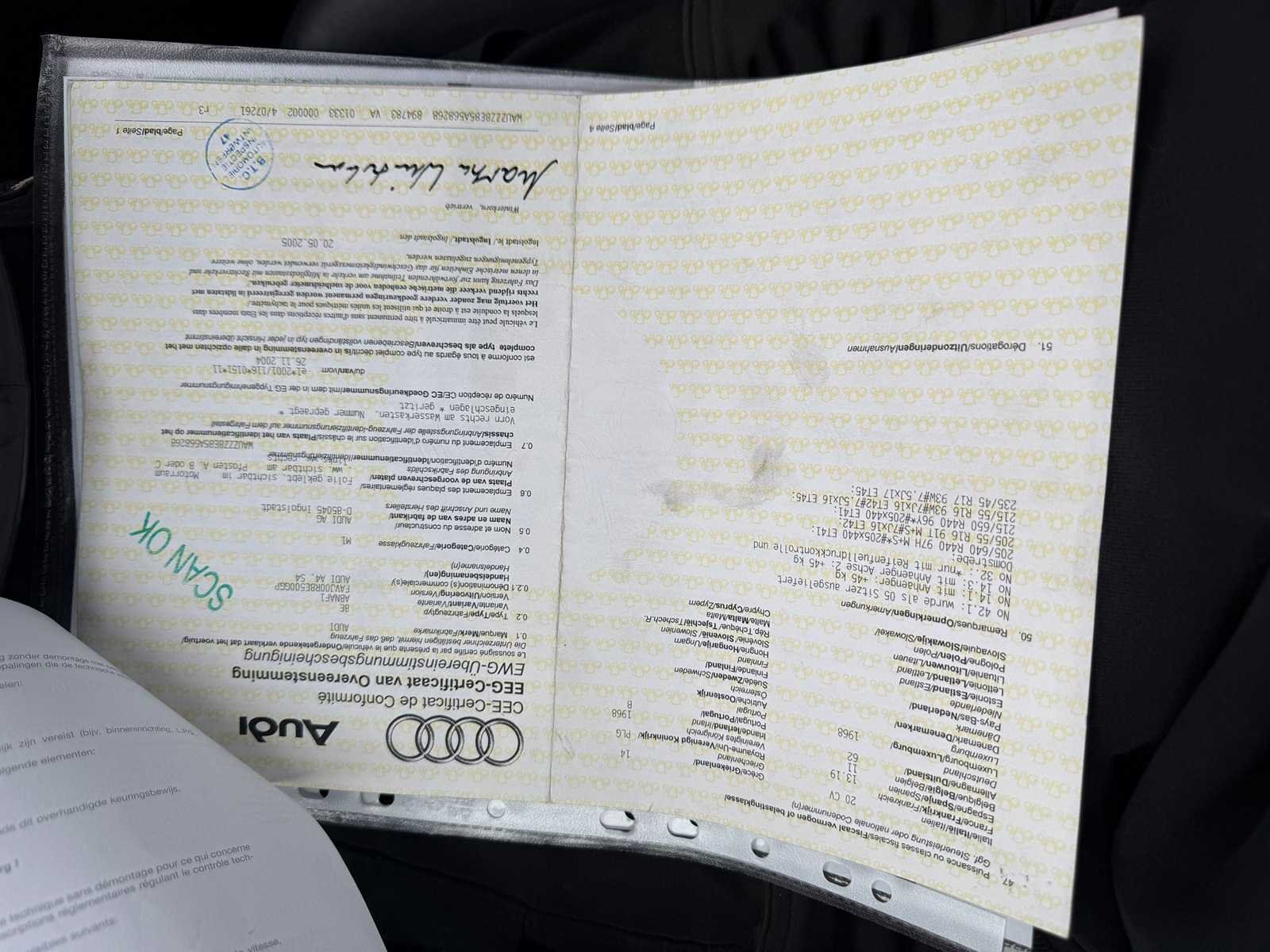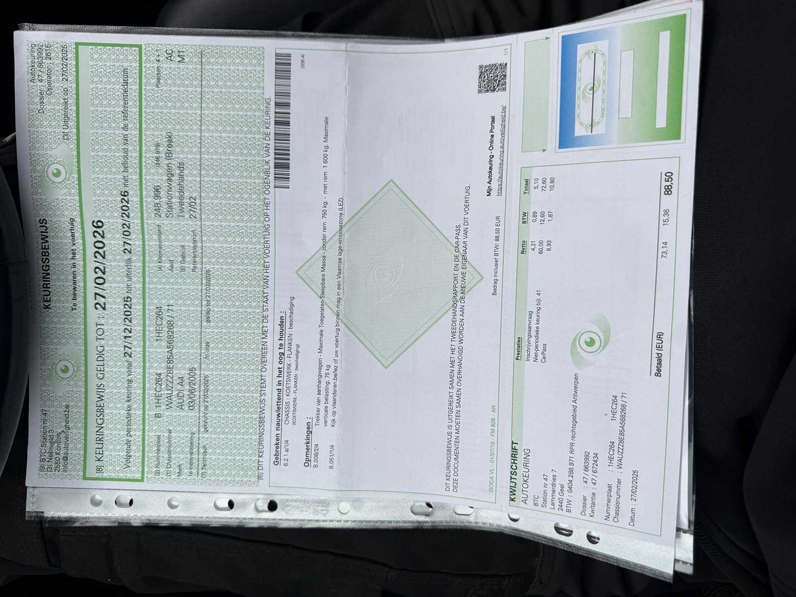 ALLE PAPIEREN AANWEZIG START EN RIJD AUTOMAAT Nee Merk: AUDI Model: A4 Bouwjaar: 2005 Cilinderinhoud: 1998cc Vermogen (kW): 100kW Brandstof: DIESEL Chassisnummer: WAUZZZ8E85A568268 Datum eerste toelating: 03-06-2005 Aantal zitplaatsen: 5 Kleur: GRIJS Transmissie: AUTOMAAT Emissieklasse: 4 Aantal sleutels: 1 Nationaliteit documenten: BELGIE Gelijkvormigheidsattest aanwezig: true Carpass: true Start en rijdt: JA Keuringsrapport geldig tot: 27-02-2026 Andere boorddocumenten: COMPLEET startinformatie : JA Inschrijvingsbewijs - deel 1 : AANWEZIG Inschrijvingsbewijs - deel 2: AANWEZIG