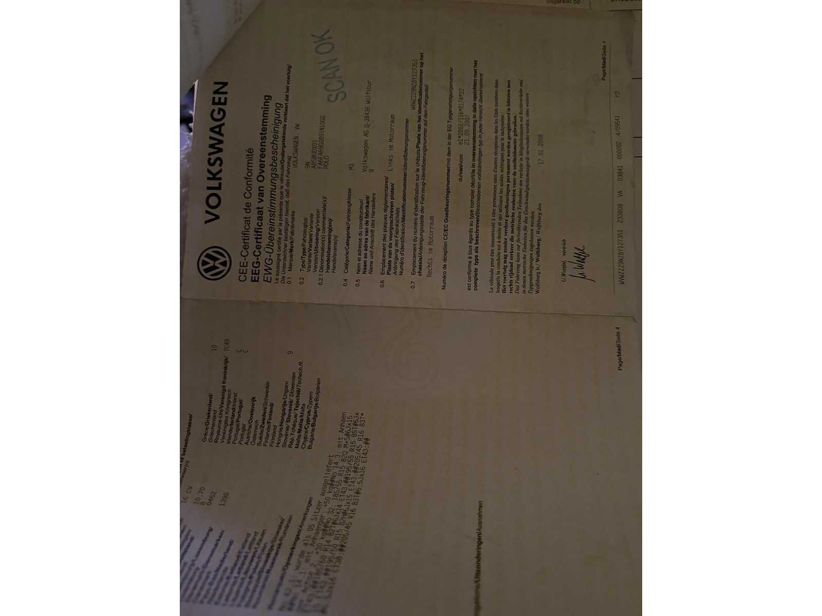 LICHTE ONGEVAL SCHADE WAGEN START EN RIJD 1 STE EIGENAAR MET ONDERHOUDSBOEK EN 2 SLEUTELS Nee Merk: VOLKSWAGEN Model: POLO Bouwjaar: 2008 Afgelezen kilometerstand: 125890km Cilinderinhoud: 1390cc Vermogen (kW): 59kW Brandstof: BENZINE Chassisnummer: WVWZZZ9NZ8Y127351 Datum eerste toelating: 25-01-2008 Aantal zitplaatsen: 5 Kleur: GRIJS Transmissie: AUTOMAAT Emissieklasse: 4 Aantal deuren: 5 Aantal sleutels: 2 Nationaliteit documenten: BELGIE Gelijkvormigheidsattest aanwezig: true Carpass: true Start en rijdt: JA Keuringsrapport geldig tot: 25-01-2026 Andere boorddocumenten: COMPLEET startinformatie : JA Zichtbare schade: ZIE FOTO Inschrijvingsbewijs - deel 1 : AANWEZIG Inschrijvingsbewijs - deel 2: AANWEZIG