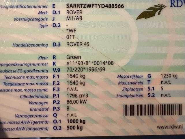 Nederlandse auto die overgeschreven moet worden of op export koper accu is leeg staat tijd stil start niet Nee Kenteken: 47fjvn Merk: Rover Model: 45 Type: 1.8 Club Bouwjaar: 2000 Cilinderinhoud: 1796cc Vermogen (kW): 86kW Laadvermogen: 0kg Datum eerste toelating: 2000-04-07 Datum eerste toelating (NL): 2000-04-07 APK vervaldatum: 2024-12-15 Vermogen (pk): 117hp Aandrijving: FWD Aantal zitplaatsen: 5 Maximaal trekgewicht ongeremd: 500kg Maximaal trekgewicht geremd: 1000kg Kleur: groen Transmissie: Handgeschakeld Emissieklasse: 2 Aantal deuren: 4 Ledig gewicht: 1130kg Bruto BPM (NL): 4580€ Rest BPM: 0€ Aantal cilinders: 4 Carrosserie: hatchback CO2-uitstoot NEDC: 172 Carfax Link: https://was.carfax.eu/v0/api/ccdid/5100016408/svc/201/vinreg/47FJVN/checksum/eyJhbGciOiJIUzI1NiIsInR5cCI6IkpXVCJ9.eyJleHAiOjE3NjQwNTc0OTV9.8E6u1_KgJ0VU2lWEx3o2e7Ghf5Ef0ylN8Uo2zDmMubI Start en rijdt: nee Airconditioning: true
