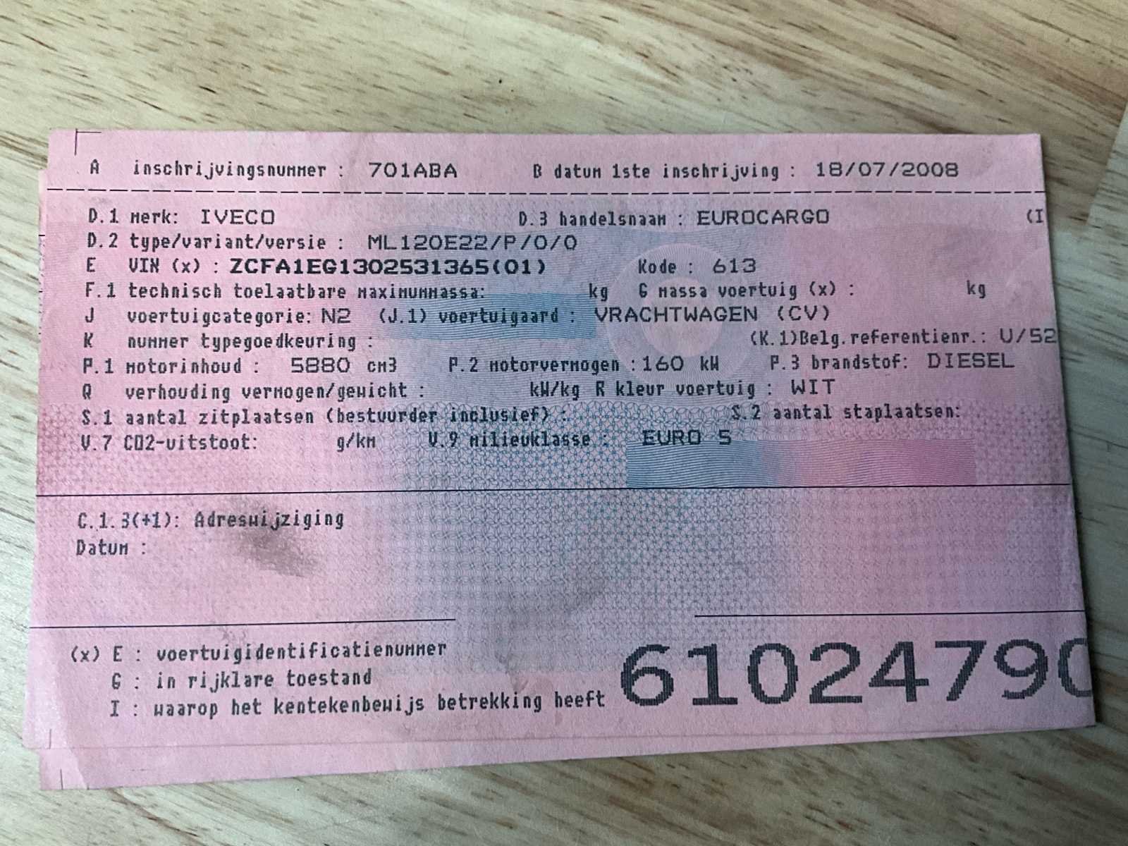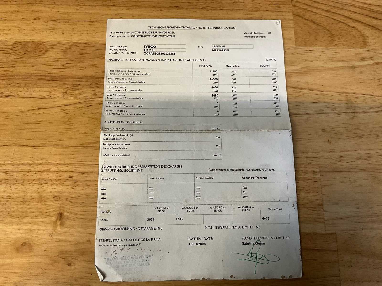 Uitrusting Luchtvering op achteras Luchtremmen Veko schuifzeil (blauw), staal/aluminium frame Hydraulische laadklep Dhollandia Achterdeuren Zonnekap met “Euro 5”-aanduiding Buitenspiegels met dodehoekwaarschuwing Dagcabine met 2 stoelen Radio, stuurbediening Dashboard digitaal met kilometerteller Staat van het voertuig Algemeen: Gebruikte staat, met zichtbare gebruiks- en roestsporen (zie foto’s) Carrosserie: Roestvorming aan achterzijde, lichte schade aan kunststofdelen Cabine: Compleet, bestuurdersstoel gescheurd Interieur: Gebruikssporen zichtbaar Laadklep: Aanwezig, werking niet getest Keuring: Geldig tot 24/07/2025 Opmerkingen keuring: Opmerkingen betreffende banden, chassis-corrosie en vloeistoflekkage (“zweten”) VOERTUIG START, RIJDT EN LAADKLEP WERKT Nee Merk: Iveco Type: Eurocargo 120E22 Bouwjaar: 2008 Chassisnummer VIN: ZCFA1EG1302531365 Cilinderinhoud: 5880cc Kilometerstand bij opname: 787123km Datum eerste toelating: 18/7/2008 Type transmissie: Handmatig Asconfiguratie: 4x2 Fuel Type: Diesel Laadvermogen: 4400kg Emissieklasse: Euro 5 Eigen gewicht: 7570kg Totale afmeting L: 10760mm Totale afmeting Breedte: 2450mm Totale afmeting Hoogte: 3200mm Nationaliteit documenten: B Kentekenpapieren compleet?: true Handgeschakelde versnellingsbak: true Diesel: true