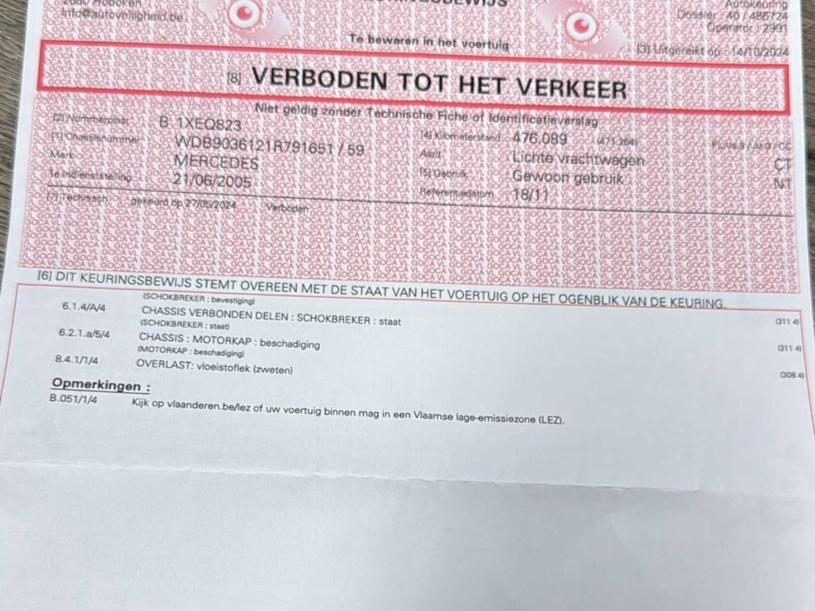 Mercedes-Benz Sprinter 313 CDI uit 2005 met gesloten boxopbouw en werkende Dhollandia laadklep (1000 kg). Laadruimte (LxBxH) 345×195×215 cm. Voertuig heeft ongevalschade vooraan maar start en rijdt (met booster). Meerdere gebreken en roest aanwezig. Laatste keuring: afgekeurd/verboden tot het verkeer. Pluspunten: Start & rijdt (met booster) Werkende Dhollandia laadklep van 1000 kg Ruime laadbak: 345×195×215 cm → geschikt voor transport, koeriers, food, materialen Degelijke Mercedes CDI-motor (OM646-type, lange levensduur) Documenten volledig aanwezig No Merk: Mercedes-Benz Model: Sprinter Type: - laadklep Bouwjaar: 2005 Afgelezen kilometerstand: 476544km Cilinderinhoud: 2148cc Vermogen (kW): 95kW Brandstof: diesel Chassisnummer: WDB9036121R791651 Laadvermogen: 1240kg Datum eerste toelating: 21/6/2005 Aantal zitplaatsen: 3 Kleur: wit Transmissie: manueel Emissieklasse: Euro 3 Ledig gewicht: 2260kg Nationaliteit documenten: B Gelijkvormigheidsattest aanwezig: true Start en rijdt: ja Zichtbare schade: ja Vavato voert geen technische keuring uit.: true Inschrijvingsbewijs - deel 1 : aanwezig Inschrijvingsbewijs - deel 2: aanwezig