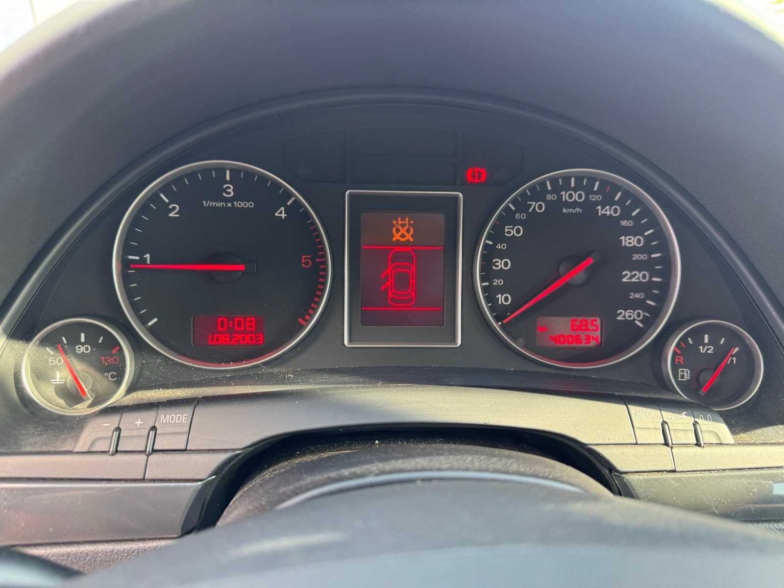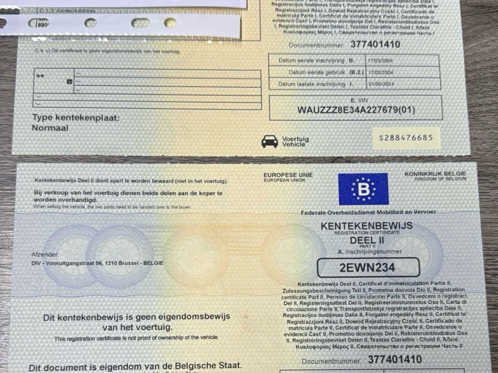 Audi A4 Avant 1.9 TDI (74 kW – 1896 cc) uit 2004. Euro 3. Start en rijdt, maar batterij zwak → starten met booster. Airco, elektrische spiegels, JVC-radio, nette stoffen zetels. Goed onderhouden motorruimte. Met trekhaak. Exterieur: Koetswerk in goede staat voor leeftijd Lichte gebruikssporen naar leeftijd (krassen, matte plekken) Dakrails Velgen in normale staat Achterruit en zijruiten donker getint Interieur: Stofzetels in goede en nette staat Dubbele digitale klimaatregeling (airco) → zichtbaar werkend op 17,5 °C ESP-knop aanwezig Aftermarket JVC-radio met Bluetooth Geen grote slijtage aan het dashboard Interieurpanelen en vloeren proper Elektrische spiegels met verwarmingsstand Elektrische ramen vooraan No Merk: Audi Model: A4 Avant Type: stationwagen Bouwjaar: 2004 Afgelezen kilometerstand: 400634km Cilinderinhoud: 1896cc Vermogen (kW): 74kW Brandstof: diesel Chassisnummer: WAUZZZ8E34A227679 Datum eerste toelating: 17/3/2004 Aantal zitplaatsen: 5 Transmissie: manueel Emissieklasse: Euro 3 Ledig gewicht: 1565kg Nationaliteit documenten: B Start en rijdt: ja Vavato voert geen technische keuring uit.: true Airconditioning: true Inschrijvingsbewijs - deel 1 : aanwezig Inschrijvingsbewijs - deel 2: aanwezig