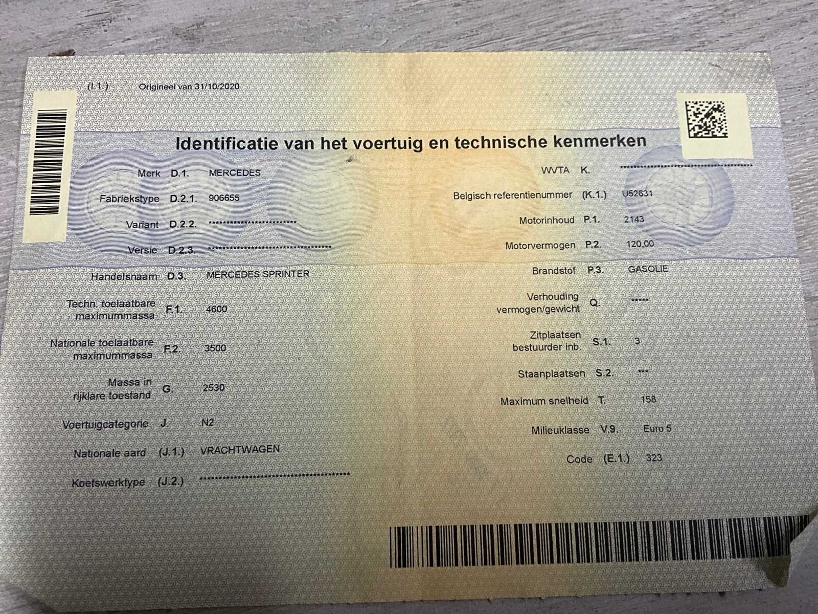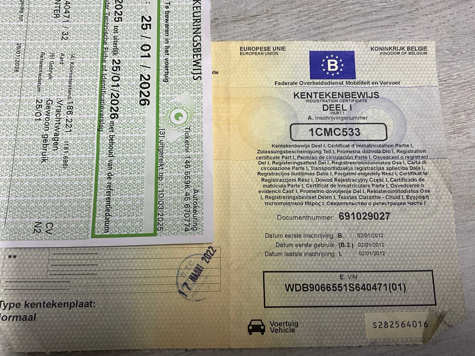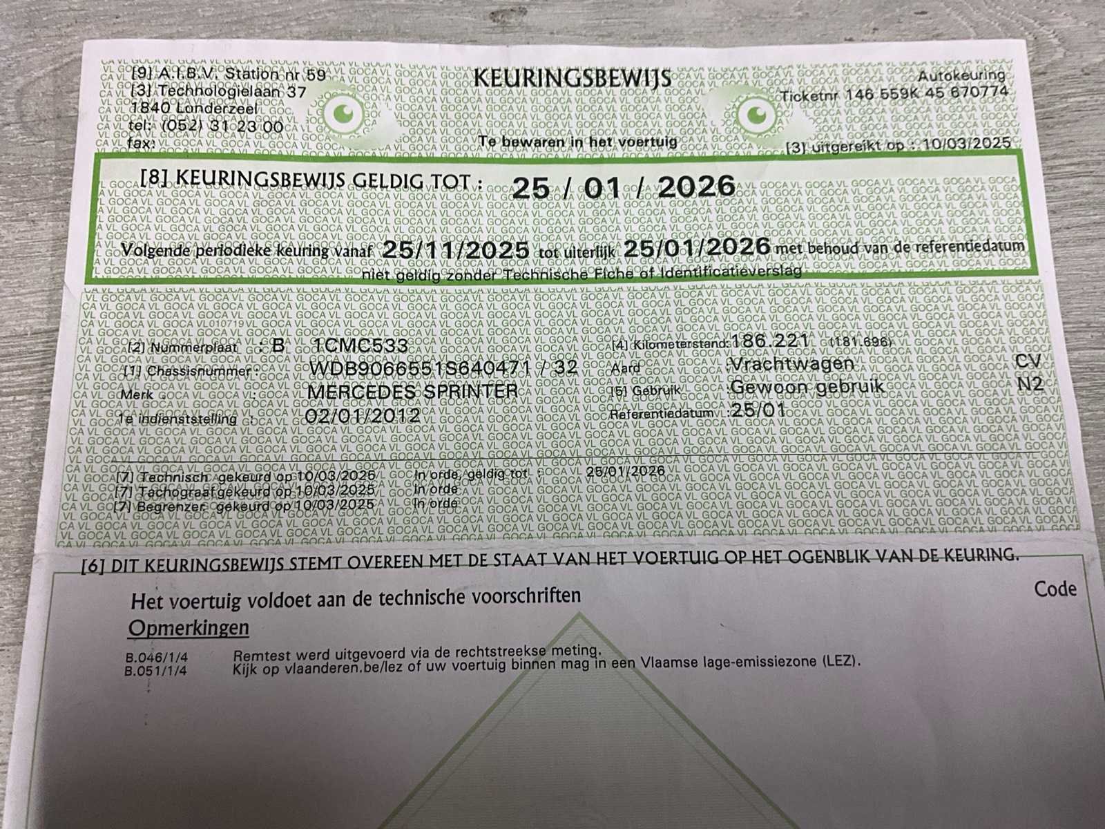 Wordt geleverd met bewijs van verlies deel 2 - geldige technische keuring tot 25/1/2026 (zonder opmerkingen en dd. 10/3/2025 op 186221km) - start, rijdt, remt - wordt verkocht met inrichting en inhoud Nee Merk: Mercedes-Benz Model: Sprinter Type: 416CDI Bouwjaar: 2012 Afgelezen kilometerstand: 188555km Cilinderinhoud: 2143cc Vermogen (kW): 120kW Brandstof: diesel Chassisnummer: WDB9066551S640471 Datum eerste toelating: 2/1/2012 Aantal zitplaatsen: 3 Transmissie: Handgeschakeld Aantal deuren: 5 Nationaliteit documenten: B Gelijkvormigheidsattest aanwezig: true Start en rijdt: ja Keuringsrapport geldig tot: 25/1/2026 Zichtbare schade: ja Vavato voert geen technische keuring uit.: true Inschrijvingsbewijs - deel 1 : Aanwezig Inschrijvingsbewijs - deel 2: Niet aanwezig