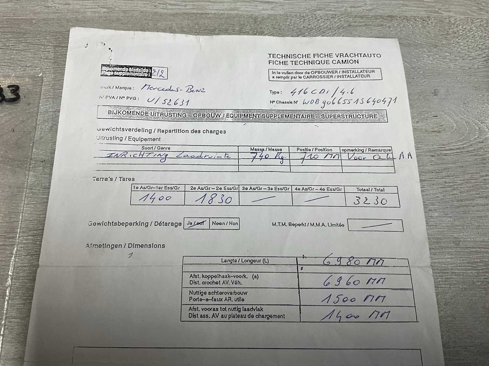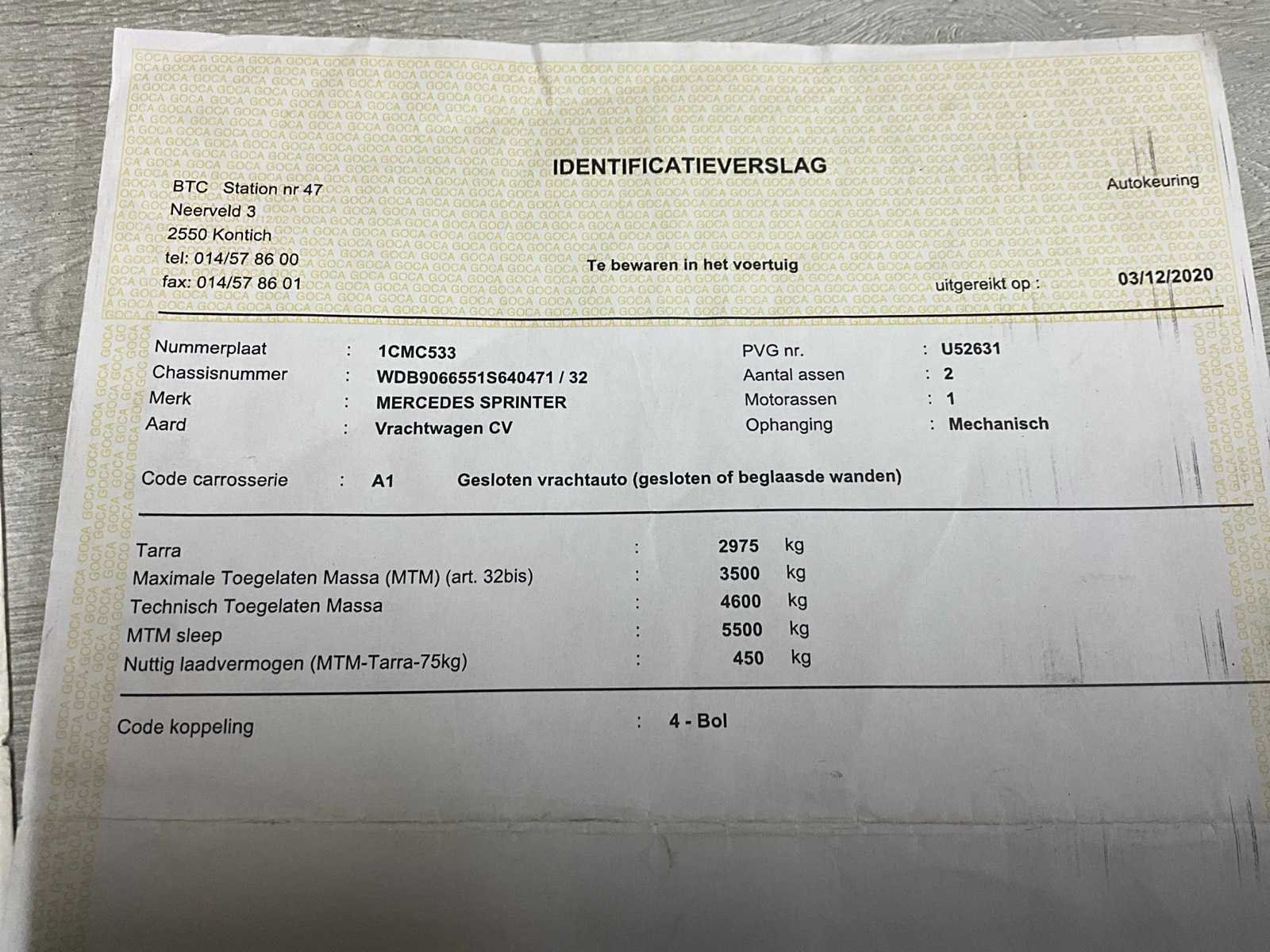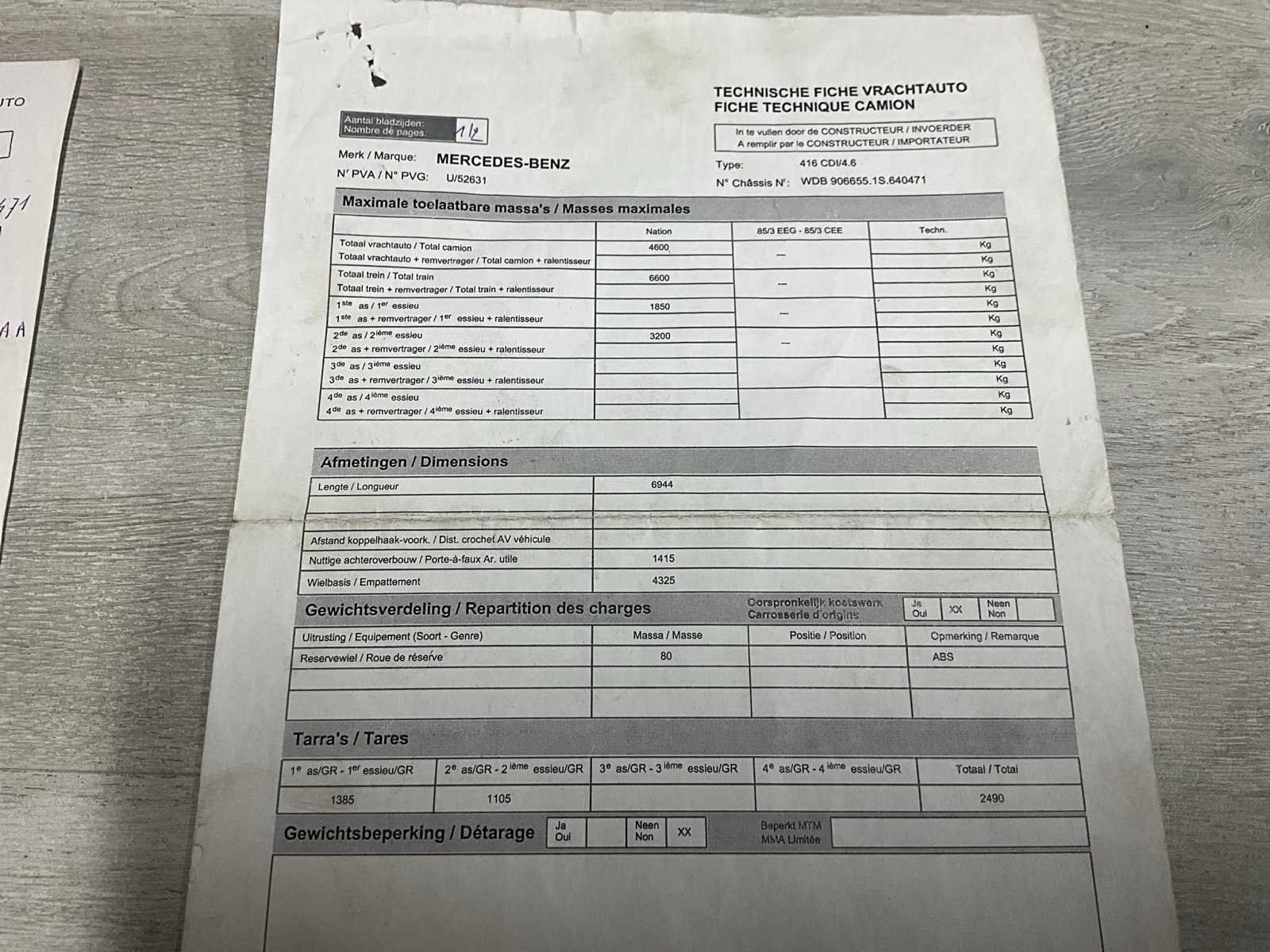 Wordt geleverd met bewijs van verlies deel 2 - geldige technische keuring tot 25/1/2026 (zonder opmerkingen en dd. 10/3/2025 op 186221km) - start, rijdt, remt - wordt verkocht met inrichting en inhoud Nee Merk: Mercedes-Benz Model: Sprinter Type: 416CDI Bouwjaar: 2012 Afgelezen kilometerstand: 188555km Cilinderinhoud: 2143cc Vermogen (kW): 120kW Brandstof: diesel Chassisnummer: WDB9066551S640471 Datum eerste toelating: 2/1/2012 Aantal zitplaatsen: 3 Transmissie: Handgeschakeld Aantal deuren: 5 Nationaliteit documenten: B Gelijkvormigheidsattest aanwezig: true Start en rijdt: ja Keuringsrapport geldig tot: 25/1/2026 Zichtbare schade: ja Vavato voert geen technische keuring uit.: true Inschrijvingsbewijs - deel 1 : Aanwezig Inschrijvingsbewijs - deel 2: Niet aanwezig