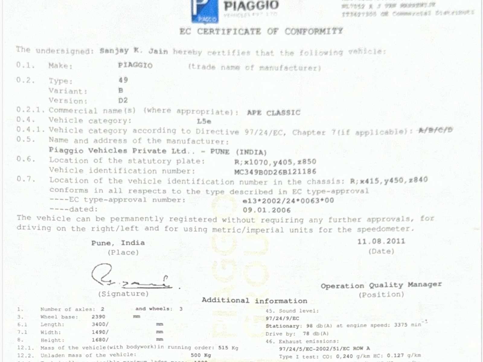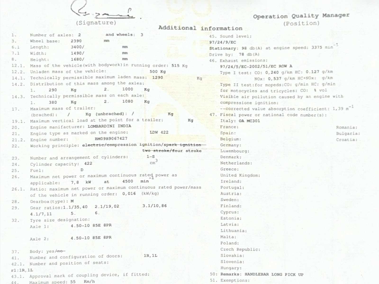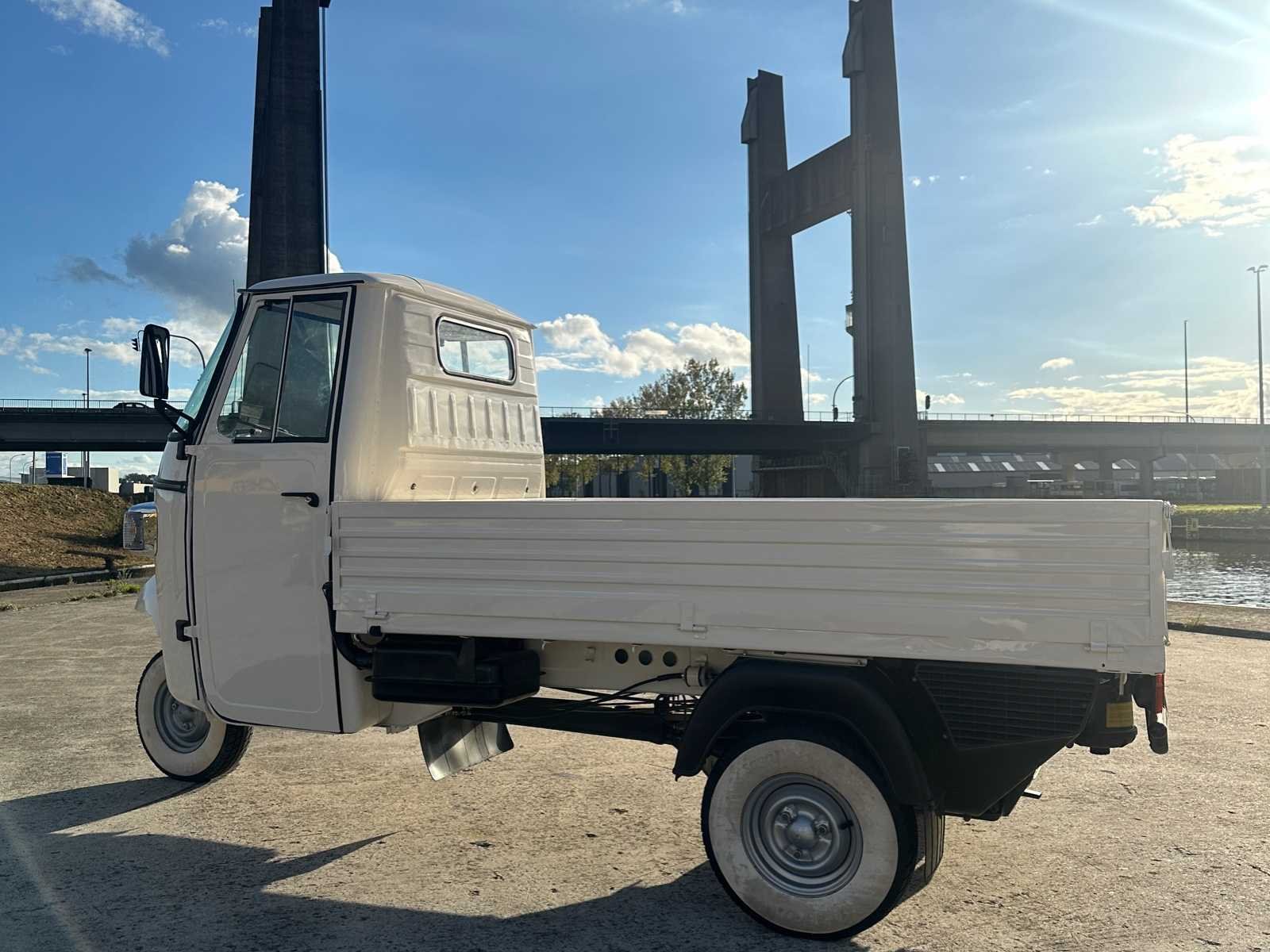Afwerking in Calessino stijl. Gespoten in luxe RAL 9001 kleur. +_ 600 originele kilometers (werd gebruikt als catering-toonbank). Witte 3-luiks overkapping met zeil en frame inbegrepen (momenteel niet gemonteerd). Eéncilinder 4-takt dieselmotor. Max vermogen 6,20Nm bij 3600 tpm. Motorinhoud 435cc. Max snelheid 45km/u. Lengte laadruimte: 180cm. Breedte laadruimte: 140cm. L340cm B149cm H168cm. Volledig afgewerkt, rijklaar en met documenten. No Merk: Piaggio Model: APE Classic 400 Brandstof: Diesel Cilinderinhoud: 435cc Datum eerste toelating: 19/08/2011 Afgelezen kilometerstand: 600km Startinformatie: Start en rijdt Bouwjaar: 2011