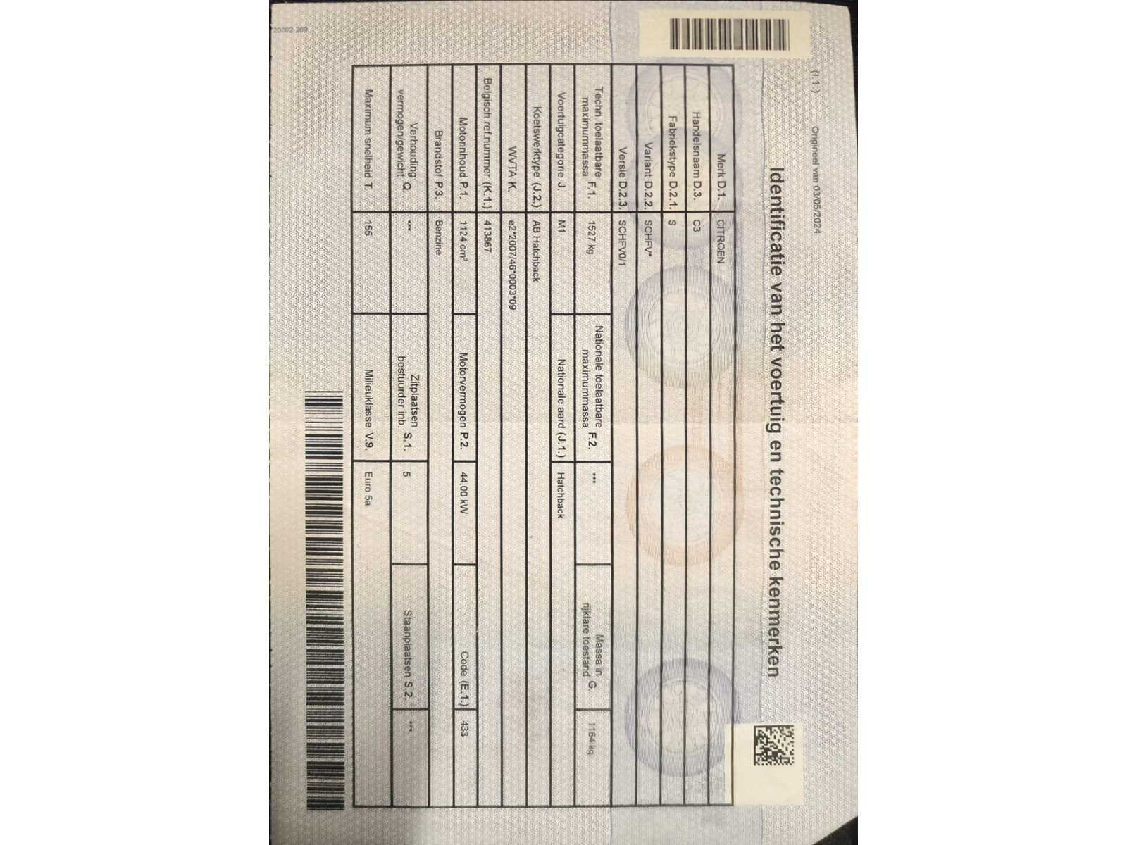 - Deel 2 niet aanwezig (Attest van verlies aanwezig) Nee Merk: Citroën Model: C3 Bouwjaar: 2011 Afgelezen kilometerstand: 150200km Cilinderinhoud: 1124cc Vermogen (kW): 44kW Brandstof: benzine Chassisnummer: VF7SCHFV0BW562364 Datum eerste toelating: 01/06/2011 Aantal zitplaatsen: 5 Emissieklasse: Euro 5A Aantal deuren: 5 Nationaliteit documenten: Belgisch Gelijkvormigheidsattest aanwezig: true Start en rijdt: YES Inschrijvingsbewijs - deel 1 : Aanwezig Inschrijvingsbewijs - deel 2: Niet aanwezig