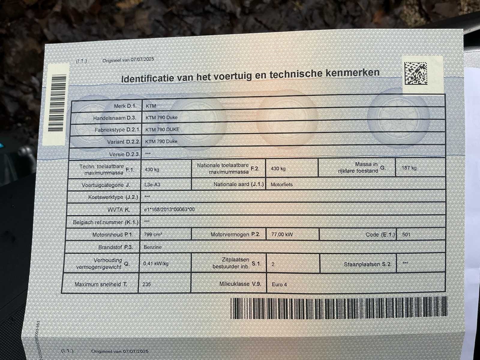 No Merk: 2018 KTM Model: Duke Type: 790 Kenteken: MBHA973 Brandstof: Benzine Chassisnummer: VBKTU6406JM725691 Cilinderinhoud: 799cc Datum eerste toelating: 25/06/2018 Vermogen (kW): 77kW Afgelezen kilometerstand: 28780km Nationaliteit documenten: Belgische Boorddocumenten aanwezig?: true Startinformatie: Start en rijdt Bouwjaar: 2018