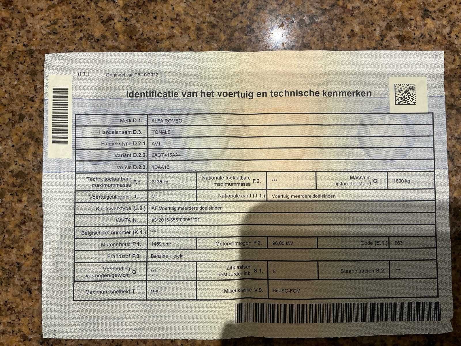 29/04/2025 - Groot onderhoud gehad / 4 nieuwe banden / nieuwe batterij No Merk: Alfa Romeo Model: Tonale Type: AV1 Bouwjaar: 2022 Afgelezen kilometerstand: 540014km Cilinderinhoud: 1469cc Vermogen (kW): 96kW Brandstof: Benzine Chassisnummer: ZARNASSA4N3009817 Datum eerste toelating: 29/10/2022 Aantal zitplaatsen: 5 Kleur: Blauw Transmissie: Automaat Aantal deuren: 5 Aantal sleutels: 2 Nationaliteit documenten: Belgisch Gelijkvormigheidsattest aanwezig: true Carpass: true Start en rijdt: Ja Vavato voert geen technische keuring uit.: true Airconditioning: true Navigatie: true Xenon verlichting: true Inschrijvingsbewijs - deel 1 : Ja Inschrijvingsbewijs - deel 2: Ja
