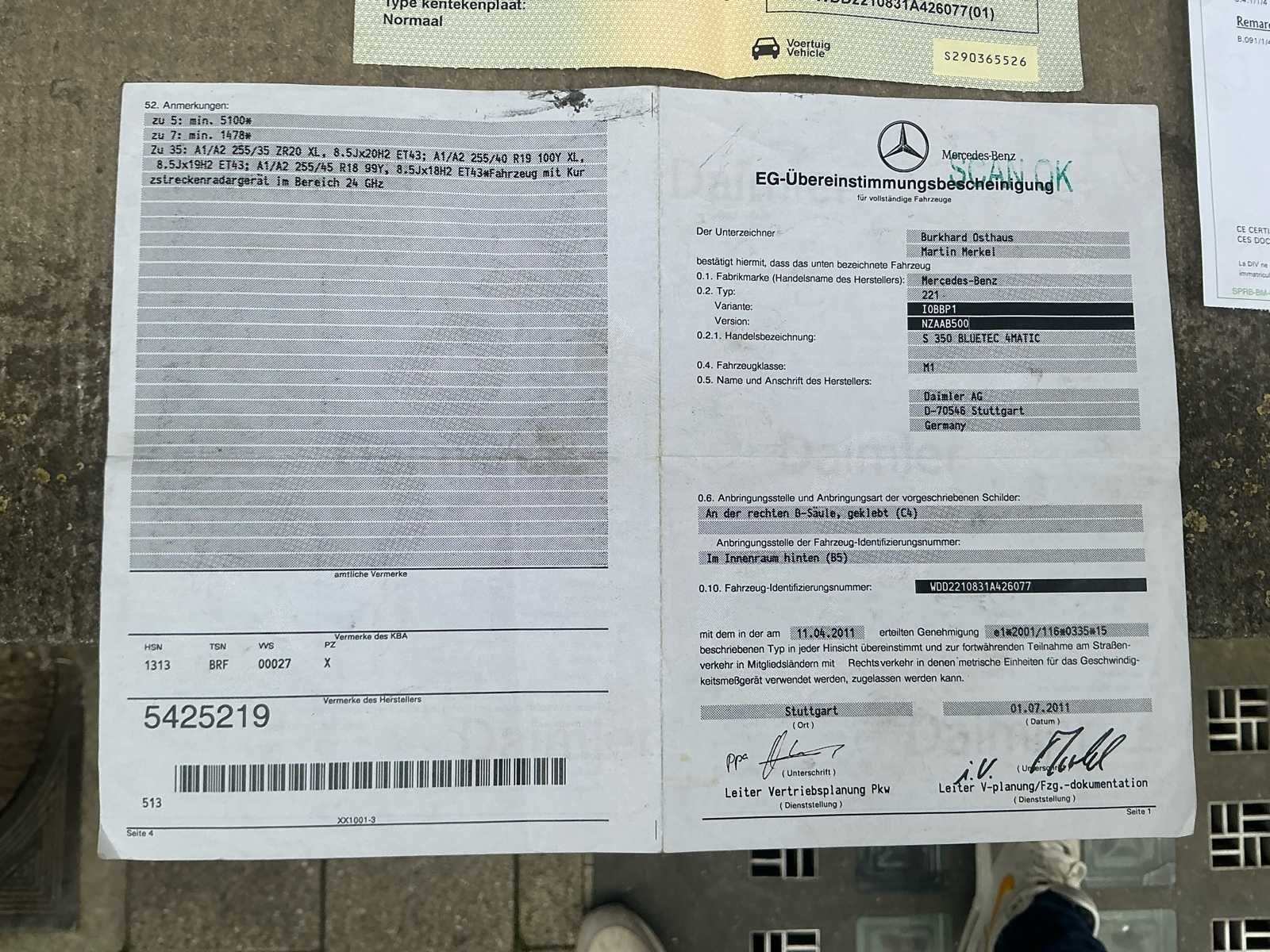 De wagen bevindt zich in gebruikte maar goede staat. Motorlampje brandt wel maar de wagen rijd wel normaal. Opties: -4Matic -Luchtvering -Navigatie -Leder interieur -Open dak -Elektrische stoelen met geheugen functie. Nee Merk: Mercedes-Benz Model: S 350 4matic 3.0 Diesel 258 Pk Type: Berline Bouwjaar: 2011 Afgelezen kilometerstand: 271054km Cilinderinhoud: 2987cc Vermogen (kW): 190kW Brandstof: Diesel Chassisnummer: WDD2210831A426077 Datum eerste toelating: 02/08/2011 Aantal zitplaatsen: 5 Kleur: Zilver Transmissie: Automaat Emissieklasse: Euro 6 Aantal deuren: 4 Nationaliteit documenten: Belgisch Gelijkvormigheidsattest aanwezig: true Vavato voert geen technische keuring uit.: true Airconditioning: true Navigatie: true Xenon verlichting: true Leder bekleed: true Luchtvering: true Vierwielaandrijving 4x4: true