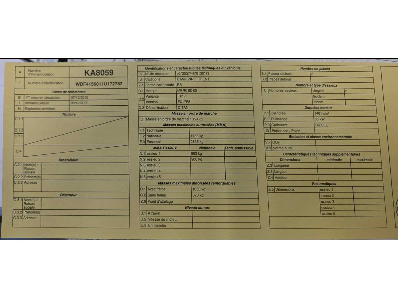 Non Merk: Mercedes-Benz Model: Citan Type: 108 CDI Bouwjaar: 2015 Afgelezen kilometerstand: 149328km Cilinderinhoud: 1461cc Vermogen (kW): 55kW Brandstof: diesel Chassisnummer: WDF4156011U172752 Datum eerste toelating: 07/12/2015 Aandrijving: Oui Aantal zitplaatsen: 2 Transmissie: Handgeschakeld Stuurwiel: Links Ledig gewicht: 1350kg Aantal cilinders: 4 Nationaliteit documenten: Luxembourgeoise Start en rijdt: Oui
