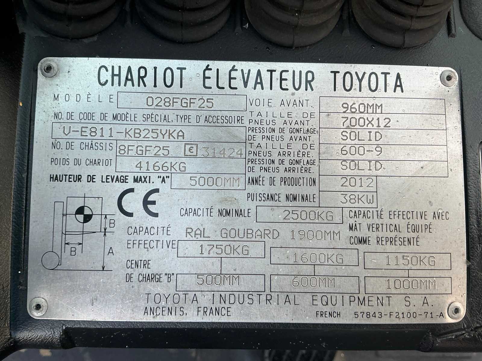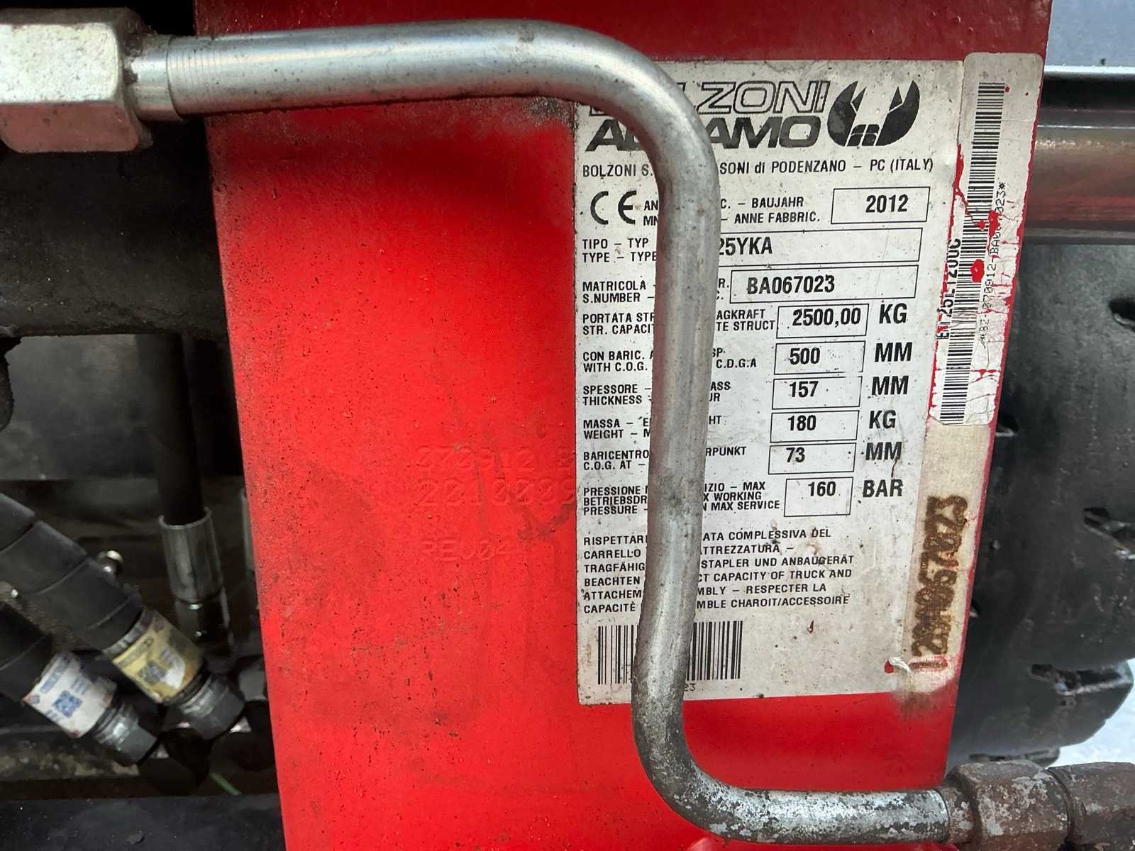 Bolzoni auramo vorkversteller met 1600 mm opening , ingebouwd weegsysteem + automatische vlak stelling Nee Merk: Toyota Type: 028FGF25 Bouwjaar: 2012 Serienummer: 8FGF2531424 Brandstof: LPG Mast: Triple Soort band: Volrubber banden Aantal wielen: 4 Afgelezen urenstand: 5120 Side-shift: true Hydraulisch verstelbare lepels: true Duplex mast: true Eigen gewicht: 4200kg Hefvermogen: 2500kg Lepellengte: 1200mm Min. hefhoogte: 0mm Max. hefhoogte: 5000mm Hefhoogte: 5000mm Vol rubber banden: true Totale afmeting L: 2900mm Totale afmeting Breedte: 1160mm Totale afmeting Hoogte: 3050mm LPG: true
