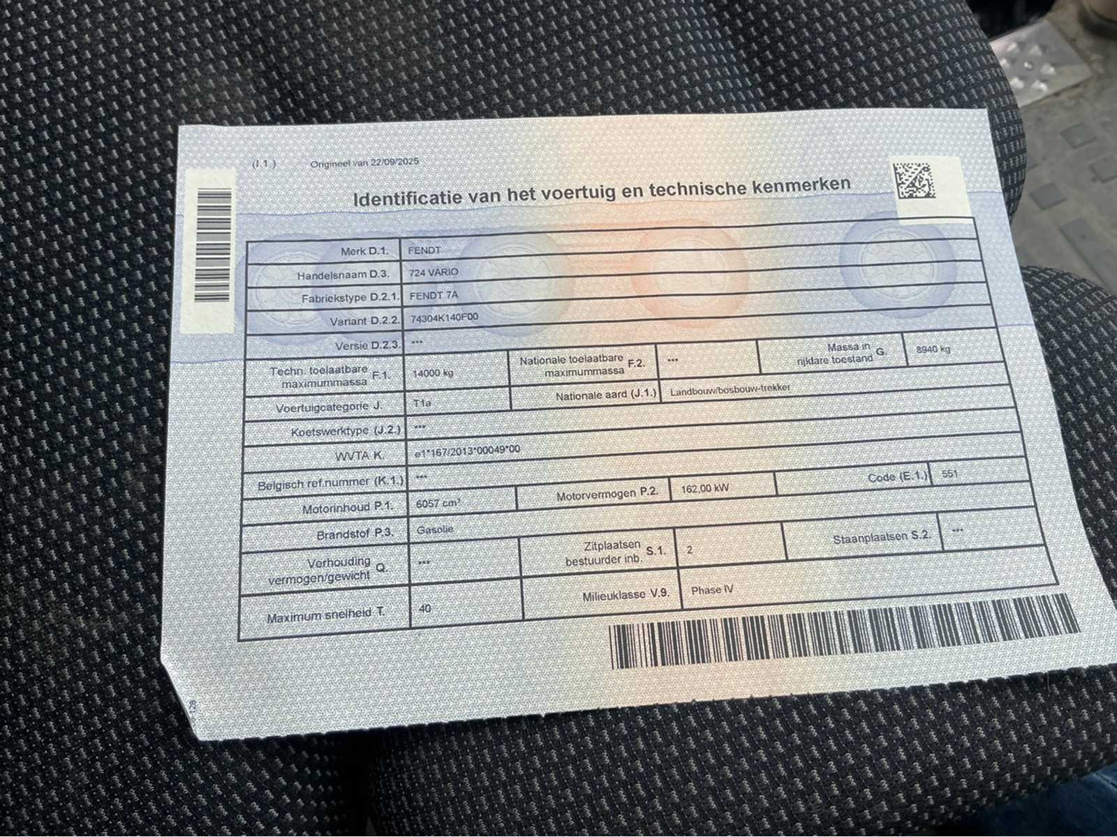 Bandendruksysteem via isbobus<gr>Gps novatel met sectie controller<gr>3 punts luchtgevechten cabine<gr>luchtremmen en hydraulische rem<gr>motorrem<gr>4 dubbel werkende ventielen<gr>achter/onder druk ontkoppelbaar<gr>ls aansluiting<gr>isobus<gr>hydraulische topstang<gr>werklichten voor en achter<gr>pitonfix trekhaak<gr>fronthef met positie regeling<gr>pto vooraan<gr>1 dubbelwerkend ventiel<gr>retour voor<gr>automatische klimaatregeling<gr>luxe spiegels/elektrisch verstelbaar Nee Merk: Fendt Type: 724 S4 Profiplus Bouwjaar: 2018 Kenteken: 2HPH114 Afgelezen urenstand: 8000 Bandenmaat voor: 600/65R28 95% Bandenmaat achter: 710/70R28 90% Cabine: true Luchtgeveerde stoel: true Kentekenpapieren compleet?: true Chassisnummer: WAM74321LOOF07320 Datum eerste toelating: 09/05/2018 Nationaliteit documenten: Belgische