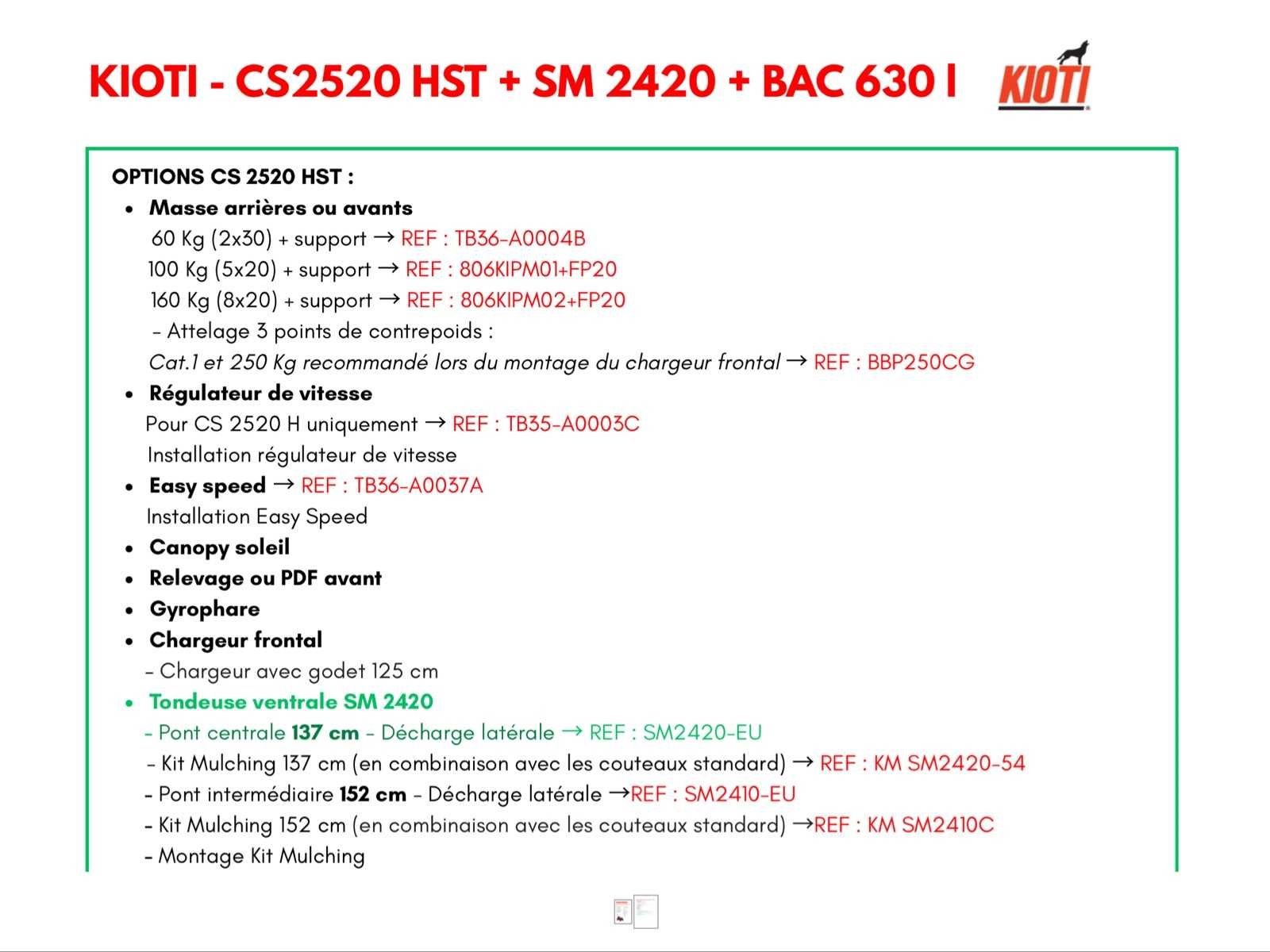 De traktro bevindt zich in zeer goede staat. , Technische fiche is beschikbaar. No Merk: Kioti Type: CS2520 + SM2420 + Bac 630l Bouwjaar: 2019 Serienummer: DD1C25DAK0200023 Motorvermogen (kW): 18kW Afgelezen urenstand: 26 Versnellingsbaktype: Hydrostatique Aftakastoerental: 540rpm Aantal hydraulische ventielen voor: 0 Aantal hydraulische ventielen achter: 4 Frontgewichtenset: true Eigen gewicht: 710kg Totale afmeting L: 2493mm Totale afmeting Breedte: 1180mm Chassisnummer: DD1C25DAK0200023