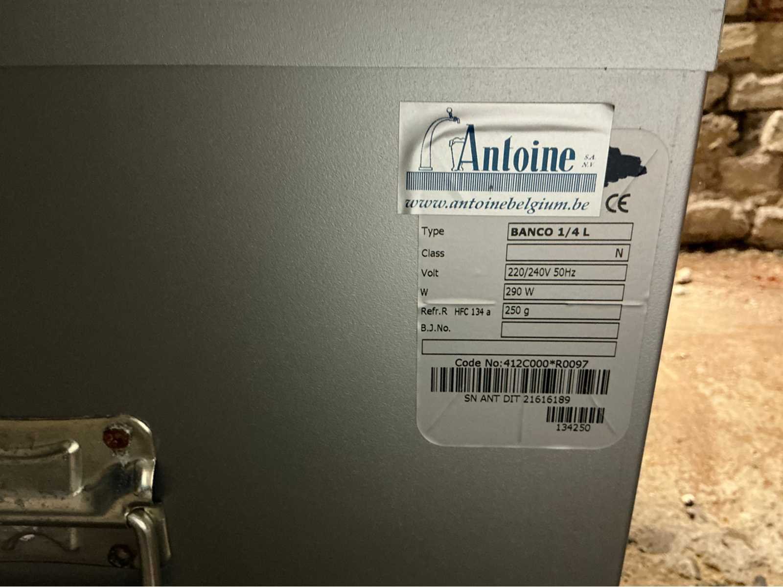 Dit is een koelaggregaat van het merk Antoine Belgium, type BANCO 1/4 L — een ondertoogkoelunit of bierkoelinstallatie die gebruikt wordt in de horeca om tapinstallaties, koelbladen te koelen, koelaggregaat voor biertapinstallaties, koelbladen of spoeltafels. Nee Merk: Antoine Belgium Bouwjaar: 2017