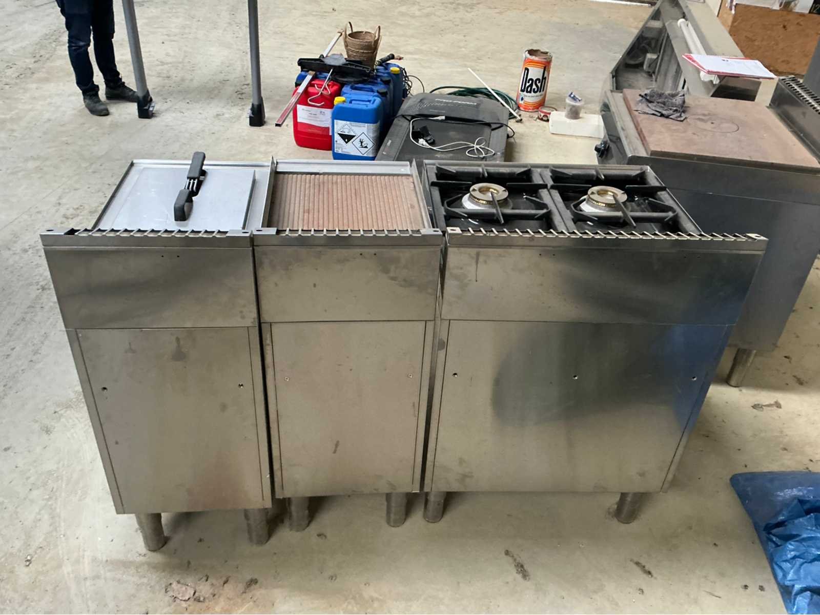 Lot Keuken gereedschap in goede staat. Het lot bevat: 1. Gasfornuis is over. 2. Grillplaat & Bakplaat. 3. Luchtfrituur. Nee Merk: Mastro Type: DAA0077 Bouwjaar: 2014 Kleur: Grijs
