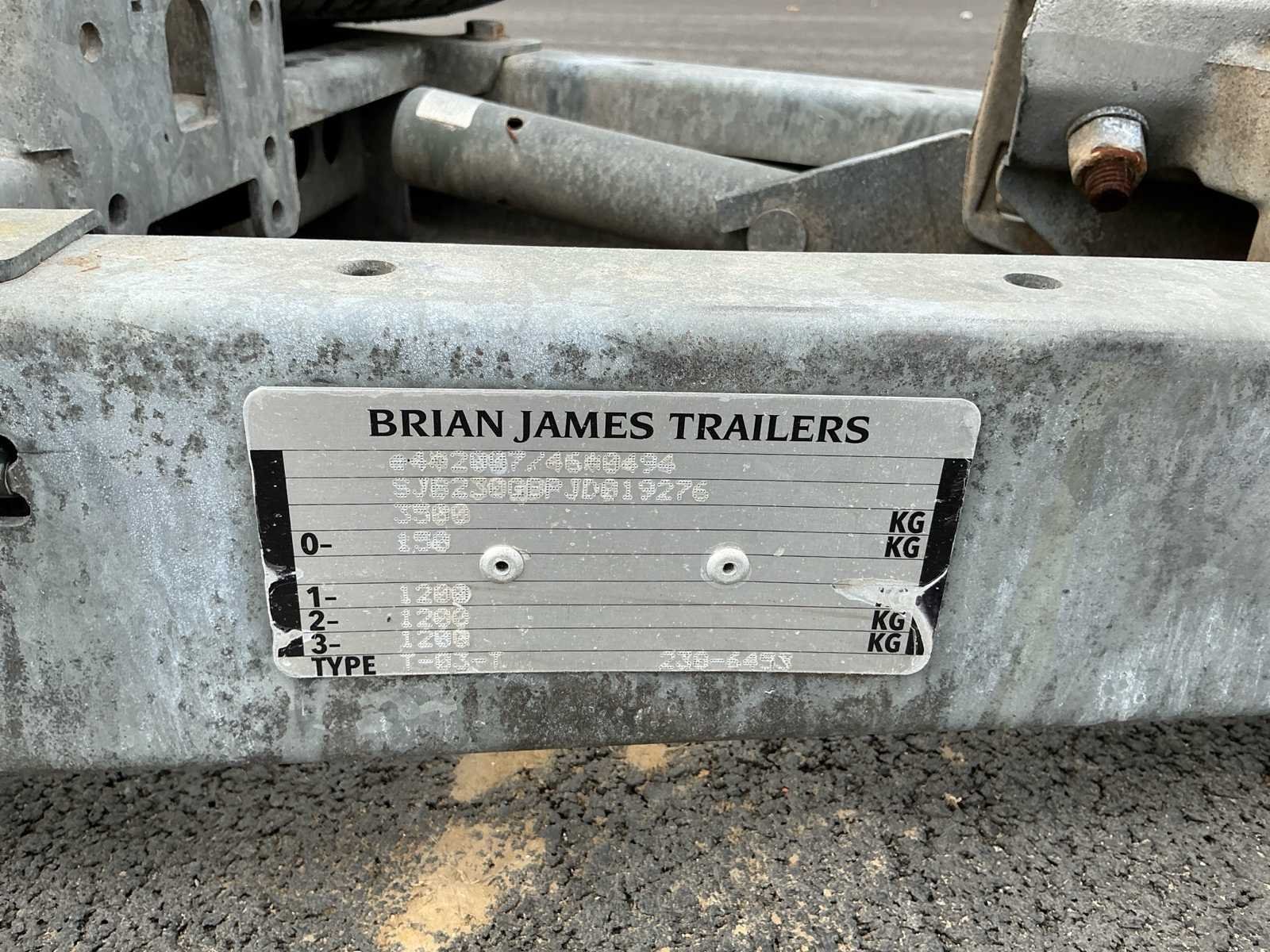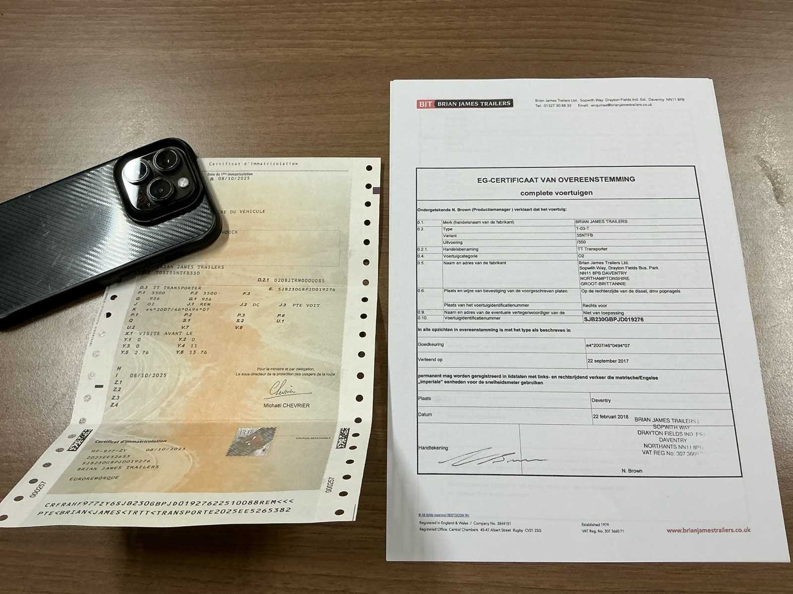 No Merk: Brian James Trailers Type: T-03-T Model: TT Transporter Bouwjaar: 2025 Chassisnummer: SJB230GBPJD019276 Aantal assen: 3 Laadvermogen: 3500kg Datum eerste toelating: 05/10/2025 Nationaliteit documenten: Frans
