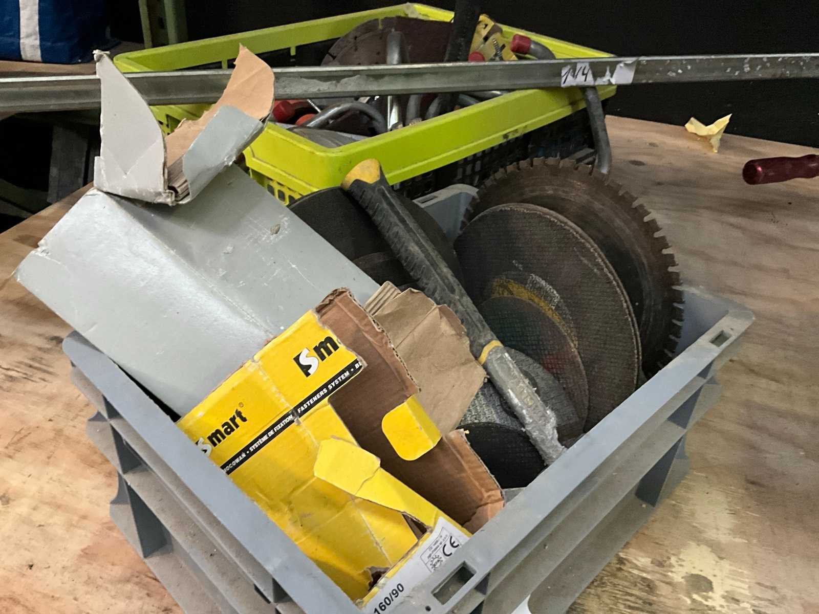 Bestaand uit handgereedschap, spanvijs lengte circa 150 cm, zaagbladen en schijven, box met diversen Nee