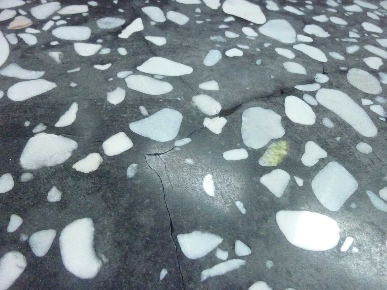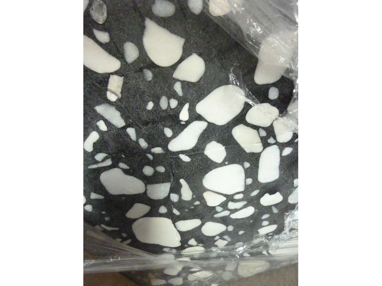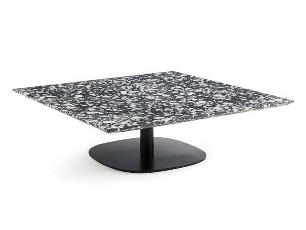 • MDF bovenkant bedekt met zwart-witte Terrazzo-steen. Elk stuk is uniek, het algehele uiterlijk van de top kan van de top tot de andere verschillen, alle stenen verschillen in grootte en tinten. Deze verschillen geven de tafel al zijn schoonheid en uniekheid. • Afgeschuinde randafwerking • Middenpoot in zwart geverfd staal met epoxy-afwerking Grootte • Breedte: 110 cm • Hoogte: 34 cm • Diepte: 110 cm Non