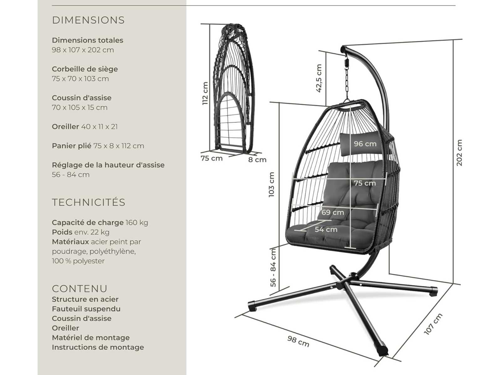 Technische kenmerken: Afmetingen (BxDxH): ca. 98 x 107 x 202 cm Fauteuilafmetingen (BxDxH): ca. 75 x 70 x 103 cm Afmetingen van de opgevouwen fauteuil (WxDxH): ca. 75 x 8 x 112 cm Afmetingen zitkussens (BxDxH): ca. 105 x 70 x 15 cm Hoofdsteunafmetingen (BxDxH): ca. 40 x 11 x 21 cm Zithoogte: ca. 56 tot 84 cm Ondersteund gewicht: 160 kg Gewicht: ca. 21,8 kg Materialen: Epoxy los staal, 100% polyester Non