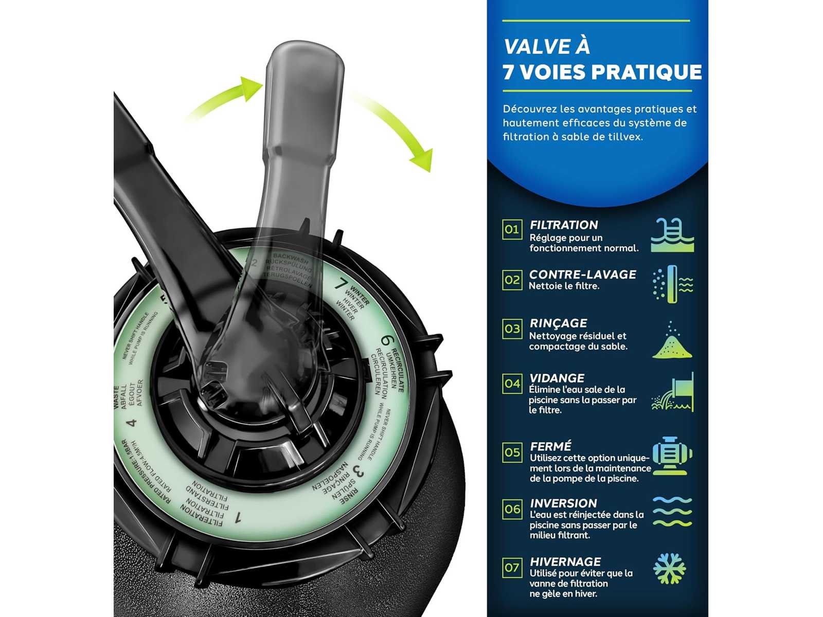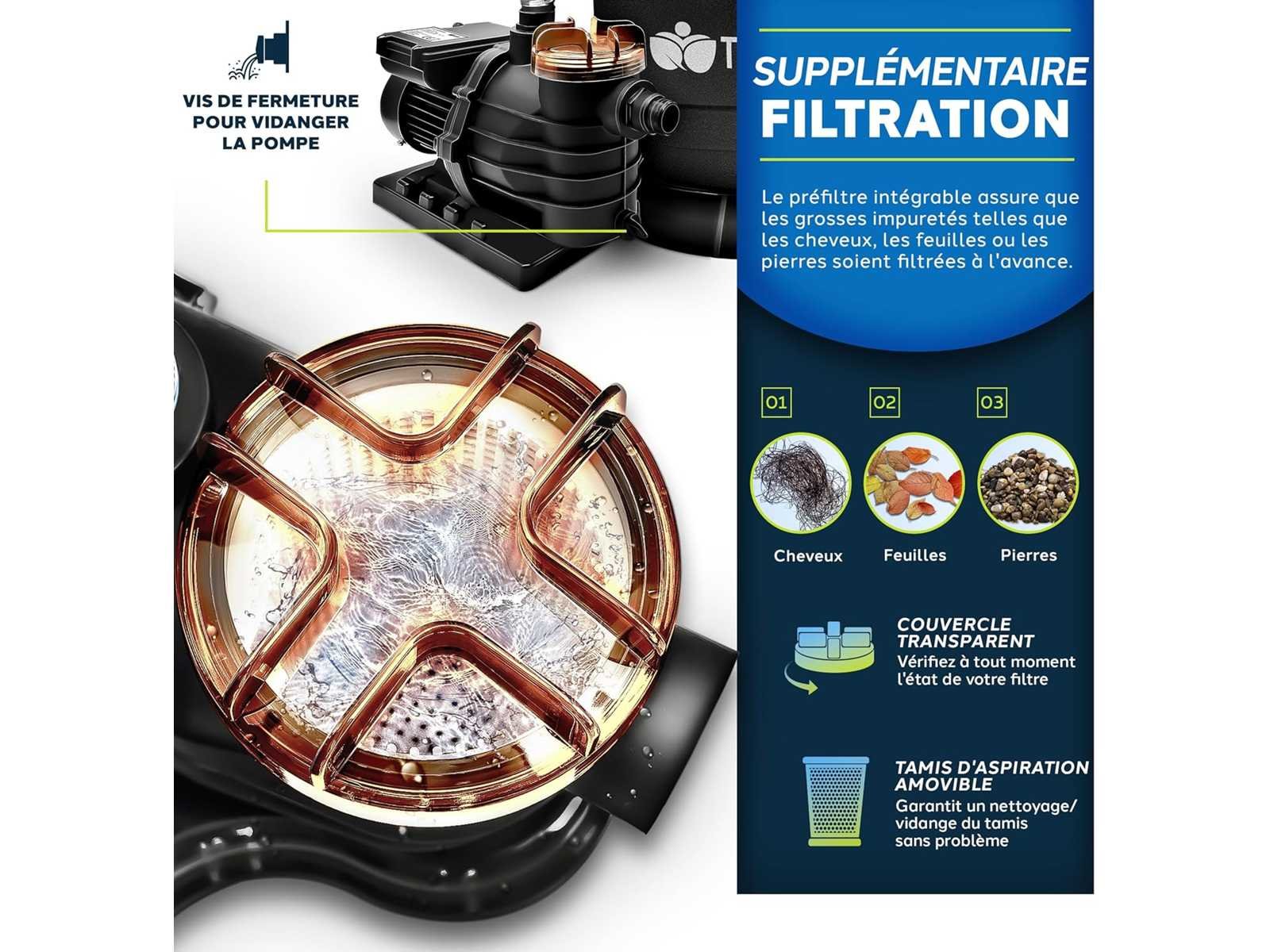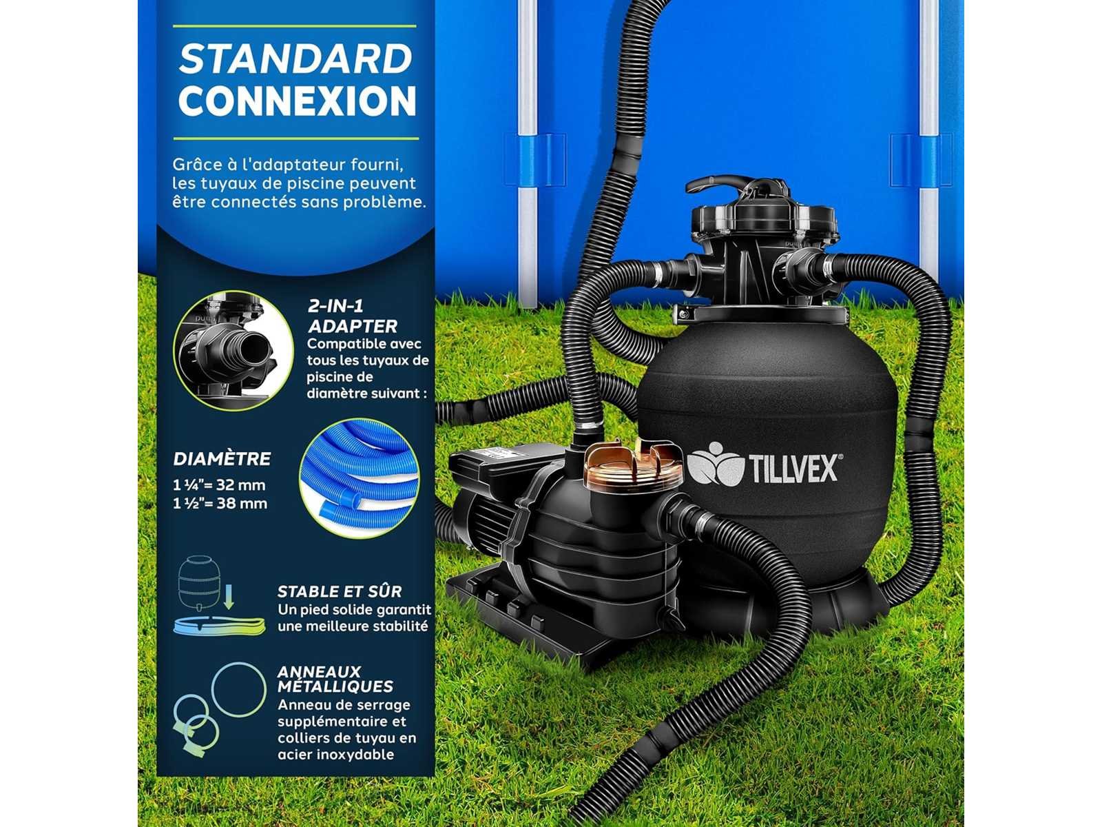 TOPKWALITEIT: Hoogpresterend zandfiltratiesysteem met een maximale debiet van 10.200 l/u en een afvoerhoogte tot 10 m. Robuuste metalen pompbehuizing met IPX5 splash protection. Geschikt voor filterzand (kwartszand), filterglas of filterbollen. 7-WEG KLEP: Backwash, filtratie, spoelen, afvoeren, sluiten, circuleren en winterklaar maken. Het systeem is eenvoudig te vullen met water, het systeem werkt zelf. In de kit inbegrepen: 800 g filterballen. VEEL VOORDELEN: Geïntegreerde drukmeter tot 1 bar, stevige basis voor filtertank en pomp, tankcapaciteit tot 20 kg zand, 7-weg klep met handvat, afvoerklep, standaardaansluiting voor Ø 32/38 mm slangen, versterkte klemring en roestvrijstalen slangklemmen. TECHNISCHE GEGEVENS: Stroomkabel - 190 cm, filtratiecapaciteit = 10.200 L/h, vermogen: 400 W, spanning: 230V/50Hz, tankcapaciteit = 25 L. COMPATIBEL MET ALLE SOORTEN ZANDFILTERS: Dankzij de geïntegreerde adapter is het mogelijk om 32 mm of 38 mm zwembadslangen te gebruiken. Dit filtersysteem is ideaal voor zwembaden en vijvers. Een krachtig zwembadfilter vermindert het waterverbruik aanzienlijk. Vertrouw op ons bewezen zandfiltersysteem! Non