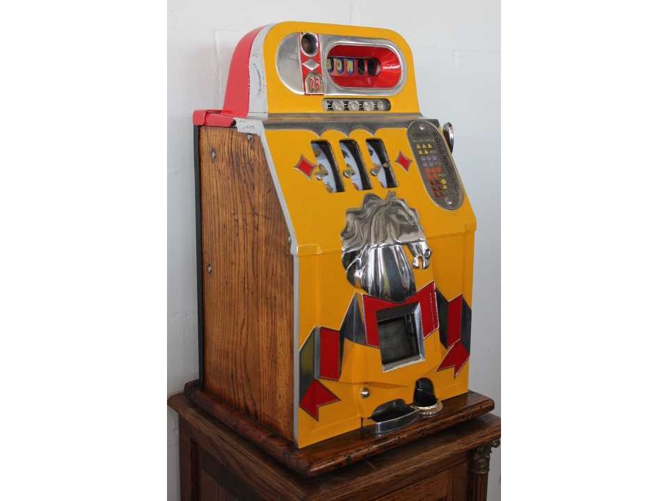 Slotmachine met Bonus systeem, werkt op Amerikaanse Quarters (worden erbij geleverd), slotmachine is geheel gerestaureerd No Merk: Mills Type: Horsehead Kleur: Yellow Bouwjaar: 1938