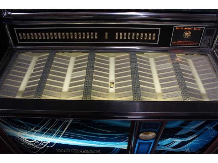 200 selecties, 45 tpm singles (worden erbij geleverd), stereo geluid No Merk: Wurlitzer Type: 3500 Zodiac Bouwjaar: 1971 Gewicht: 115 Lengte: 660mm Breedte: 1040mm Hoogte: 1350mm