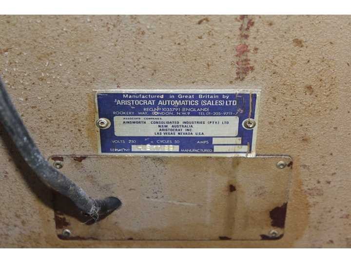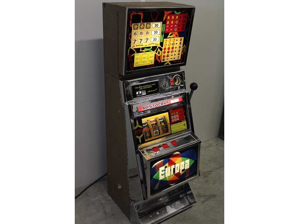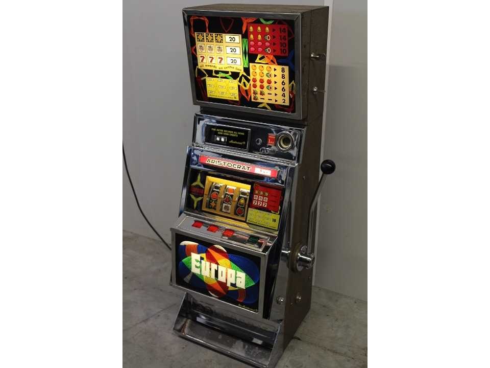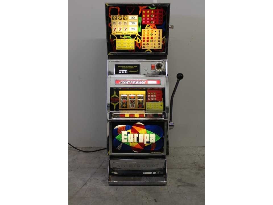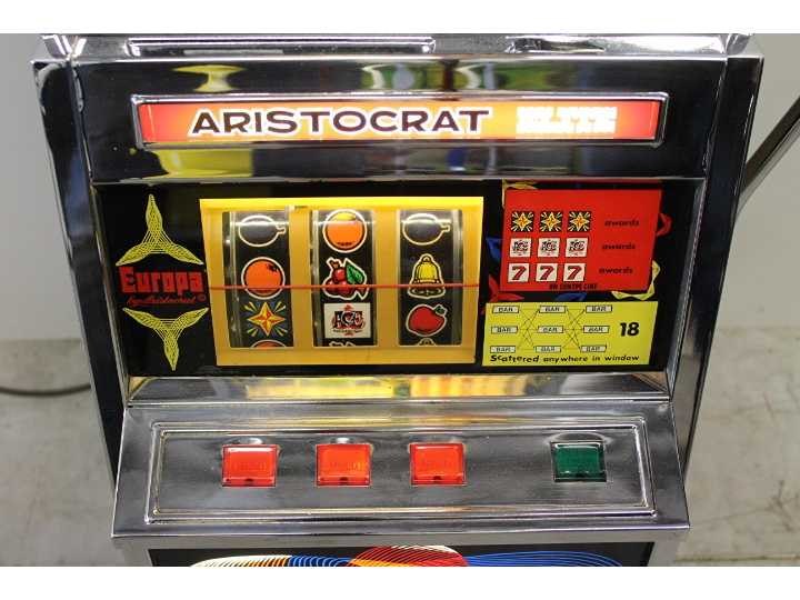 Slotmachine met jackpot, werkt op Nederlandse guldens (worden erbij geleverd), mooi chroom, met verlichting No Merk: Aristocrat Type: Elite Model: Europa Bouwjaar: 1960