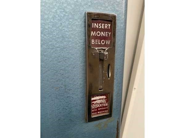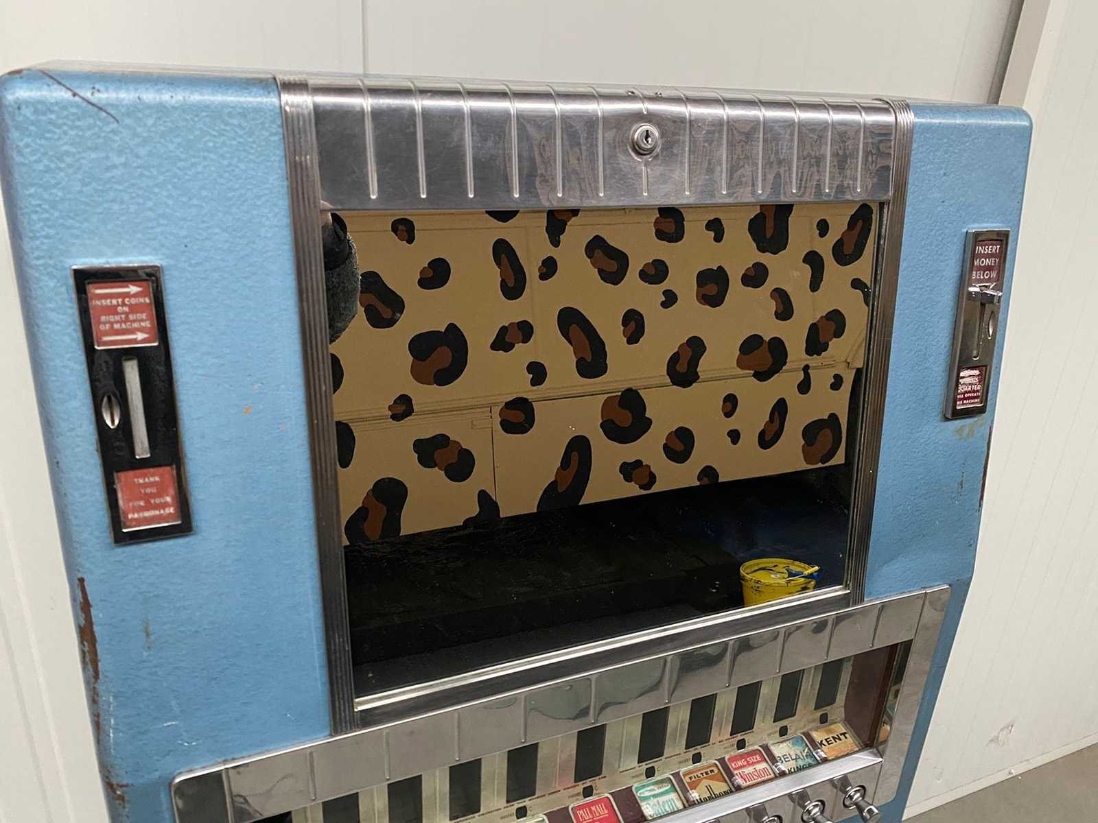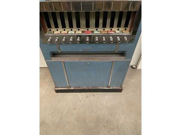 Vintage sigarettenautomaat, met muntinworp, spiegel No Merk: National Type: Vendor Lengte: 28cm Breedte: 86cm Hoogte: 155cm Materiaal: Metaal Gewicht: 90kg Bouwjaar: 1951