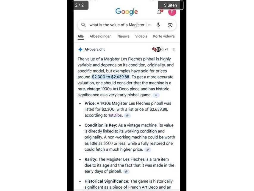 1 van de eerste flipperkasten, betaalt ook uit, heeft restauratie nodig Nee Merk: Magister Type: Les Fleches Bouwjaar: 1930