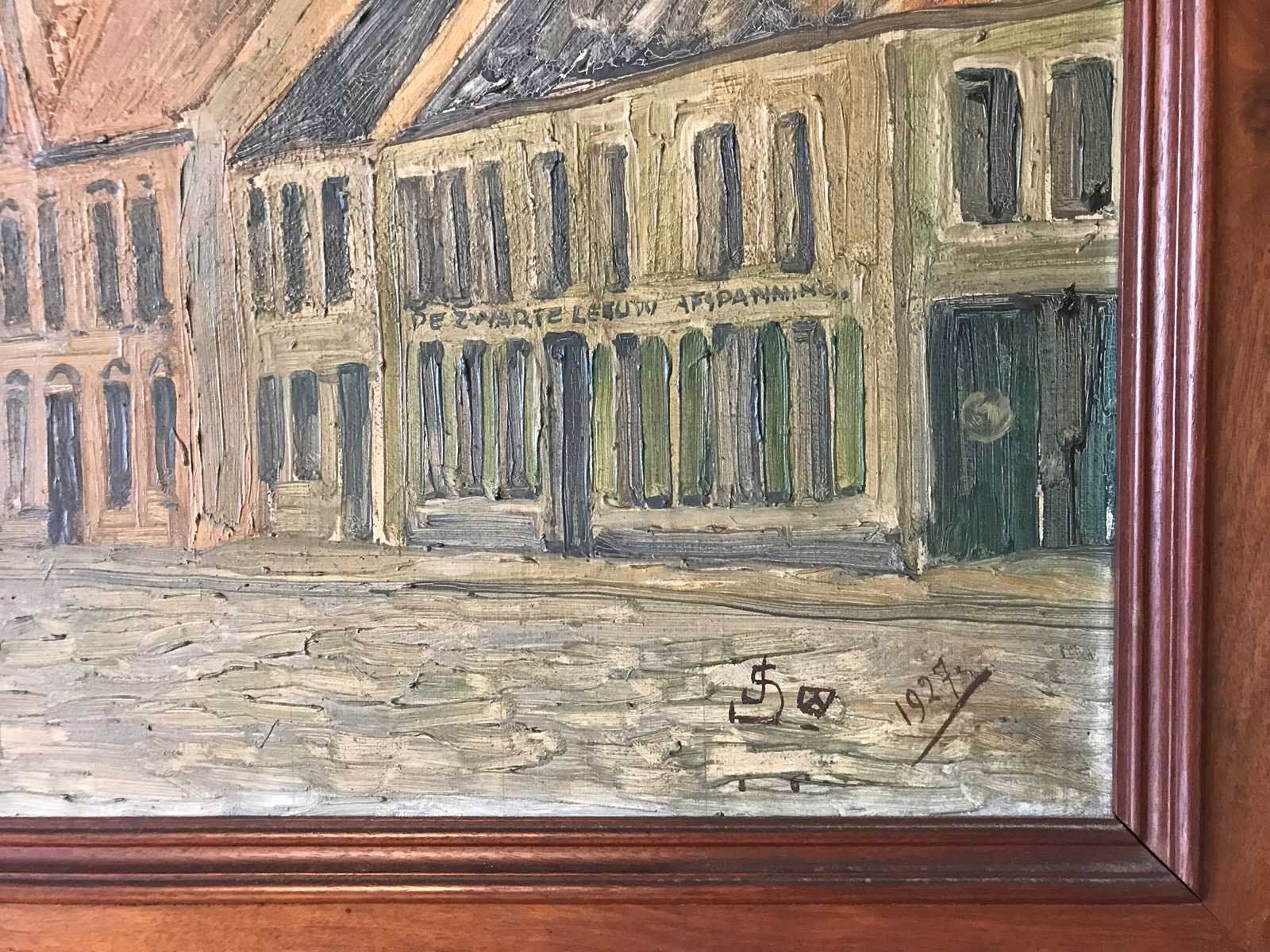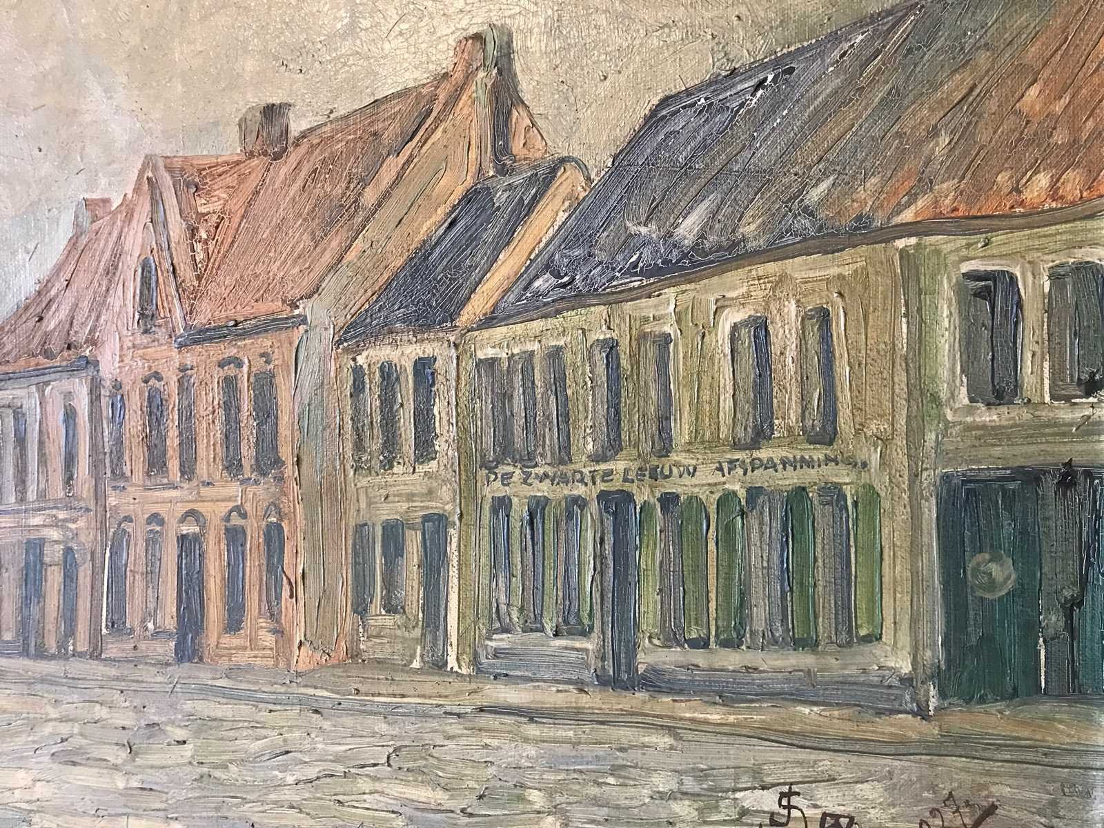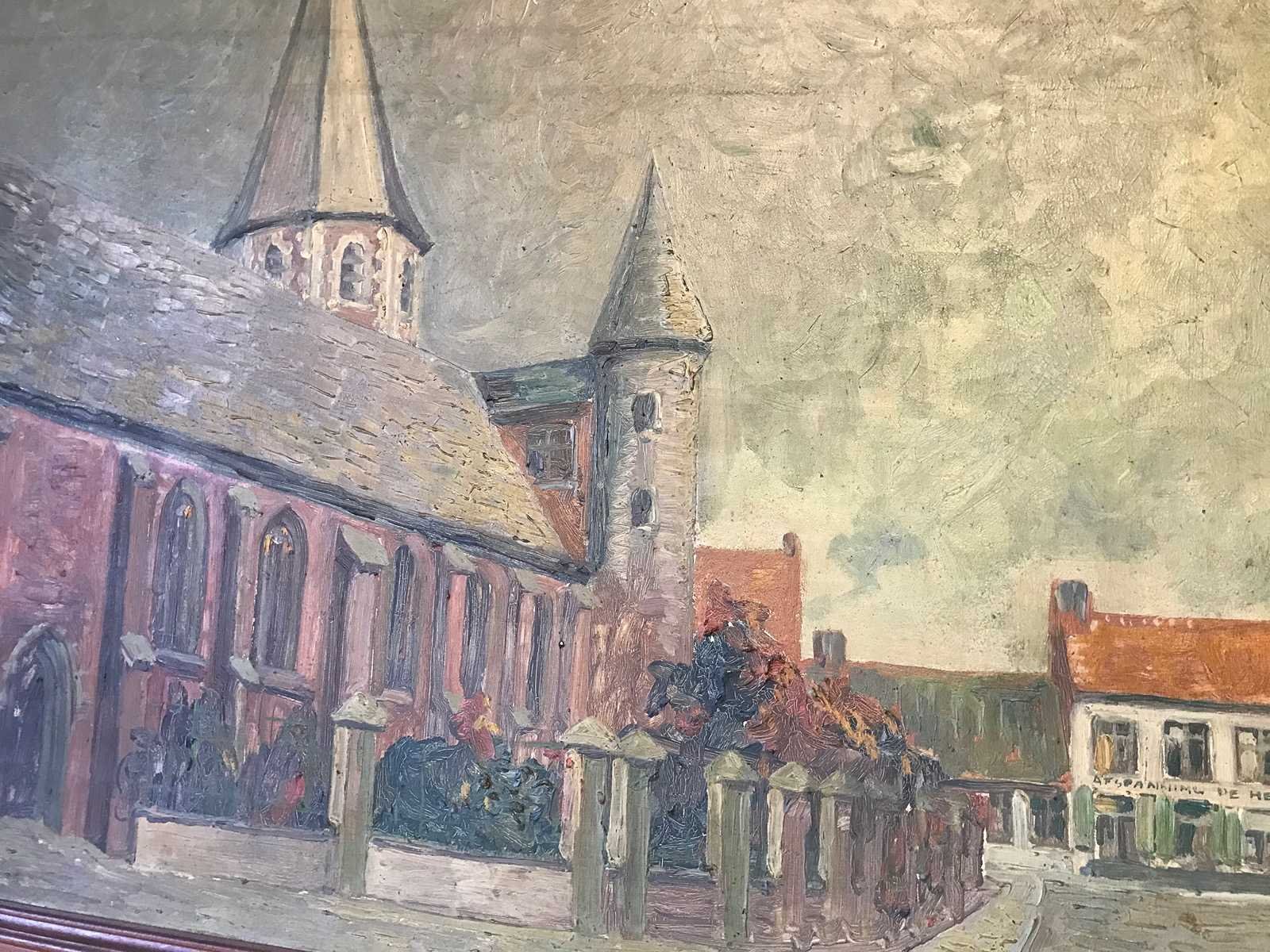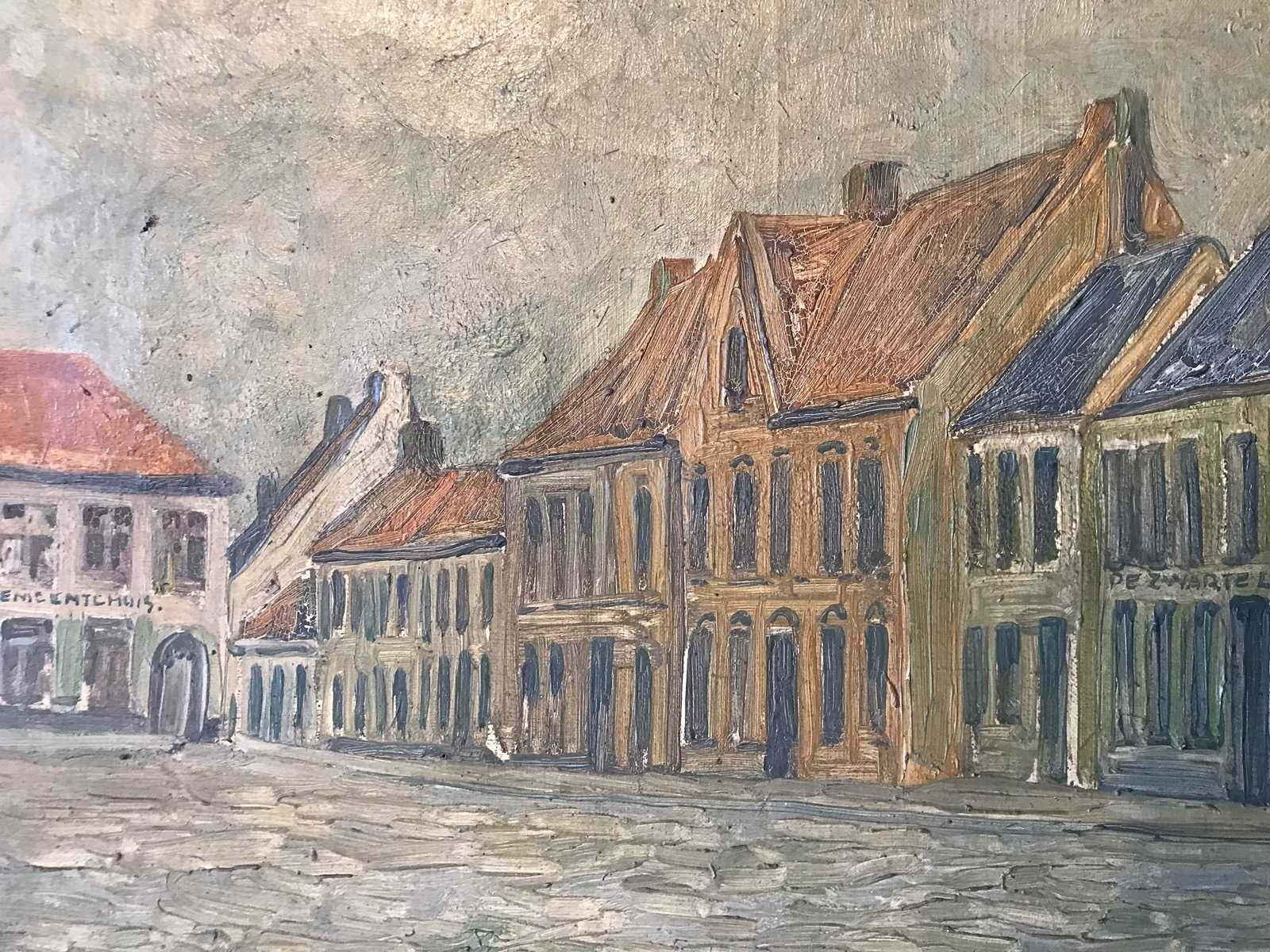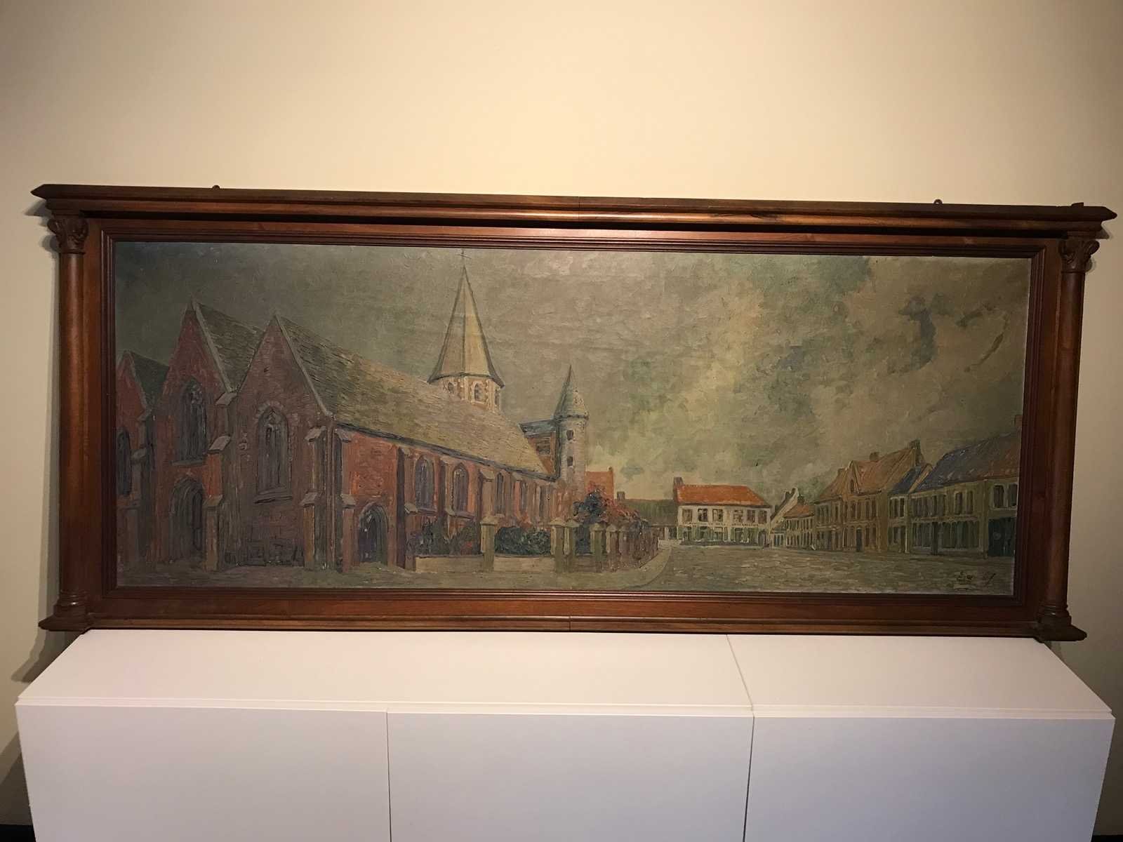 Zeer groot historisch schilderij olieverf op doek. 194cm x 80cm x 15cm. Grote markt Oostrozebeke. Met de St-Amanduskerk van voor de grote brand van 1935. Gesigneerd Juliaan Severin 1927. Met robuuste houten sierlijst. No Land: België Datering: 1927 Techniek: Olieverf op doek Handtekening/oplage: true Gesigneerd: Gesigneerd Breedte: 15cm Hoogte incl. lijst: 80cm Breedte incl. lijst: 194cm Frame: true Herkomst: Antiekhandelaar