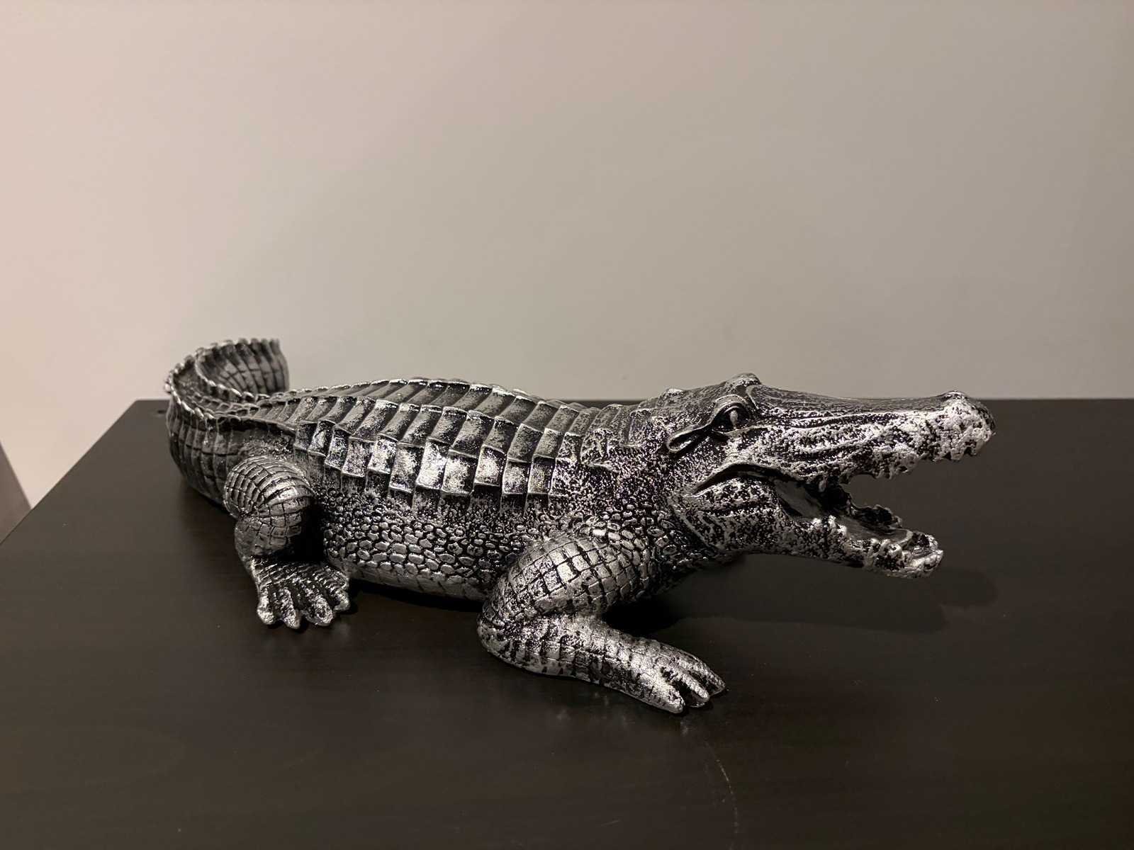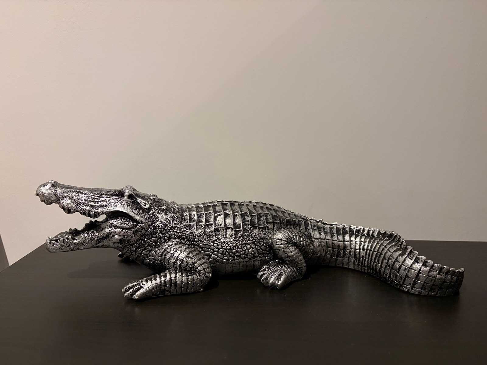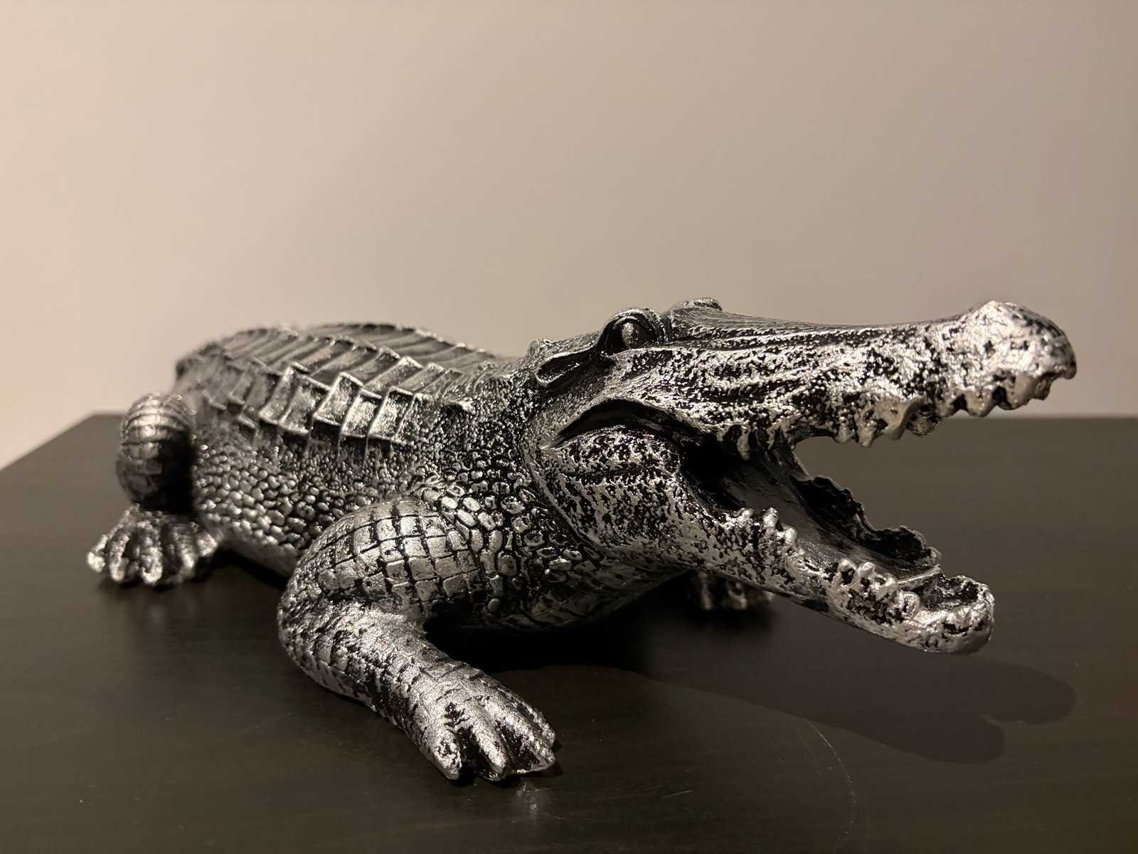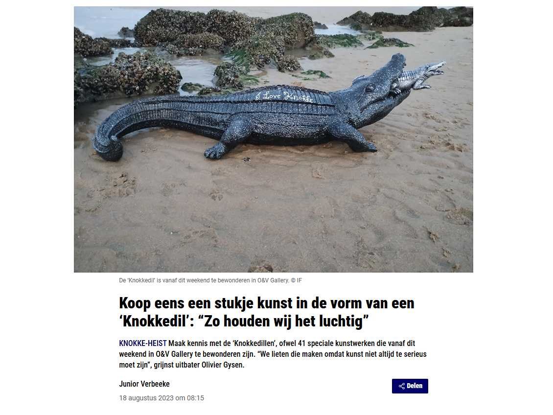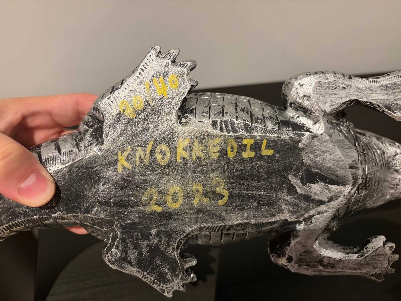Beeldje uit de installatie 'Knokkedil' uit 2023 van kunstgallerij O&V Gallery te Knokke. Installatie bestond uit 41 exemplaren (40 kleine en 1 grote krokkodil). Onderaan gesigneerd en genummerd '30/40'. Afmetingen +/- 43x17x10cm (lengte x breedte x hoogte). Nee Datering: 2023 Handtekening: true Lengte: 43cm Breedte: 17cm Hoogte: 10cm