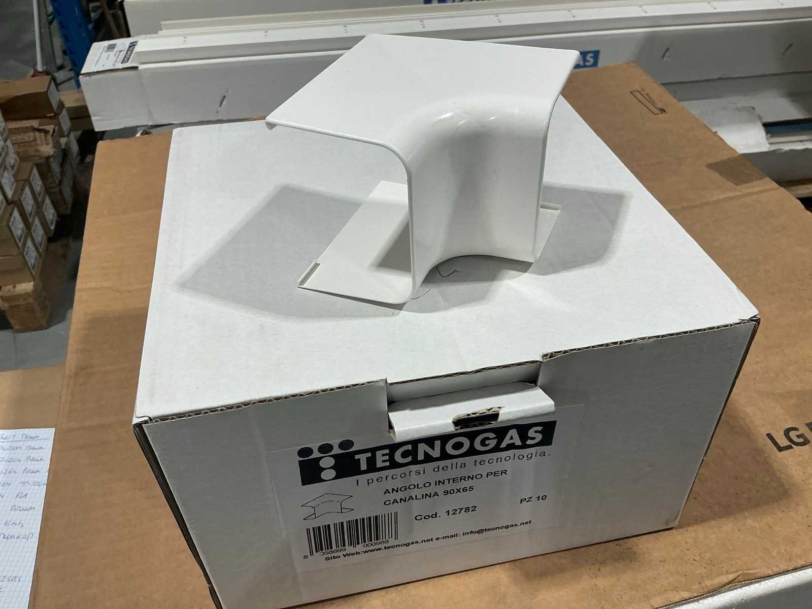 10x25pc’s connectors 11x6pc’s T-Stuk 6x10pc’s externe bocht 11x10pc’s Vlakke bocht 16x10pc’s muurkap 6x10pc’s eindkap 3x10 interne bocht 4x10 muur rosette 8 dozen van 24 meter kabelgoten (12x2meter) Allemaal 90x65 afmeting. Nee Merk: Tecnogas - Maxicool 90x65 Type: Wit