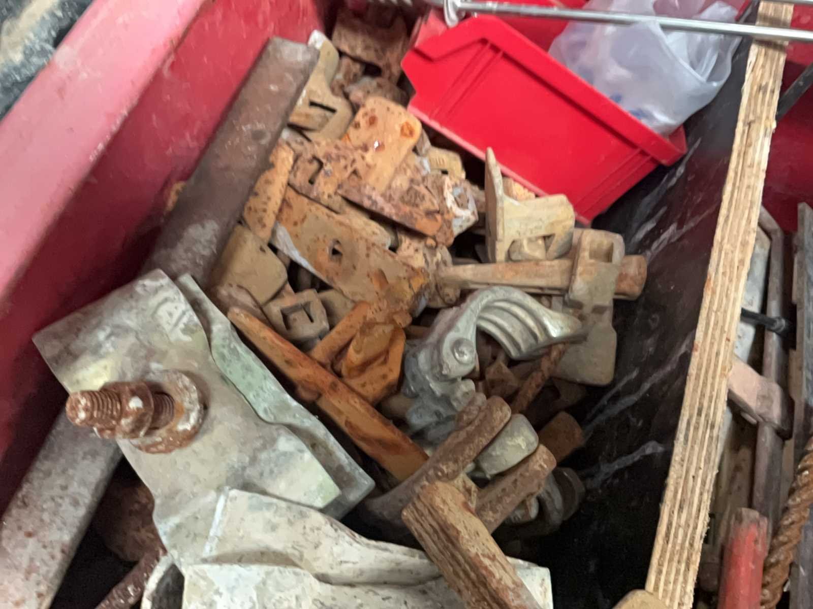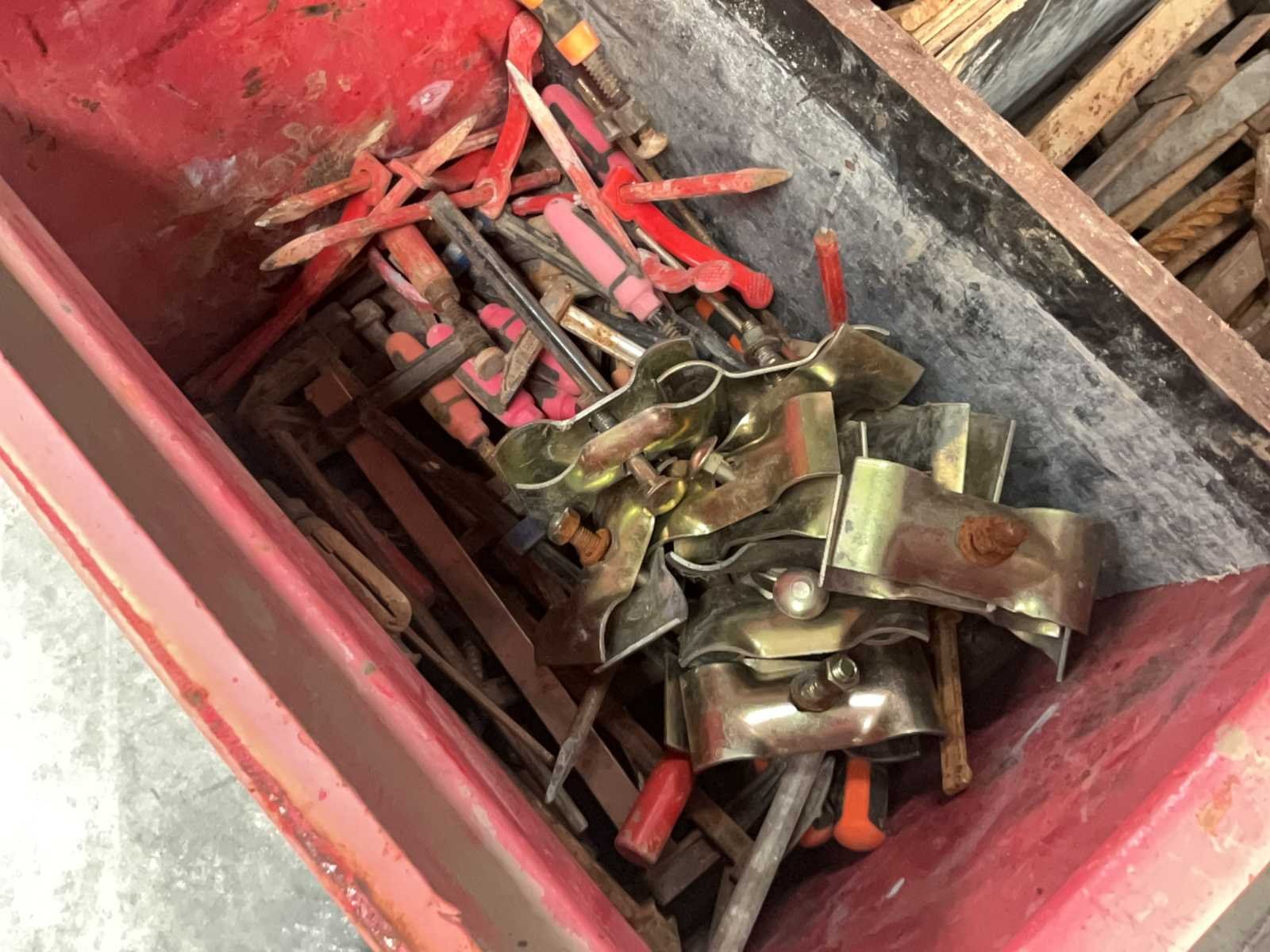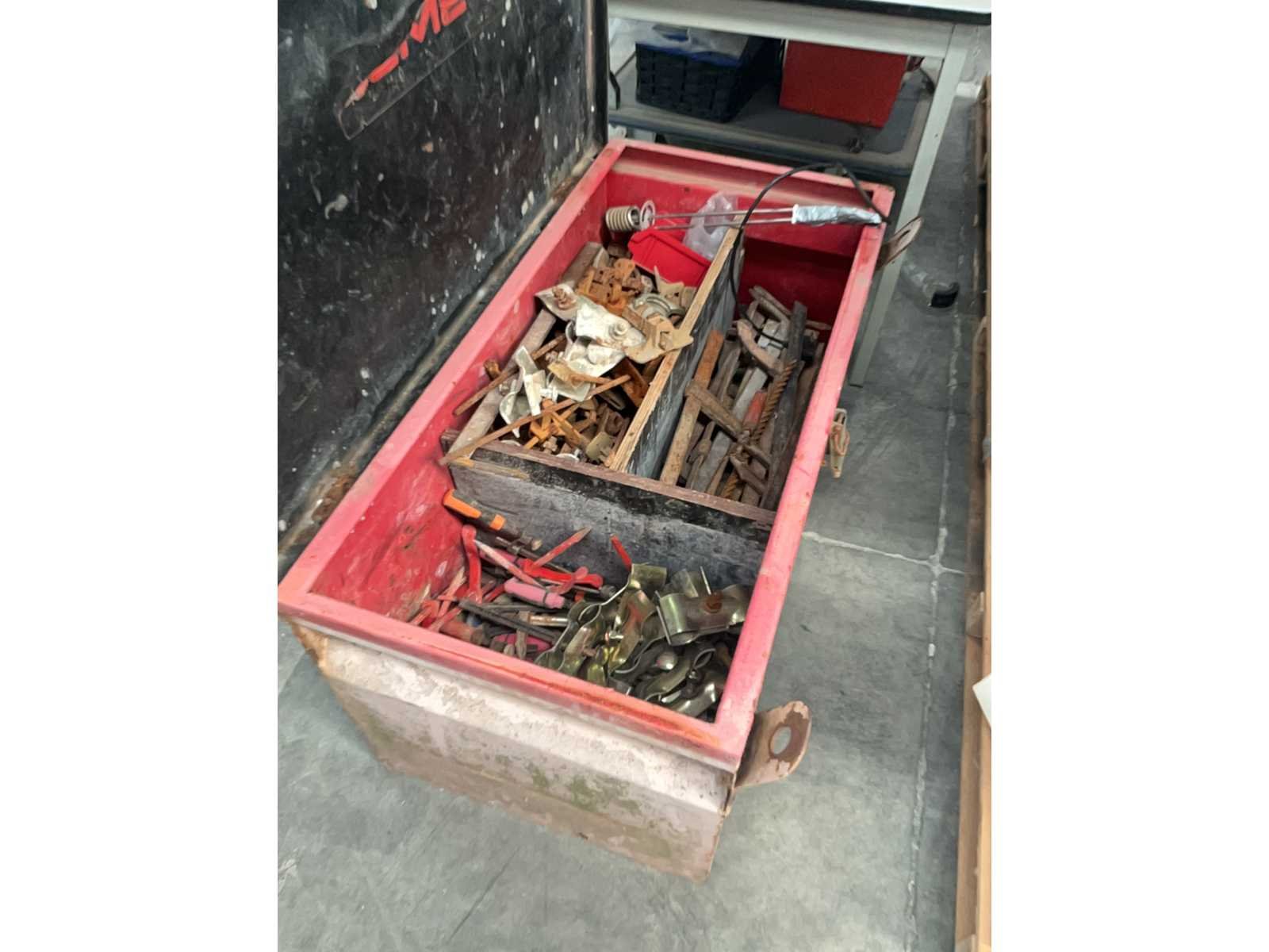 Koffer van circa 100 x 60 x 50 cm hoog, compleet met inhoud waaronder partij diverse verstelbare spanklemmen, steunklemmen, enz. Kofferdeksel voorzien van handvat en koffer met 4 hijsogen. Nee