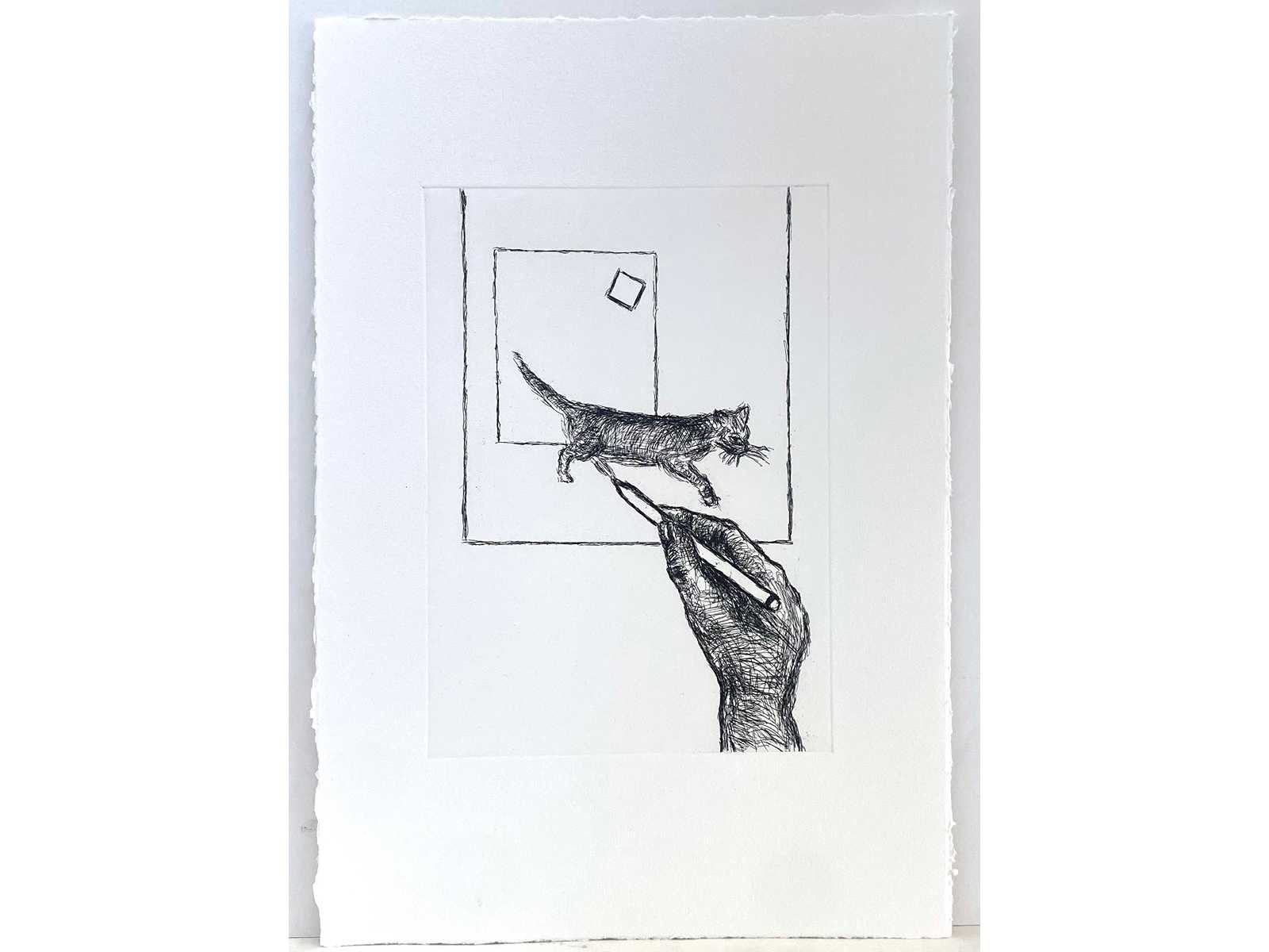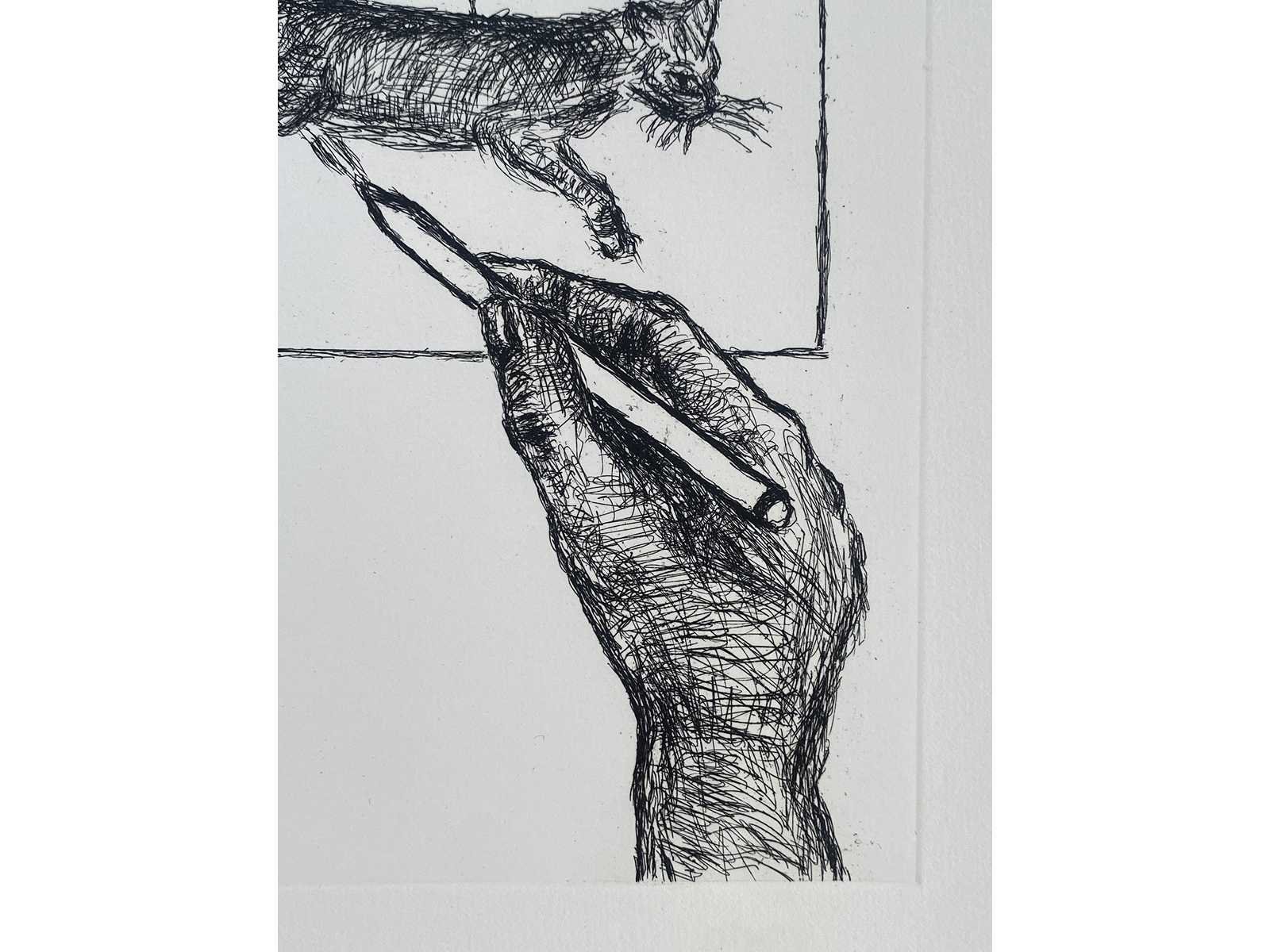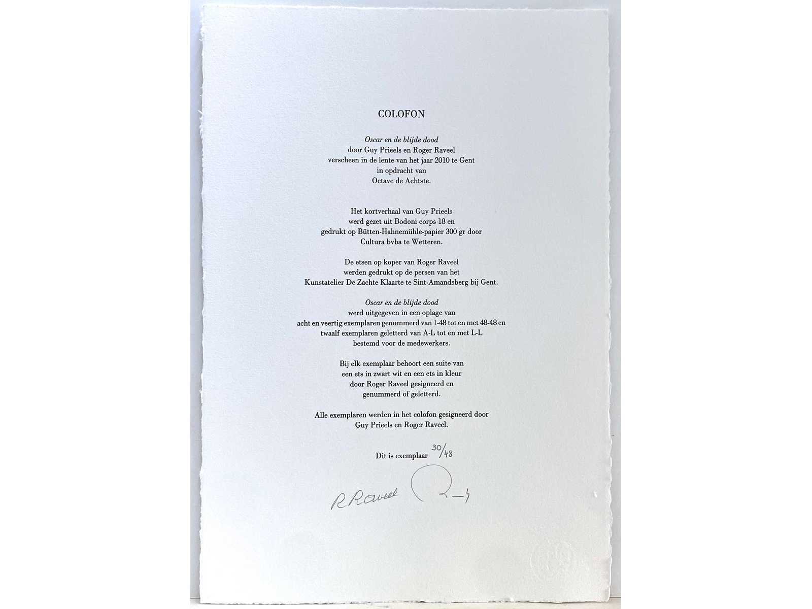 Originele ets op handgeschept papier - afkomstig uit de map 'Oscar en de blijde dood' van 2000 - niet getekend en niet genummerd - uitgegeven door Ergo Pers, Gent - gedrukt door Henri Hemelsoet, Gent - ingelijst - Toegevoegd: Het originele colofon van deze uitgave, gesigneerd door Roger Raveel en Guy Prieels Nee Kunstenaar: Roger Raveel (Machelen-aan-de-Leie, 1921-2013) Titel van werk: Oscar en de blijde dood Periode: 2010 Techniek: Ets Handtekening/oplage: false Hoogte: 36,5cm Breedte: 29cm Hoogte incl. lijst: 43cm Breedte incl. lijst: 33cm Frame: true
