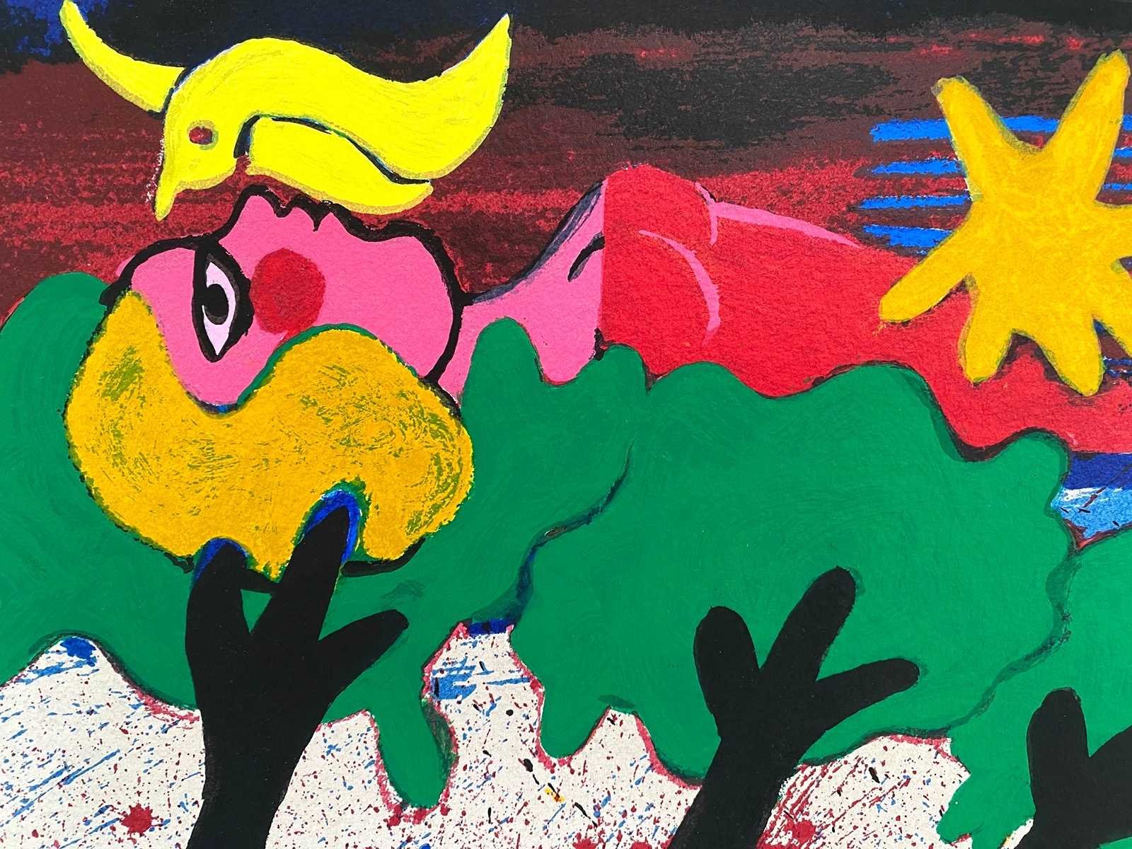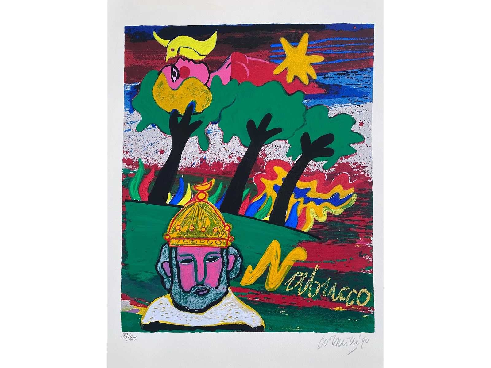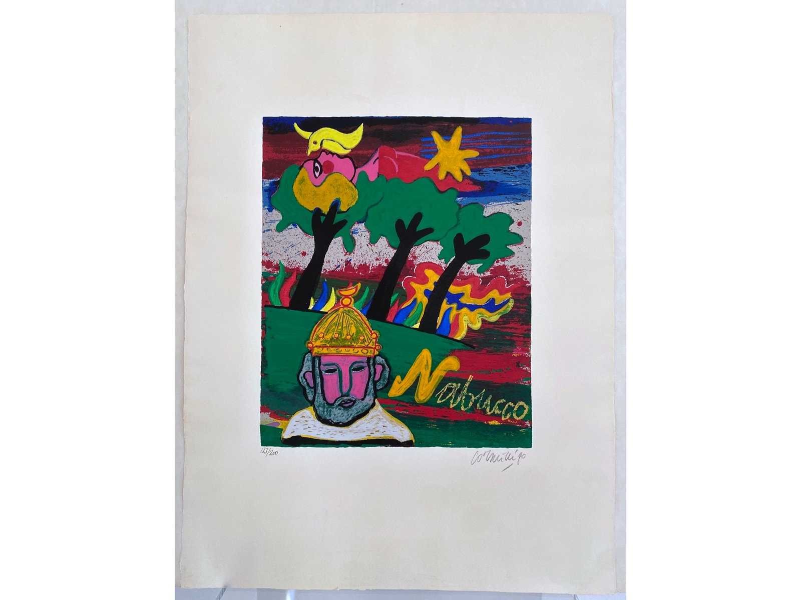 Originele zeefdruk uit de serie Ommagio a. G.Verdi - op Eskulan 300 gr - met watermerk Corneille - uitgever: Jaski Art Productions, Amsterdam Nee Kunstenaar: Guillaume Corneille (1922 – 2010) Titel van werk: Nabucco Datering: 1990 Techniek: Kleurenzeefdruk Handtekening/oplage: true Oplage: 123/200 Gesigneerd: Gesigneerd en genummerd Hoogte: 75,5cm Breedte: 56cm Frame: false