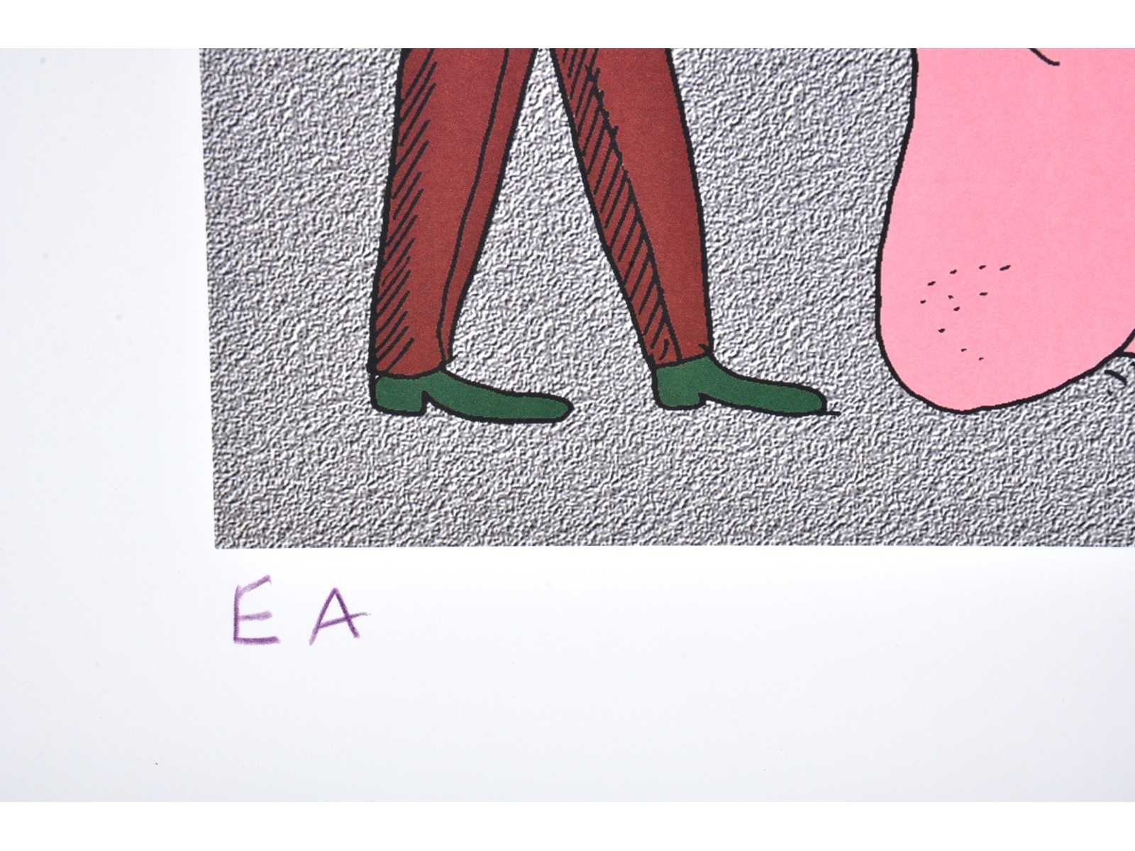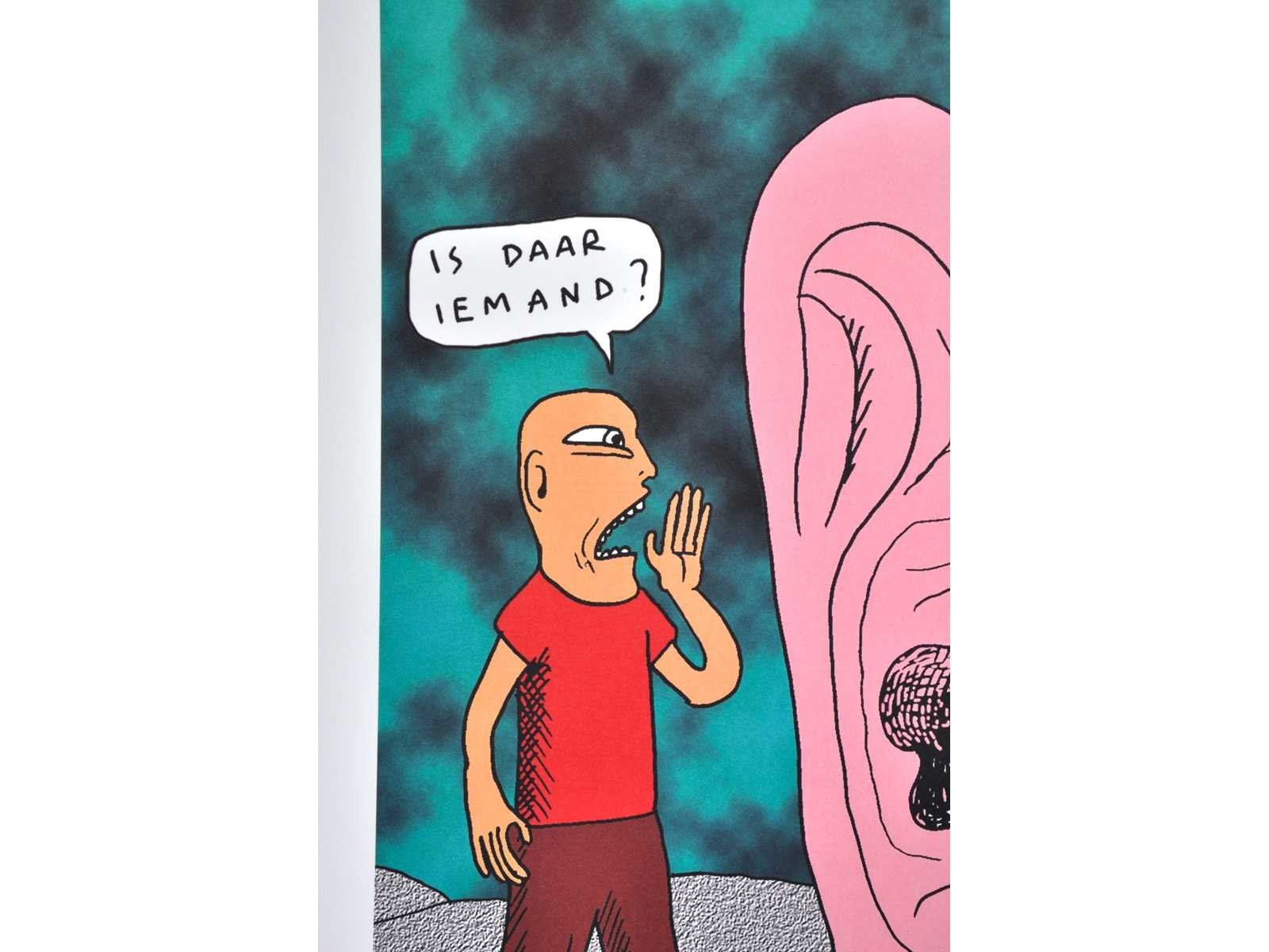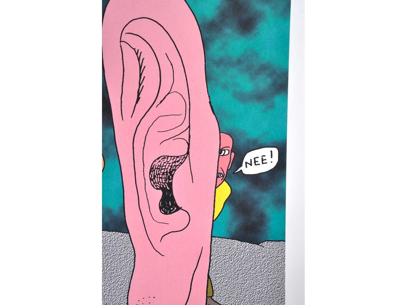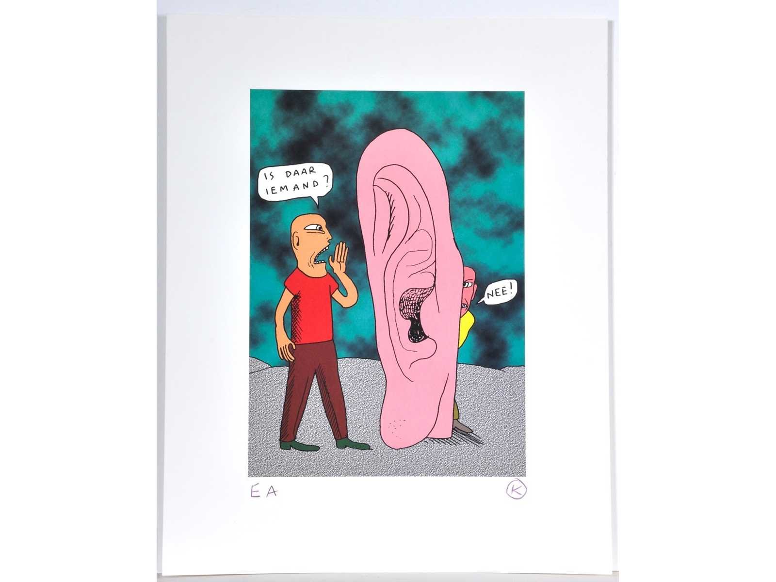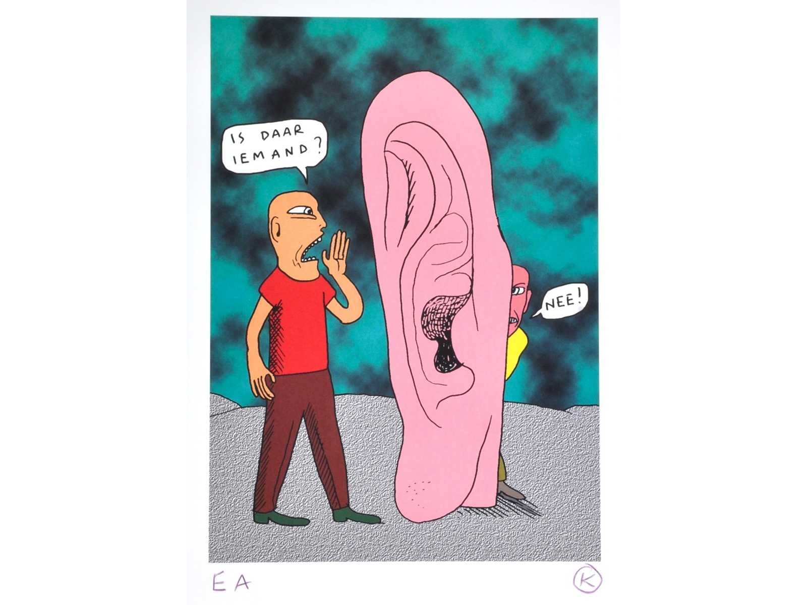 Nee Kunstenaar: Kamagurka (Nieuwpoort 1956) Titel van werk: Is daar iemand? Techniek: zeefdruk Handtekening/oplage: true Oplage: E/A (épreuve d'artiste) Gesigneerd: Gesigneerd Hoogte: 50cm Breedte: 40cm Frame: false