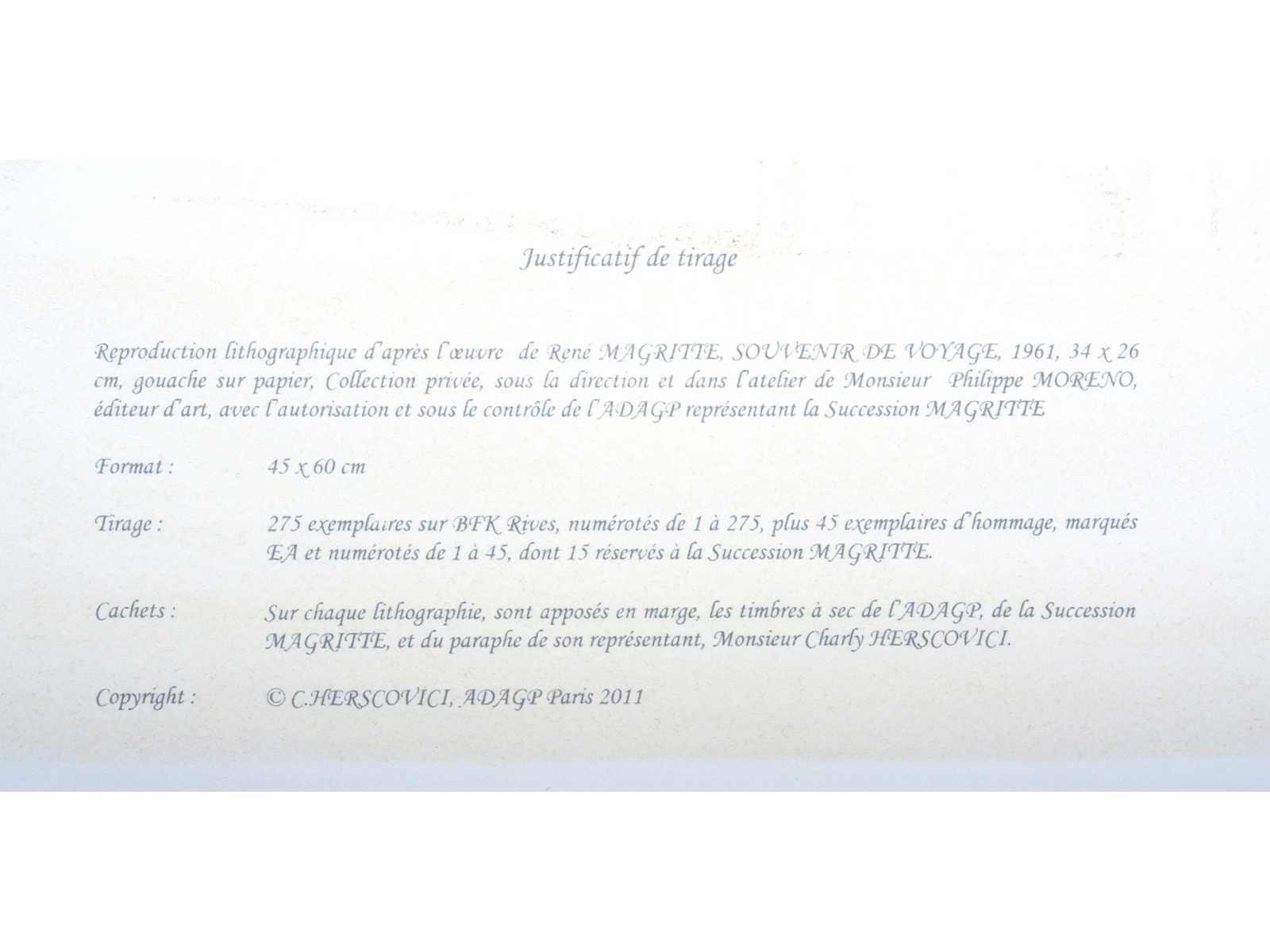 Lithografie naar het werk van René Magritte 'Souvenir de voyage’ uit 1961 - Voorzien van de droogsptempel van ADAGP en van de Succession Magritte alsook de paraf van Charly Herscovice Nee Kunstenaar: (naar) René Magritte (1898 - 1967) Titel van werk: Souvenir de voyage Techniek: Lithografie Handtekening/oplage: false Oplage: 162/275 Hoogte: 60cm Breedte: 45cm Frame: true