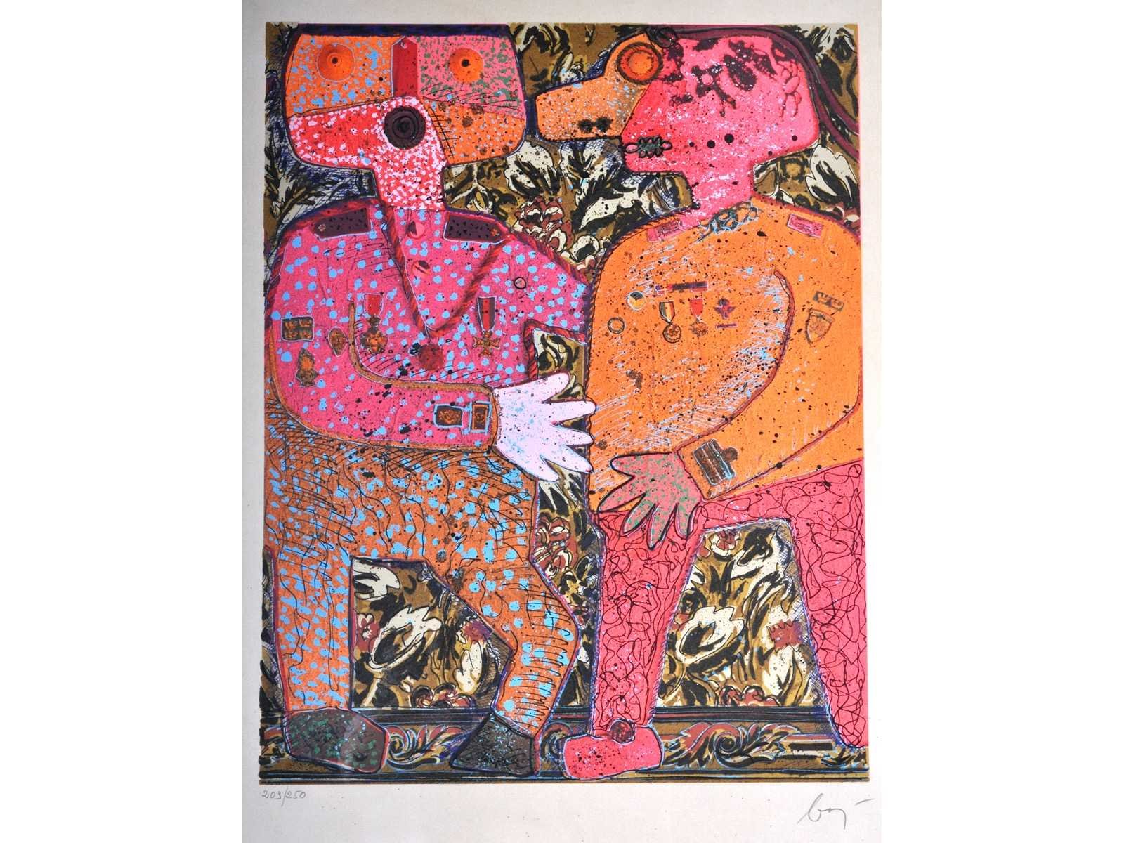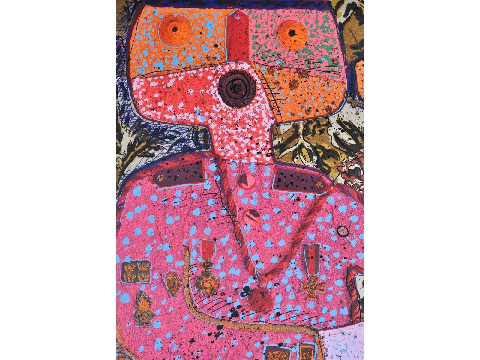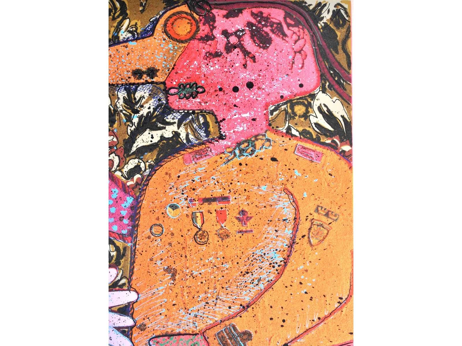Nee Kunstenaar: Enrico Baj Titel van werk: Top Secret Techniek: gemengde techniek: zeefdruk, vlokken, glitter & gekleurd poeder Handtekening/oplage: true Oplage: 209/250 Gesigneerd: Gesigneerd en genummerd Hoogte incl. lijst: 100cm Breedte incl. lijst: 70cm Frame: true Literatuur: “Baj. Catalogo generale delle edizioni originali”, pag. 119 num. 383
