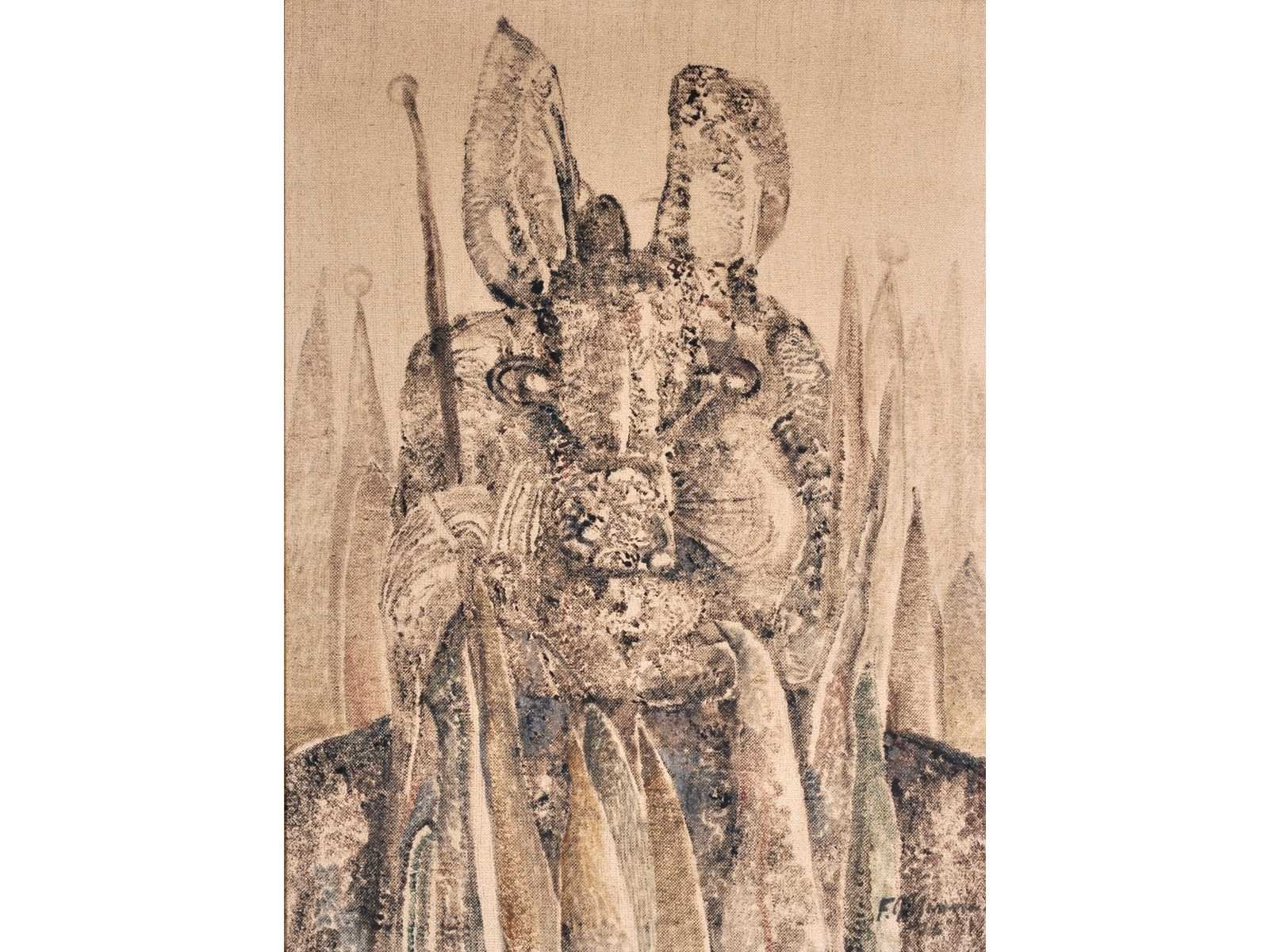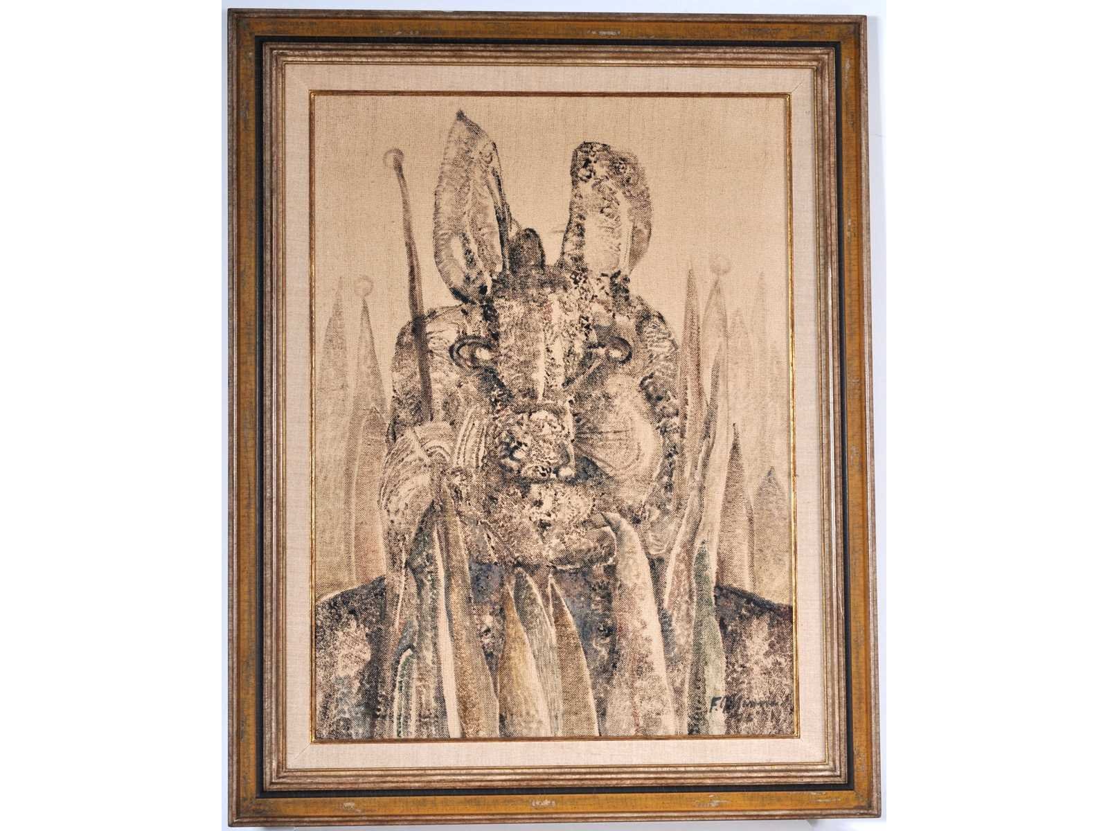 In de jaren zeventig was Minnaert laureaat van de Prijs voor Tekenkunst van Kortenberg, van de Prijs Jonge kunstenaars op de Internationale Kunstmesse van Bazel(Zwitserland) en van de Grafiekprijs van Diano Marina(Italie). In 1974 was hij geselecteerd voor de Biënnale van Venetië met de polyptiek “Genesis”. Het oeuvre van Frans Minnaert bevindt zich in tal van musea en collecties, nationaal en internationaal. Nee Kunstenaar: Frans MINNAERT (Idegem 1929 - 2011) Datering: 1973 Techniek: gemende techniek op doek Handtekening/oplage: true Oplage: Origineel Gesigneerd: Gesigneerd Hoogte: 81cm Breedte: 60cm Hoogte incl. lijst: 100cm Breedte incl. lijst: 80cm Frame: true