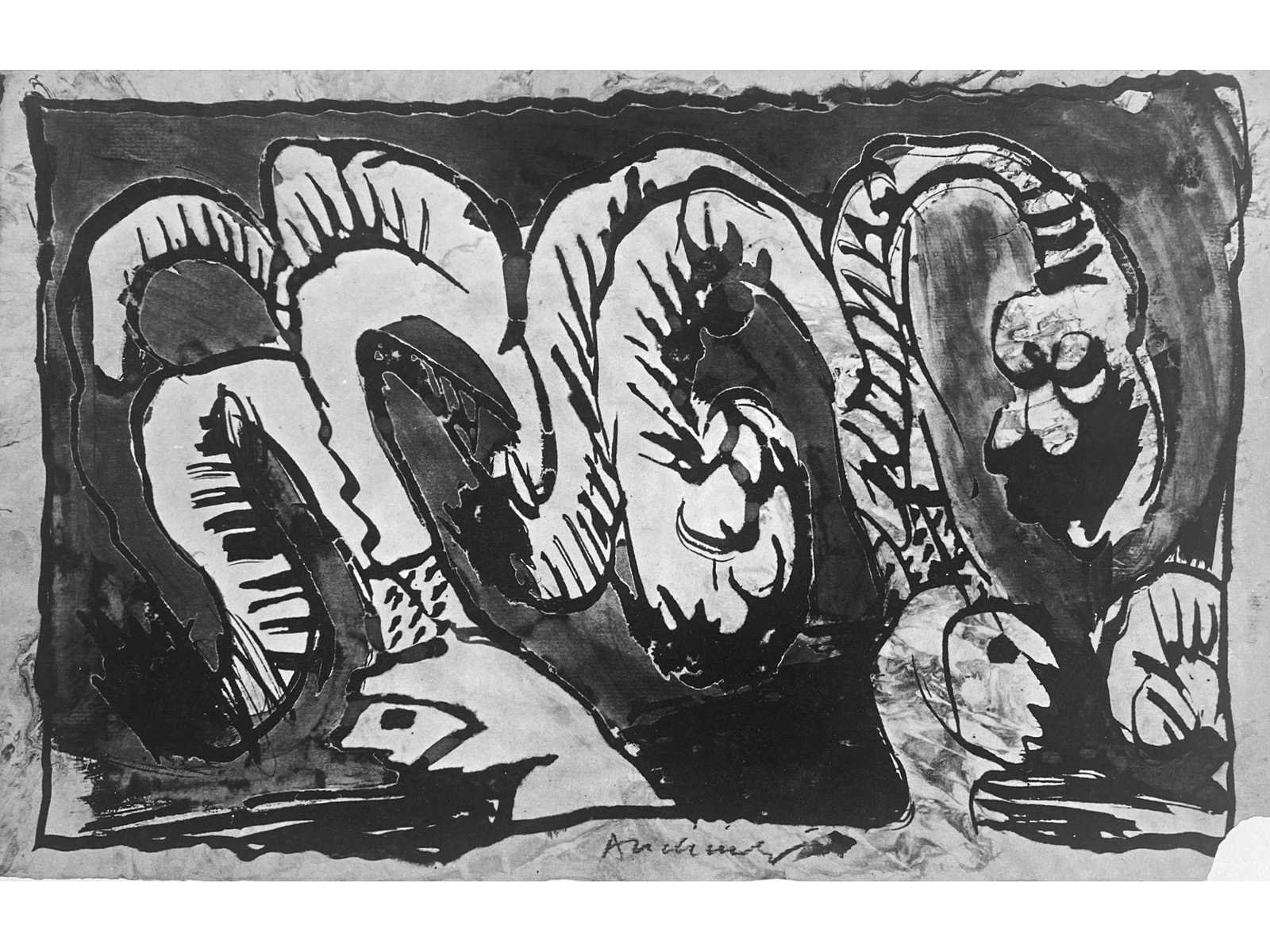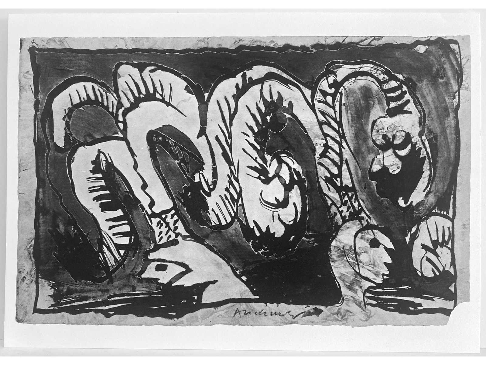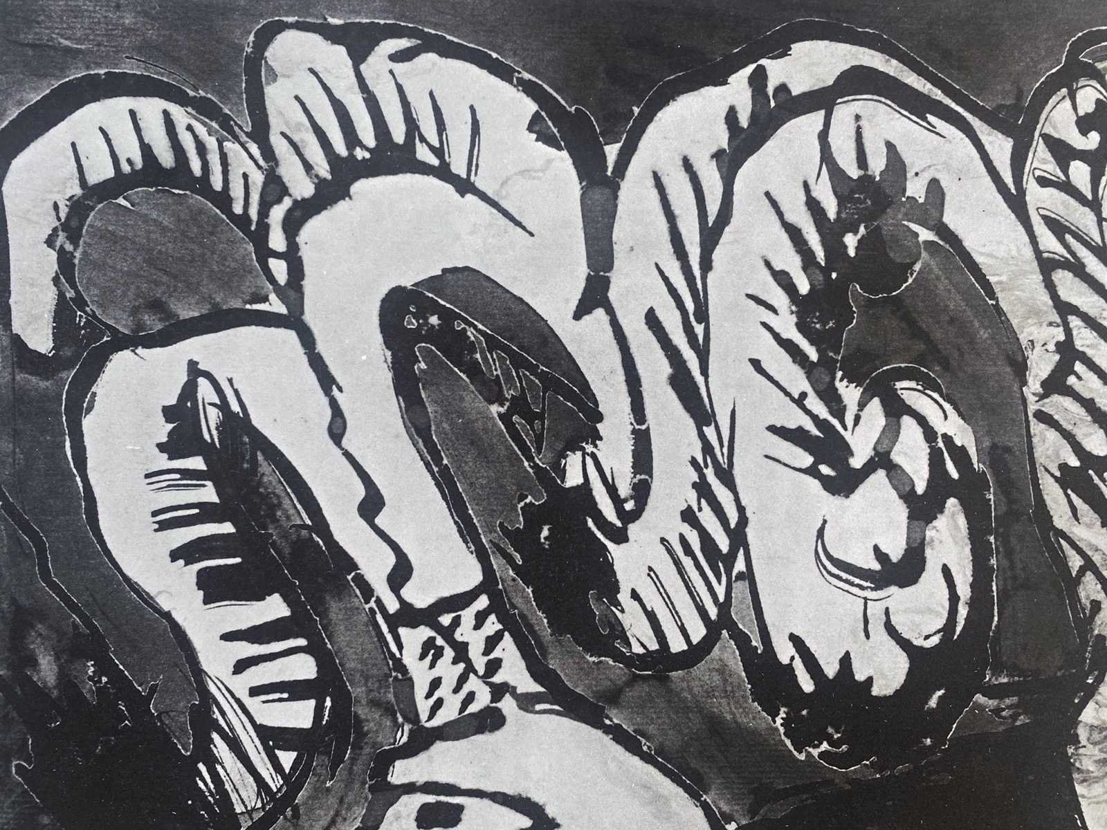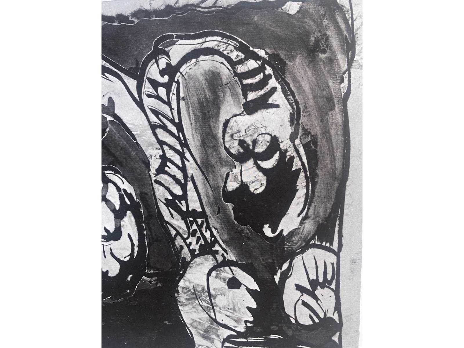 Getekend in de plaat - naar gelijknamig origineel werk van 1967 - afkomstig uit de map 'Hedendaagse Belgische tekenaars' Nee Kunstenaar: Pierre Alechinsky (Brussel, 1927) Titel van werk: A propos de Binche Periode: 1977 Techniek: Offset Handtekening/oplage: false Hoogte: 45cm Breedte: 33cm Frame: false