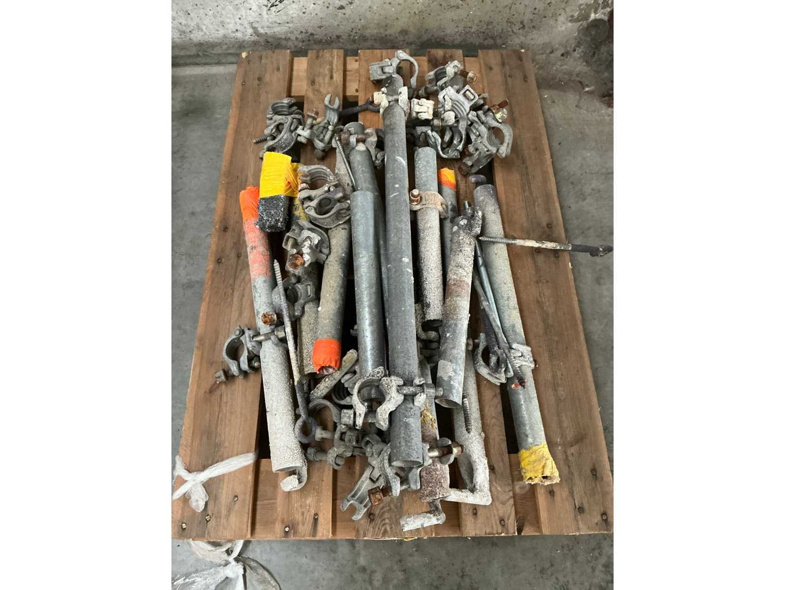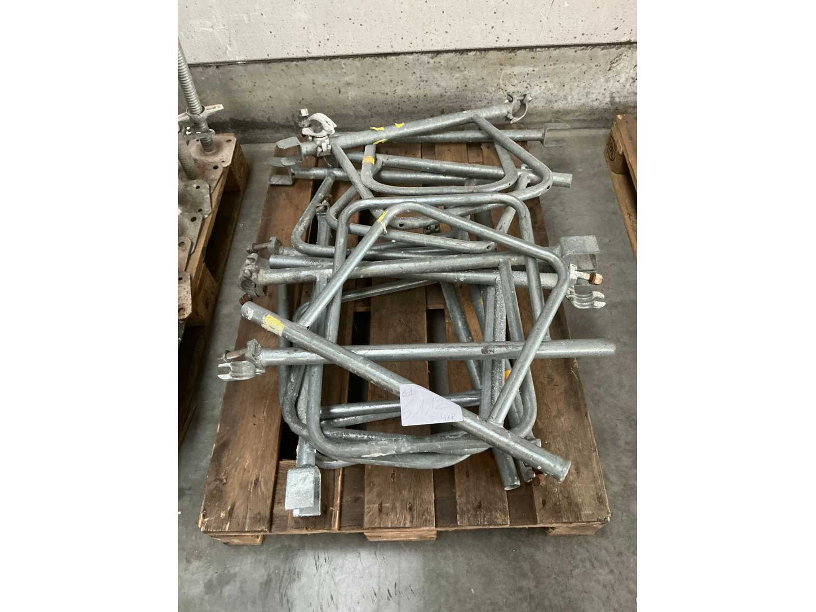 Waaronder valbeveiliging, uitzetframes/ondersteuningsdriehoeken, verbindingbuizen en verlengstukken. Liggende op 4x pallet. No
