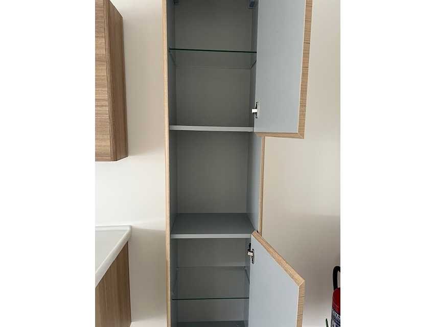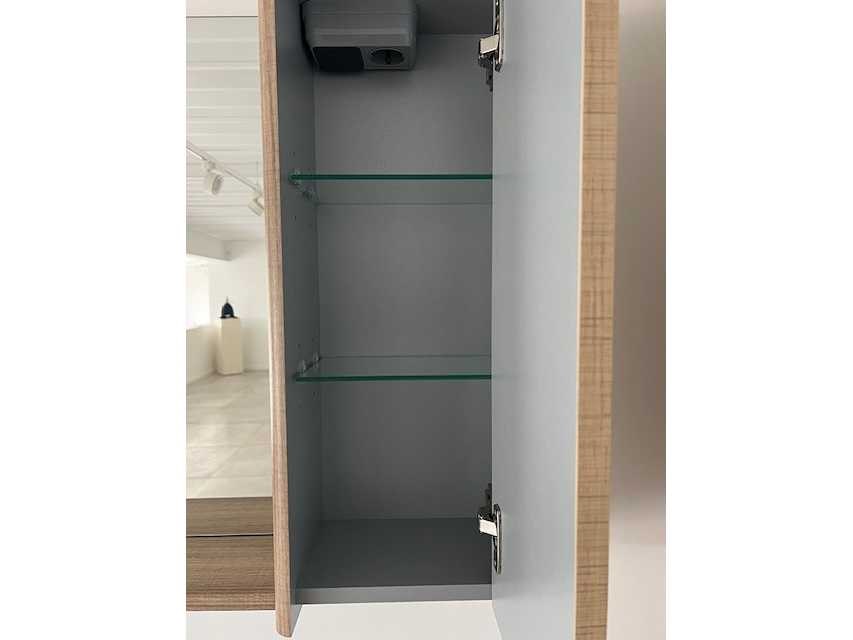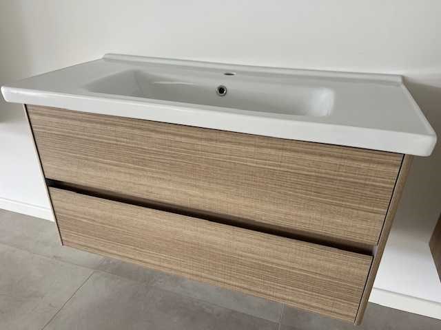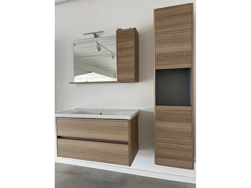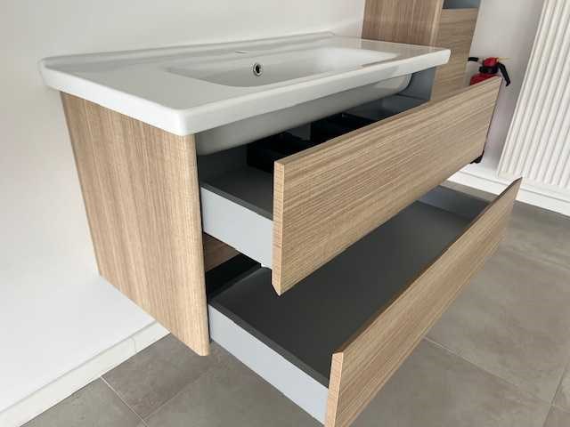 100 cm, keramische wastafel, 2 lades, spiegel met kast en licht, zijkast (168x40 cm) No Hoogte: 54cm Lengte: 100cm Breedte: 45cm Kleur: oak Wastafel: Keramisch Spiegelkast: true Spiegel: ja Spiegel met verlichting: led Verlichting: led Lades: 2 Softclose: true Bevestigingsmateriaal: true Zijkast: ja