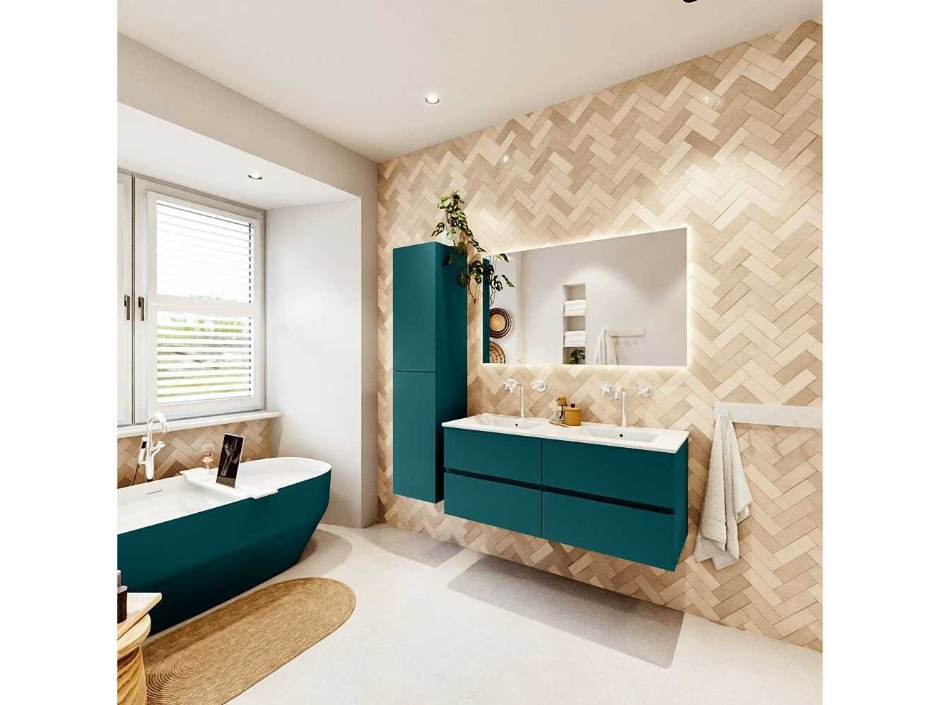 Badkamerkast met dubbele keramische wastafel, 120cm, 4 lades, softclose (alleen kast en waskom inbegrepen) No Kleur: smaragd Lengte: 120cm Breedte: 45cm Hoogte: 50cm