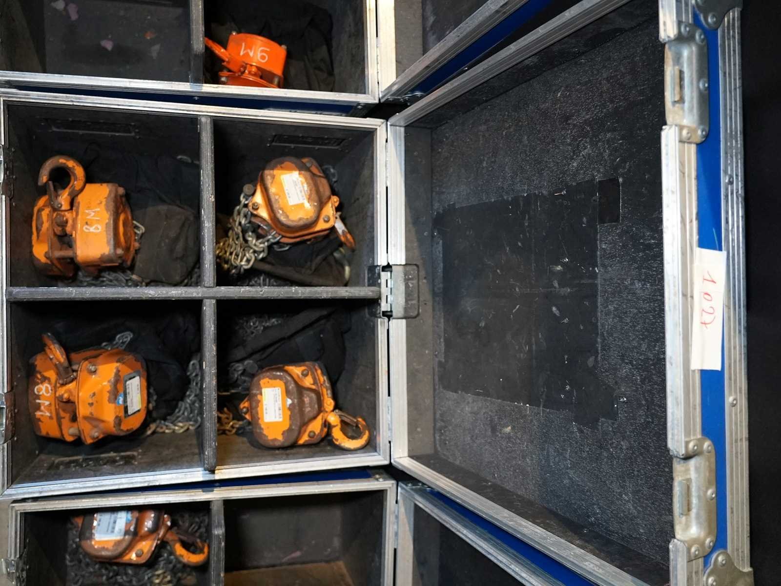 4 x Hand chain hoist 8m chain / 500kg + flightcase • Model: Liftikus CHD • Capacity: 500 kg • Chain length: 8 m lifting height • Operation: manual / hand-chain driven • Hooks: swivel safety hooks • Chainbag included (empty bag only) • Construction: heavy-duty steel housing • Included: unit as described • Included: flightcase for the complete set No Merk: LIFTIKUS Handbediend: true