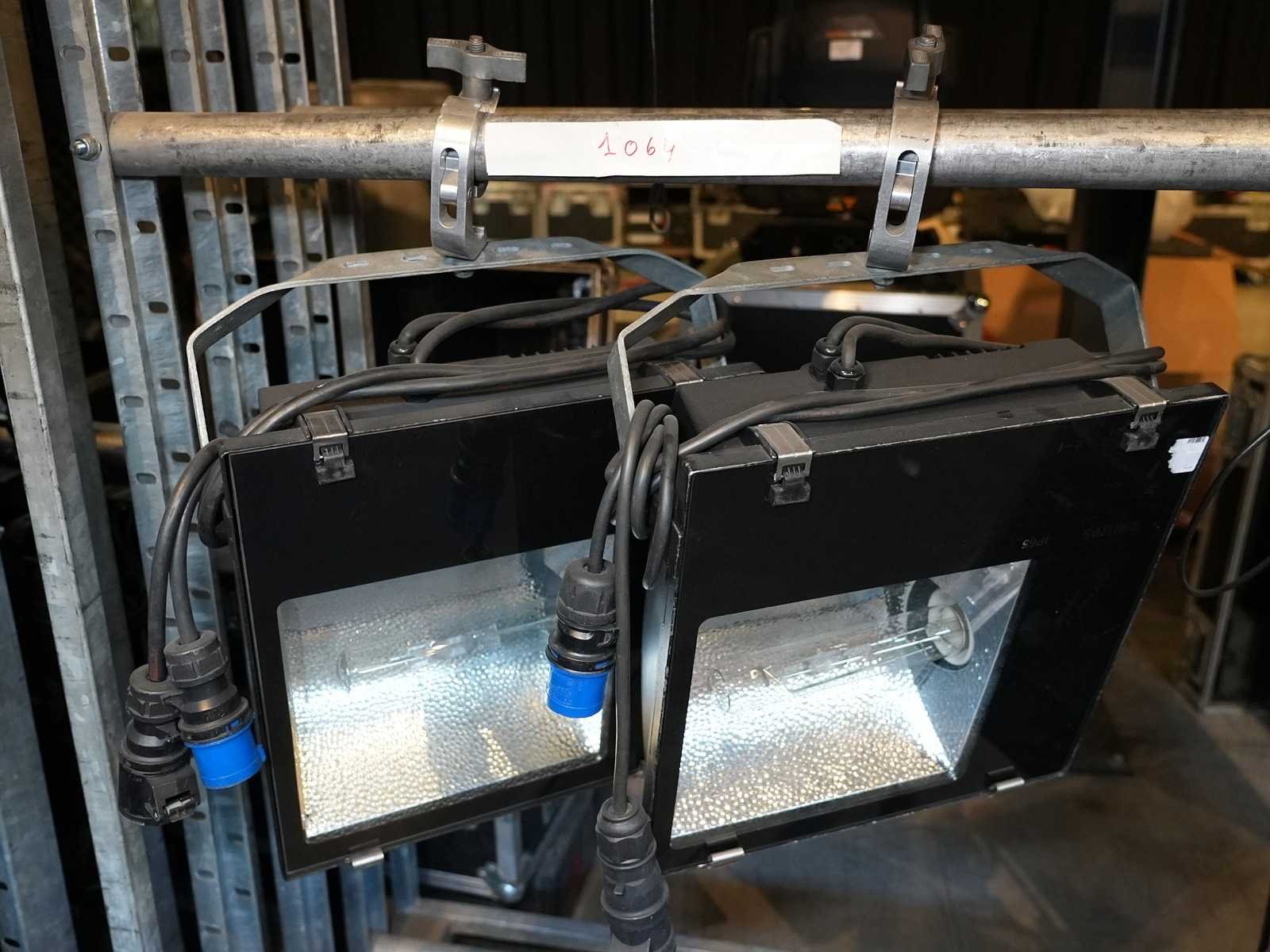 FLOODLIGHT – ASYMMETRIC HQI 400 TS (PHILIPS) – SET OF 2 PCS • Type: asymmetric floodlight • Quantity: set of 2 pcs (2 × HQI units) • Light source: HQI 400 W (single-ended) • Colour temperature: 4000 K • Power supply: 230 V AC – 50 Hz • Power consumption: 400 W • Starting current: 3.1 A max • Warm-up time: ~5 min • Hot restart time: ~10 min • Socket: E40 • Housing: die-cast aluminium, black finish • IP rating: IP65 (outdoor rated) • Dimensions: 450 × 465 × 170 mm • Included: set of 2 units No Merk: PHILIPS Eigen gewicht: 6.5kg